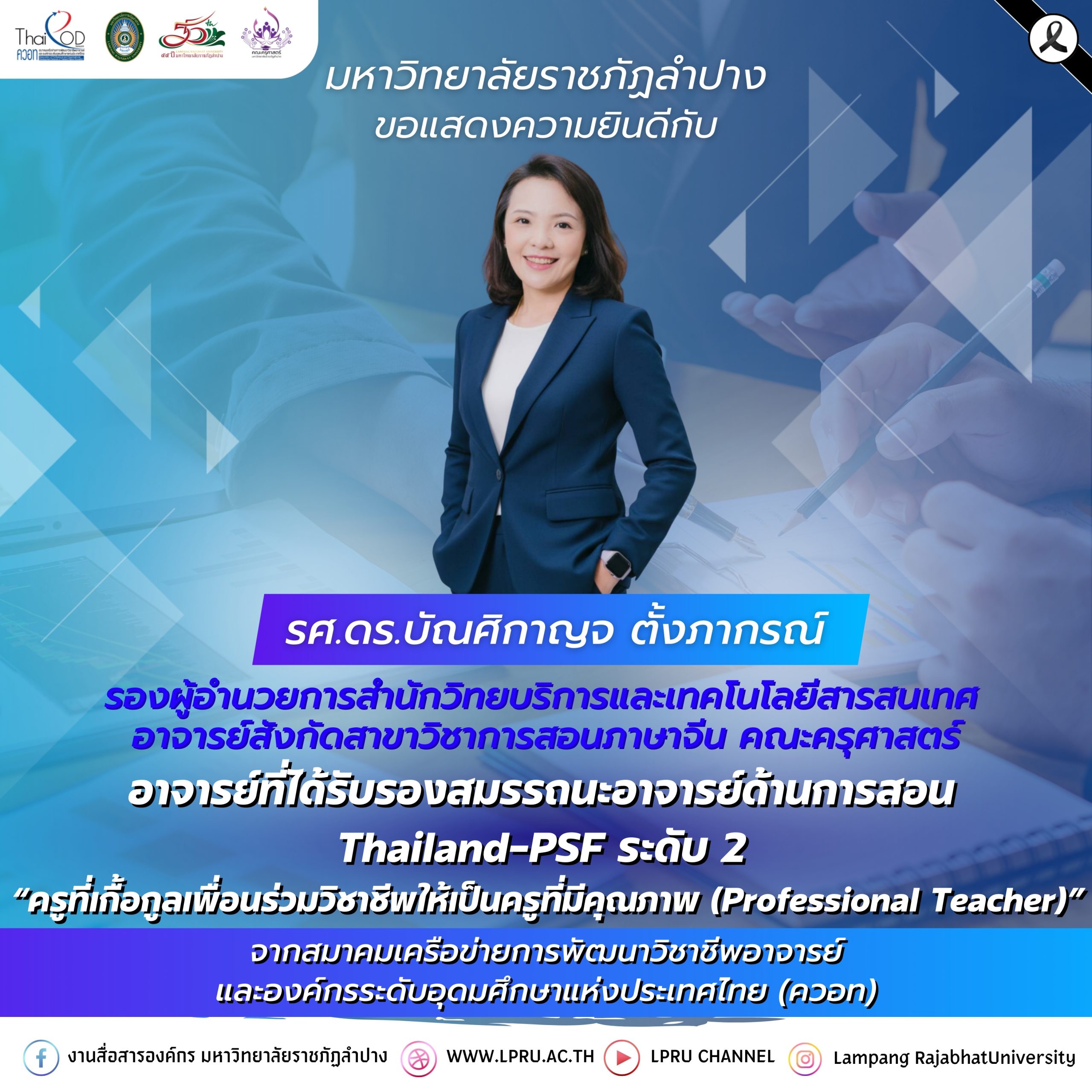 มหาวิทยาลัยราชภัฏลำปาง ขอแสดงความยินดีกับ รศ.ดร.บัณศิกาญจ ตั้งภากรณ์