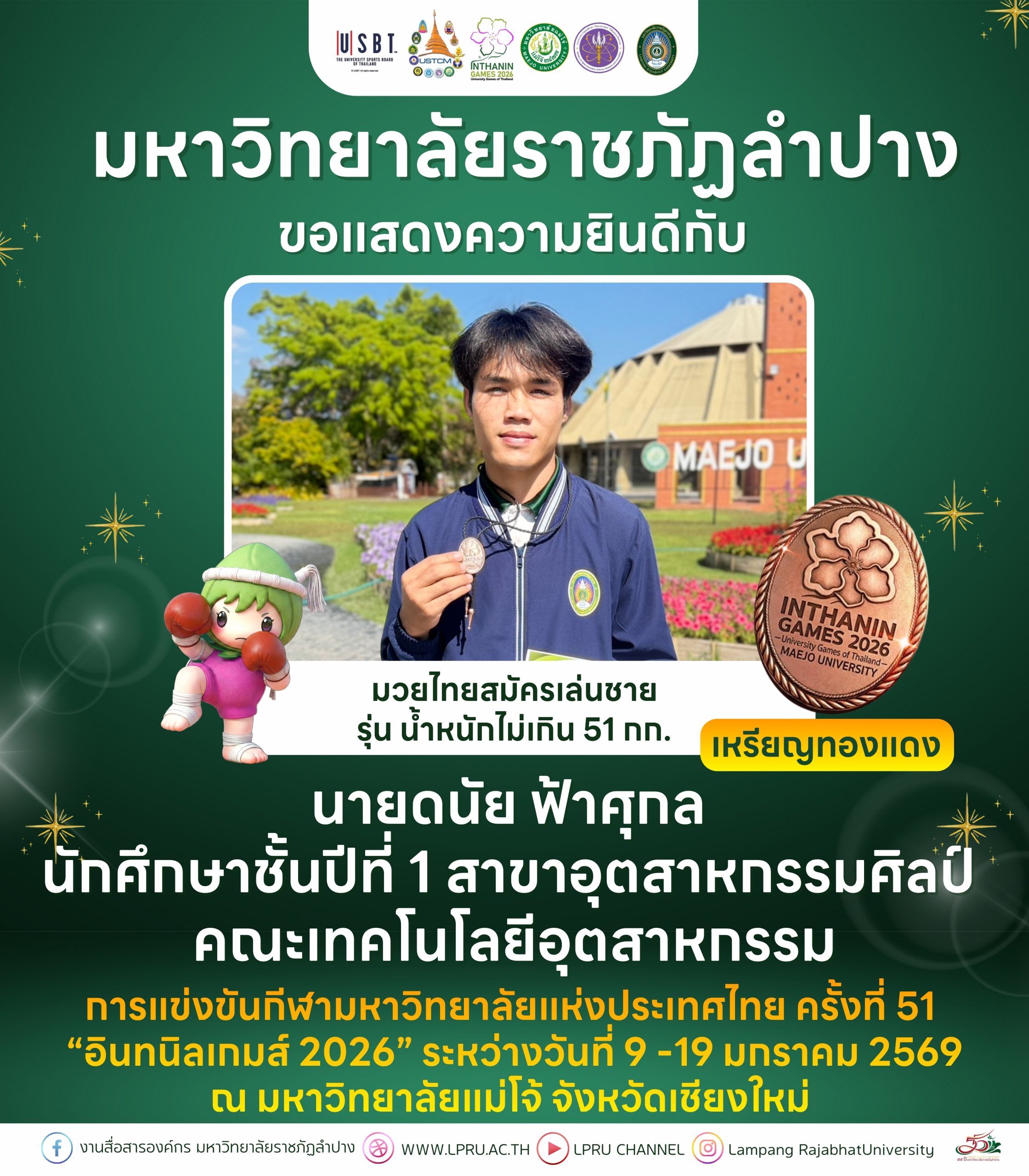 มหาวิทยาลัยราชภัฏลำปาง ขอแสดงความยินดีกับ นายดนัย ฟ้าศุกล นักศึกษาชั้นปีที่ 1 สาขาวิชาอุตสาหกรรมศิลป์คณะเทคโนโลยีอุตสาหกรรม