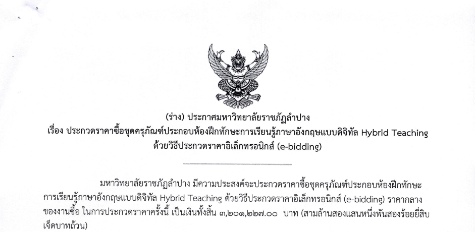 ร่าง ประกาศประกวดราคาซื้อชุดครุภัณฑ์ประกอบห้องฝึกทักษะการเรียนรู้ภาษาอังกฤษแบบดิจิทัล Hybrid Teaching