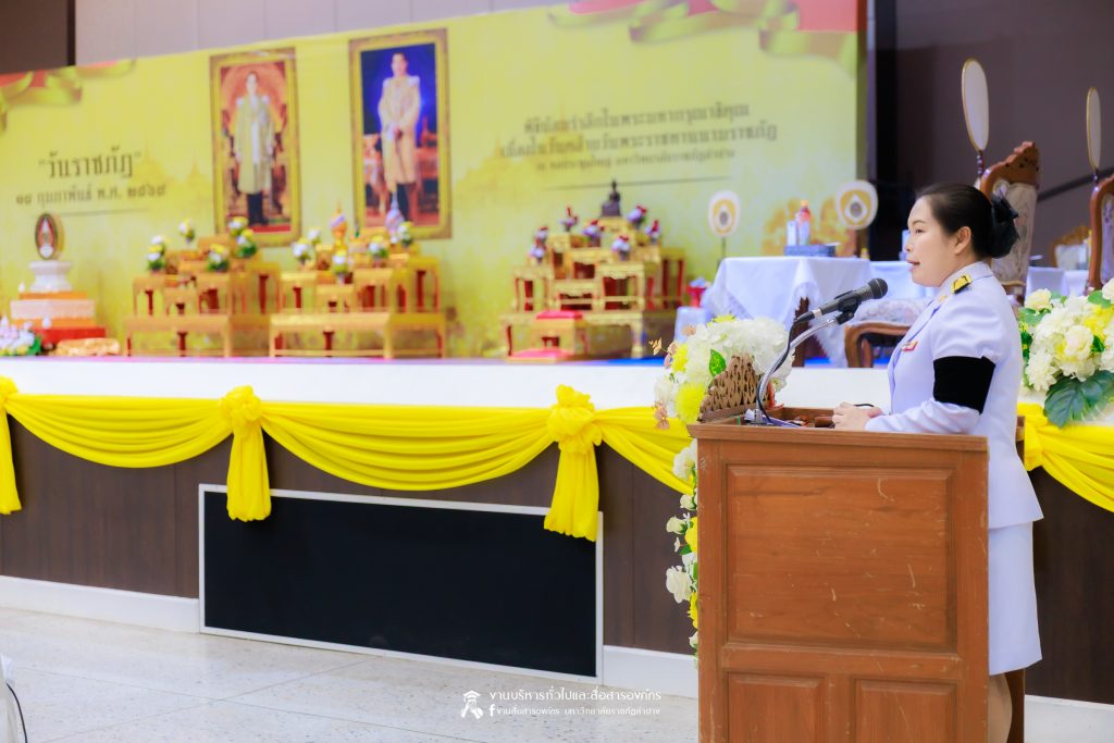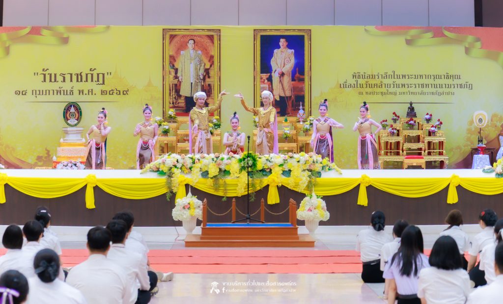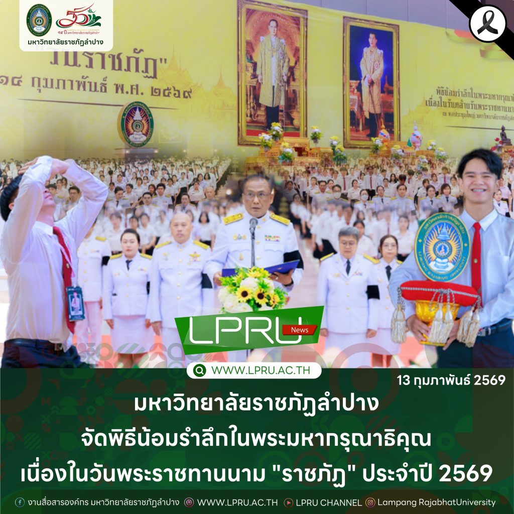เมื่อวันที่ 13 กุมภาพันธ์ 2569 มหาวิทยาลัยราชภัฏลำปาง จัดพิธีเจริญพระพุทธมนต์ เพื่อถวายเป็นพระราชกุศล และพิธีน้อมรำลึกในพระมหากรุณาธิคุณ เนื่องในวันคล้ายวันพระราชทานนาม “ราชภัฏ” 14 กุมภาพันธ์ ณ หอประชุมใหญ่ มหาวิทยาลัยราชภัฏลำปาง โดย รศ.ดร.กิตติศักดิ์ สมุทธารักษ์ อธิการบดีมหาวิทยาลัยราชภัฏลำปาง เป็นประธานในพิธี พร้อมนำคณะผู้บริหาร คณาจารย์ บุคลากร และนักศึกษา กล่าวสำนึกในพระมหากรุณาธิคุณอันหาที่สุดมิได้ และนำผู้เข้าร่วมพิธี ร่วมถวายบังคมเบื้องหน้าพระบรมฉายาลักษณ์พระบาทสมเด็จพระบรมชนกาธิเบศร มหาภูมิพลอดุลยเดชมหาราช บรมนาถบพิตร และพระบาทสมเด็จพระปรเมนทรรามาธิบดีศรีสินทรมหาวชิราลงกรณ พระวชิรเกล้าเจ้าอยู่หัว โดยได้รับเมตตาจากพระวิสุทธิธรรมพิลาส (คูณสมบูรณ์ สิริธมฺมชโย) เจ้าอาวาสวัดต้นธงชัย อ.เมืองลำปาง รองเจ้าคณะจังหวัดลำปาง เป็นประธานฝ่ายสงฆ์ ในพิธีเจริญพระพุทธมนต์ โดยมีผู้บริหาร คณาจารย์ บุคลากร และนักศึกษาเข้าร่วมกิจกรรมกว่า 1,000 คน ในการนี้ ได้มีพิธีมอบเสื้อสามารถแก่บุคคลภายนอก ที่สร้างผลงานด้านกีฬาให้กับมหาวิทยาลัย จำนวน 2 ราย ประกอบด้วย นายพิพัฒน์ ใบกุหลาบ ผู้จัดการทีม และผู้ฝึกสอนกีฬากรีฑา และนายเรืองศักดิ์ ศรีวรกุลวงศ์ ผู้ฝึกสอนกีฬามวย