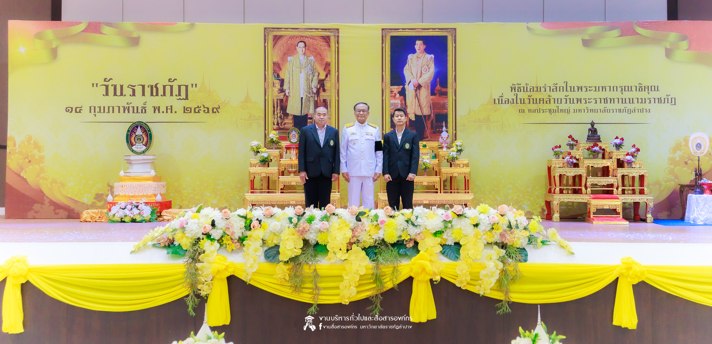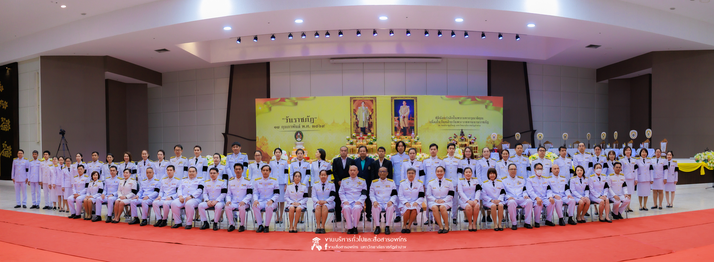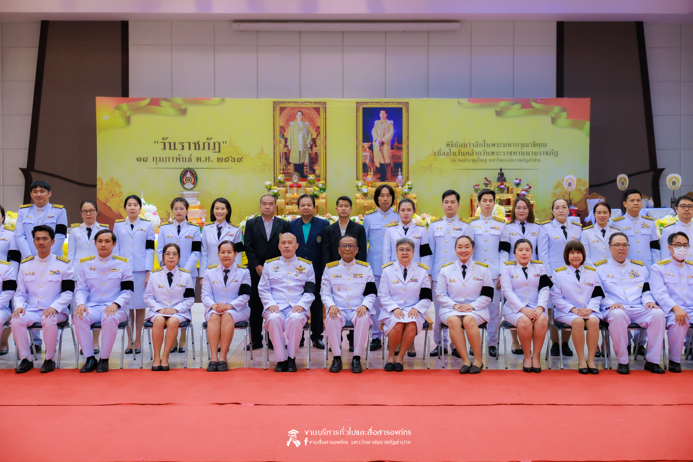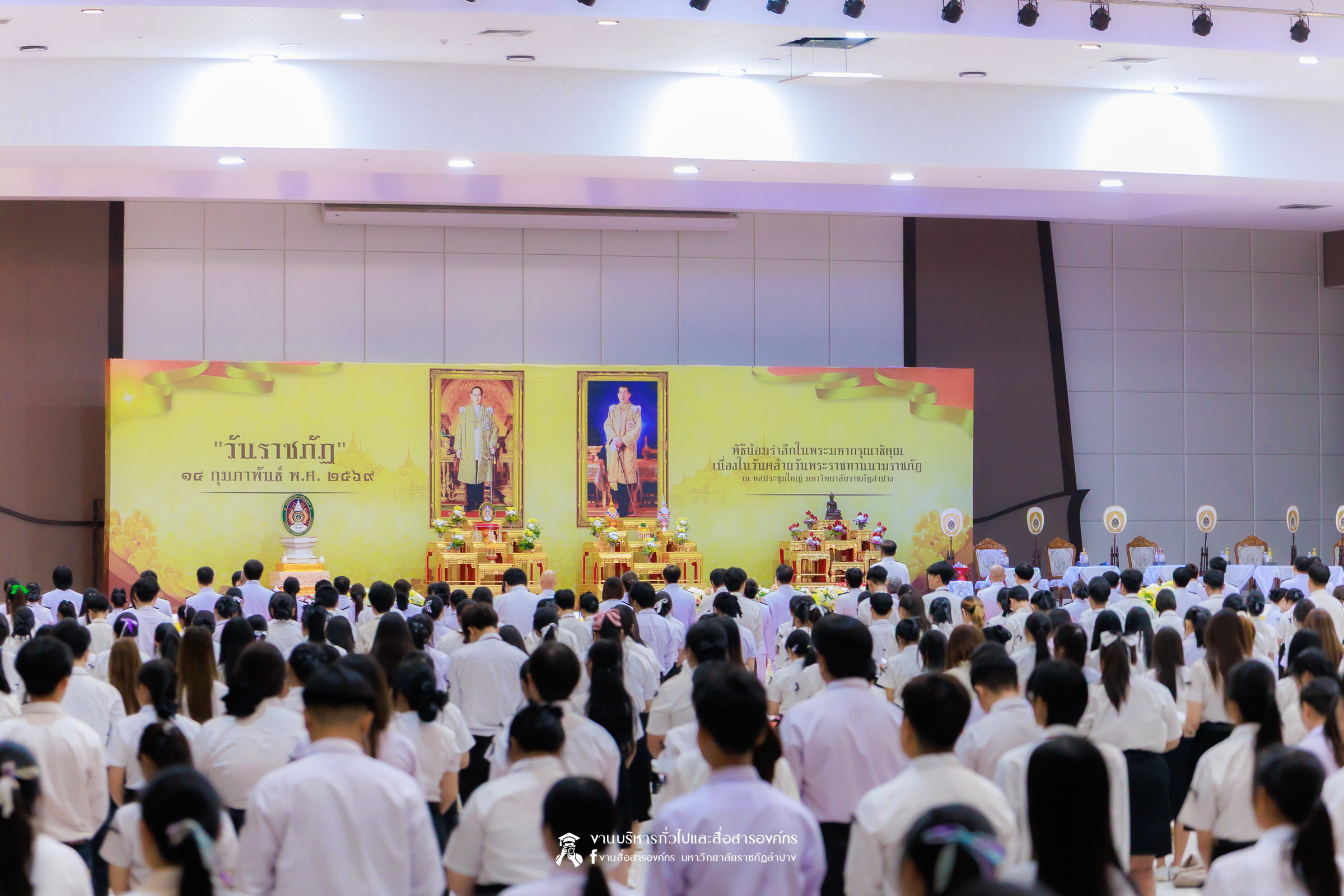 เมื่อวันที่ 13 กุมภาพันธ์ 2569 มหาวิทยาลัยราชภัฏลำปาง จัดพิธีเจริญพระพุทธมนต์ เพื่อถวายเป็นพระราชกุศล และพิธีน้อมรำลึกในพระมหากรุณาธิคุณ เนื่องในวันคล้ายวันพระราชทานนาม “ราชภัฏ” 14 กุมภาพันธ์ ณ หอประชุมใหญ่ มหาวิทยาลัยราชภัฏลำปาง โดย รศ.ดร.กิตติศักดิ์ สมุทธารักษ์ อธิการบดีมหาวิทยาลัยราชภัฏลำปาง เป็นประธานในพิธี พร้อมนำคณะผู้บริหาร คณาจารย์ บุคลากร และนักศึกษา กล่าวสำนึกในพระมหากรุณาธิคุณอันหาที่สุดมิได้ และนำผู้เข้าร่วมพิธี ร่วมถวายบังคมเบื้องหน้าพระบรมฉายาลักษณ์พระบาทสมเด็จพระบรมชนกาธิเบศร มหาภูมิพลอดุลยเดชมหาราช บรมนาถบพิตร และพระบาทสมเด็จพระปรเมนทรรามาธิบดีศรีสินทรมหาวชิราลงกรณ พระวชิรเกล้าเจ้าอยู่หัว โดยได้รับเมตตาจากพระวิสุทธิธรรมพิลาส (คูณสมบูรณ์ สิริธมฺมชโย) เจ้าอาวาสวัดต้นธงชัย อ.เมืองลำปาง รองเจ้าคณะจังหวัดลำปาง เป็นประธานฝ่ายสงฆ์ ในพิธีเจริญพระพุทธมนต์ โดยมีผู้บริหาร คณาจารย์ บุคลากร และนักศึกษาเข้าร่วมกิจกรรมกว่า 1,000 คน ในการนี้ ได้มีพิธีมอบเสื้อสามารถแก่บุคคลภายนอก ที่สร้างผลงานด้านกีฬาให้กับมหาวิทยาลัย จำนวน 2 ราย ประกอบด้วย นายพิพัฒน์ ใบกุหลาบ ผู้จัดการทีม และผู้ฝึกสอนกีฬากรีฑา และนายเรืองศักดิ์ ศรีวรกุลวงศ์ ผู้ฝึกสอนกีฬามวย