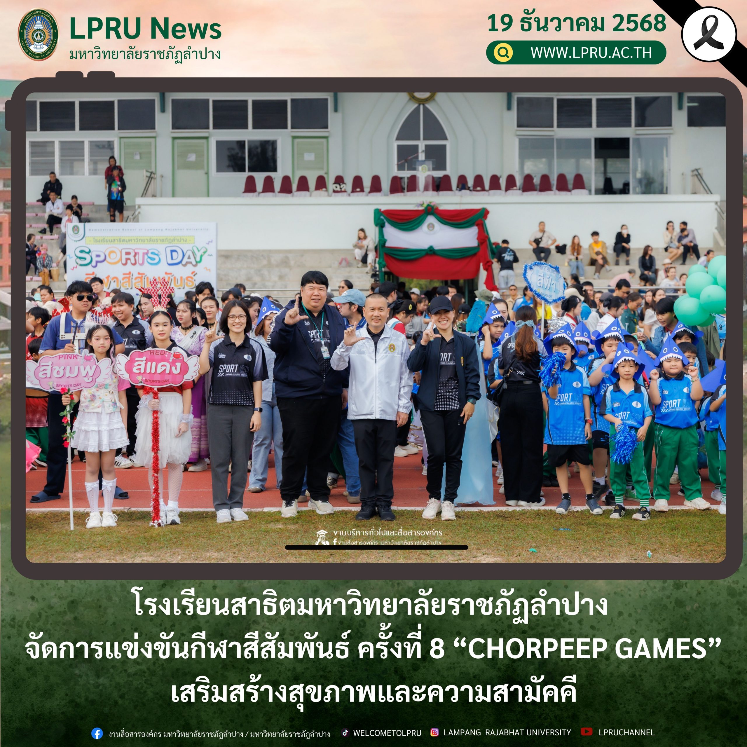 เมื่อวันที่ 19 ธันวาคม 2568 โรงเรียนสาธิตมหาวิทยาลัยราชภัฏลำปาง จัดพิธีเปิดการแข่งขันกีฬาสีสัมพันธ์ ครั้งที่ 8 ประจำปีการศึกษา 2568 ภายใต้ชื่อการแข่งขัน “CHORPEEP GAMES” ช่อปีบเกมส์ ณ สนามกีฬากลาง มหาวิทยาลัยราชภัฏลำปาง โดยมี รศ.ดร.ปริเยศ สิทธิสรวง รองอธิการบดีฝ่ายบริหาร เป็นประธานในพิธีเปิด และ อ.ดร.สมศักดิ์ ก๋าทอง ผู้อำนวยการโรงเรียน ฯ กล่าวรายงานวัตถุประสงค์ พร้อมด้วย ผู้บริหาร คณาจารย์ บุคลากร นักศึกษาฝึกประสบการณ์วิชาชีพ ผู้ปกครอง และนักเรียนโรงเรียนสาธิต ฯ เข้าร่วมกิจกรรมกว่า 500 คน