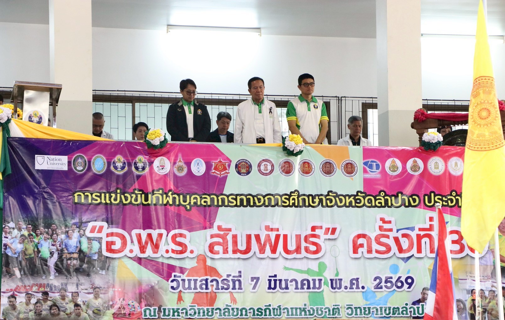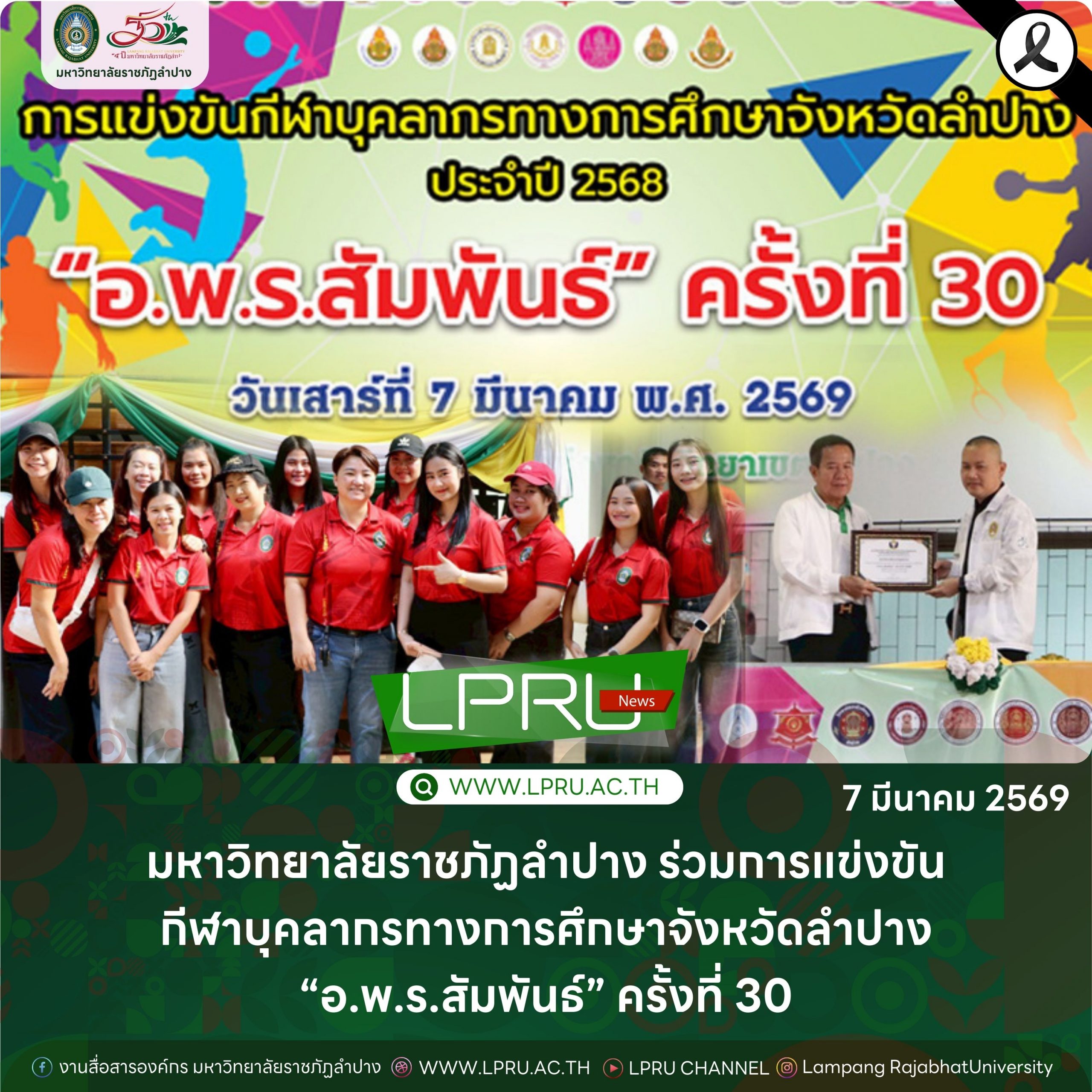 เมื่อวันที่ 7 มีนาคม 2569 รศ.ดร.ปริเยศ สิทธิสรวง รองอธิการบดีฝ่ายบริหาร มหาวิทยาลัยราชภัฏลำปาง พร้อมด้วย ผศ.เจษฎา ทองสุข ผู้อำนวยการสำนักศิลปะและวัฒนธรรม และ ผศ.เอกรัฐ อินต๊ะวงศา ผู้ช่วยอธิการบดีด้านงานบริหารทั่วไป นำคณาจารย์และบุคลากรมหาวิทยาลัยราชภัฏลำปาง เข้าร่วมการแข่งขันกีฬาบุคลากรทางการศึกษาจังหวัดลำปาง ประจำปีการศึกษา 2568 “อ.พ.ร.สัมพันธ์” ครั้งที่ 30 ณ มหาวิทยาลัยการกีฬาแห่งชาติ วิทยาเขตลำปาง โดยมี นายสมพร วะเท นายกเทศมนตรีตำบลบ่อแฮ้ว ให้เกียรติเป็นประธานในพิธีเปิด