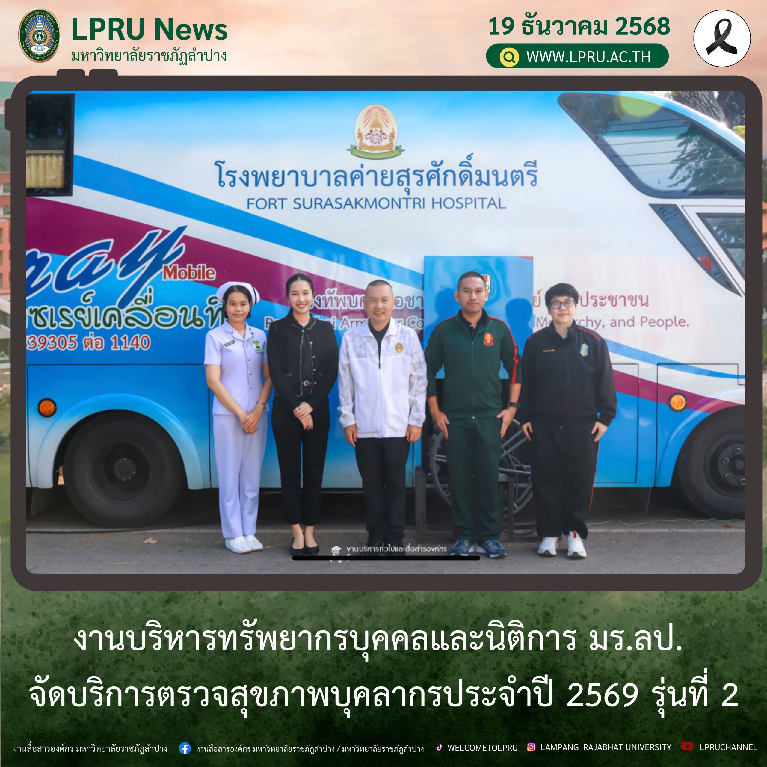 เมื่อวันที่ 19 ธันวาคม 2568 งานบริหารทรัพยากรบุคคลและนิติการ กองกลาง สำนักงานอธิการบดี มหาวิทยาลัยราชภัฏลำปาง จัดบริการตรวจสุขภาพ แก่คณะผู้บริหาร คณาจารย์ บุคลากร และนักศึกษาคณะพยาบาลศาสตร์ ประจำปี 2569 รุ่นที่ 2 ณ ลานอเนกประสงค์ผกากรอง ด้านหน้าอาคารคณะวิทยาศาสตร์ มหาวิทยาลัยราชภัฏลำปาง โดยมีคณะผู้บริหาร คณาจารย์ บุคลากร และนักศึกษาคณะพยาบาลศาสตร์ มหาวิทยาลัยราชภัฏลำปาง เข้ารับบริการตรวจสุขภาพในครั้งนี้ 200 คน
