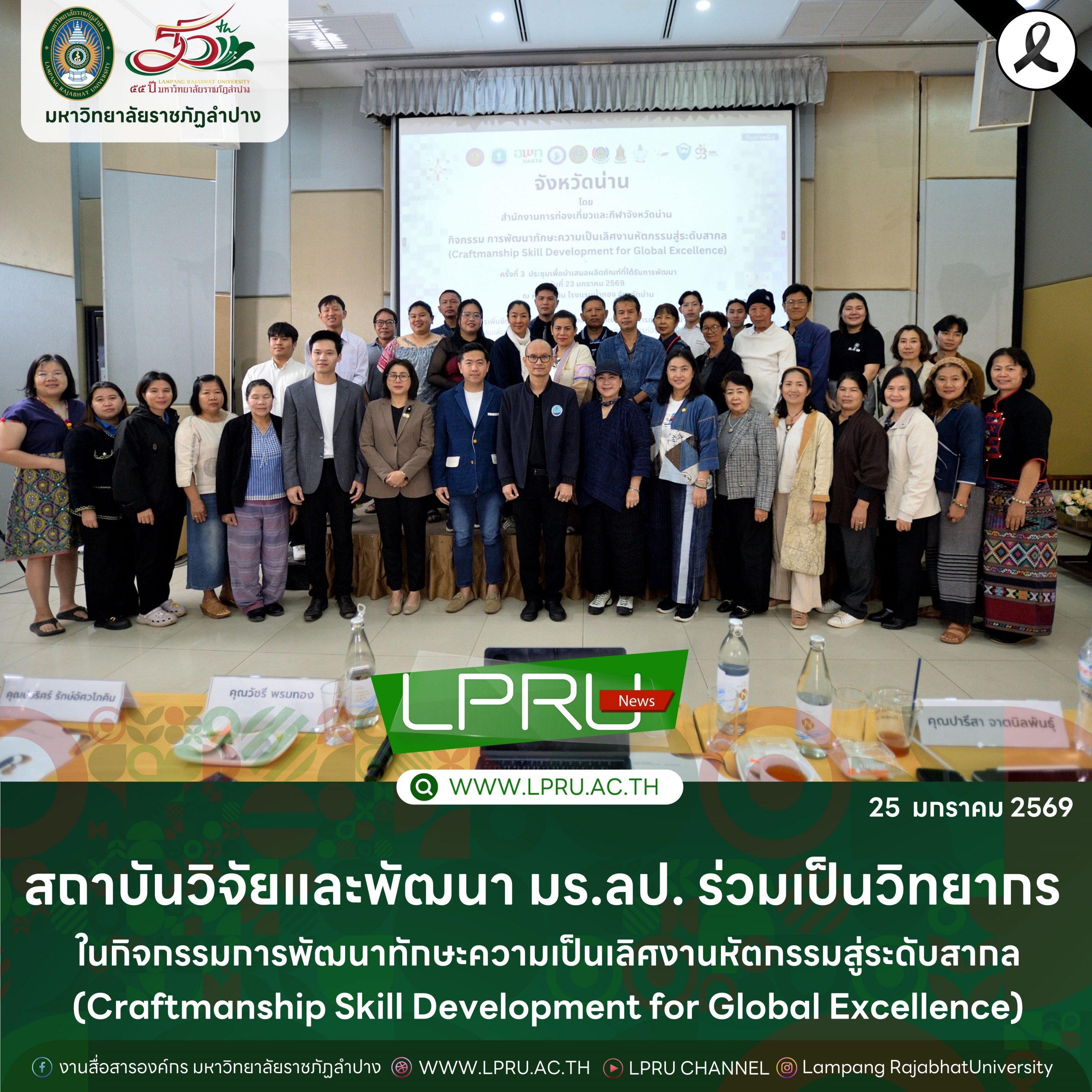 รศ.ธิติมา คุณยศยิ่ง ผู้อำนวยการสถาบันวิจัยและพัฒนา มหาวิทยาลัยราชภัฏลำปาง ร่วมเป็นวิทยากร ในกิจกรรมการพัฒนาทักษะความเป็นเลิศงานหัตกรรมสู่ระดับสากล (Craftmanship Skill Development for Global Excellence) ครั้งที่ 3 ประชุมเพื่อนําเสนอผลิตภัณฑ์ทีได้รับการพัฒนา เมื่อวันที่ 23 มกราคม 2569 ณ ห้องน้ำเงิน โรงแรมน้ำทอง จังหวัดน่าน