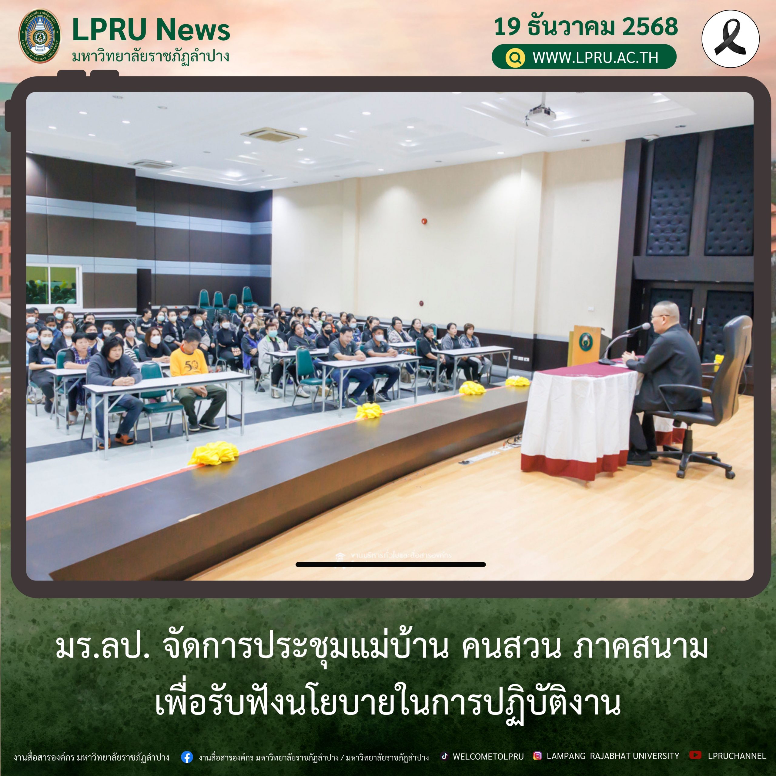 รศ.ดร.ปริเยศ สิทธิสรวง รองอธิการบดีฝ่ายบริหาร มหาวิทยาลัยราชภัฏลำปาง จัดการประชุมแม่บ้าน คนสวน ภาคสนาม เมื่อวันที่ 19 ธันวาคม 2568 ณ ห้องประชุมโอฬารรัตน์ ชั้น 1 อาคารโอฬาร โรจน์หิรัญ เพื่อมอบนโยบาย และชี้แจงแนวทางในการปฏิบัติงาน สร้างความเข้าใจในการปฏิบัติงานให้แก่บุคลากร ตลอดจนเตรียมความพร้อมการดำเนินการปฏิบัติในปีงบประมาณ พ.ศ. 2569 การดำเนินการตามนโยบายมหาวิทยาลัยสีเขียว และการจัดการขยะมูลฝอยภายในมหาวิทยาลัยราชภัฏลำปาง