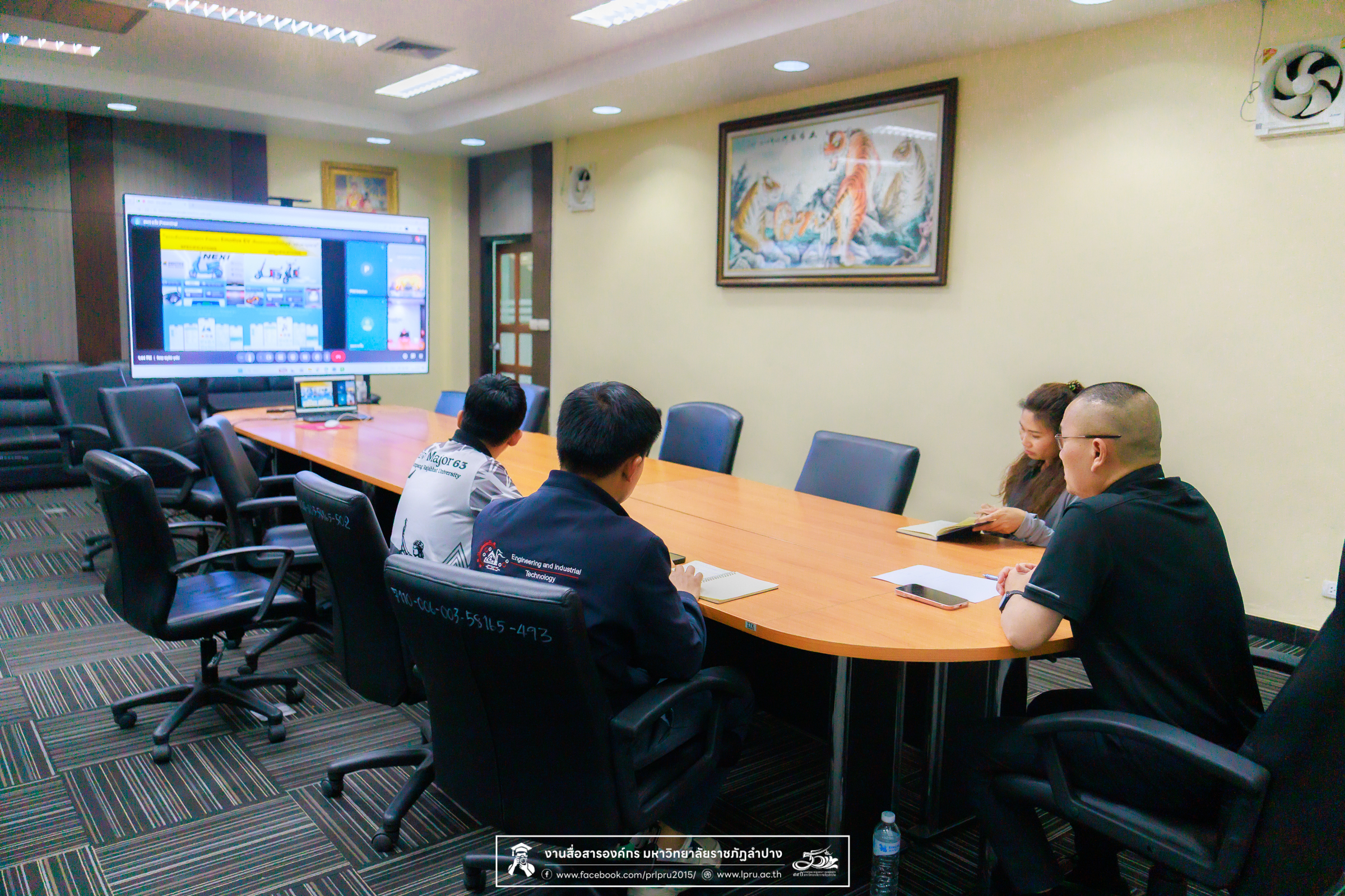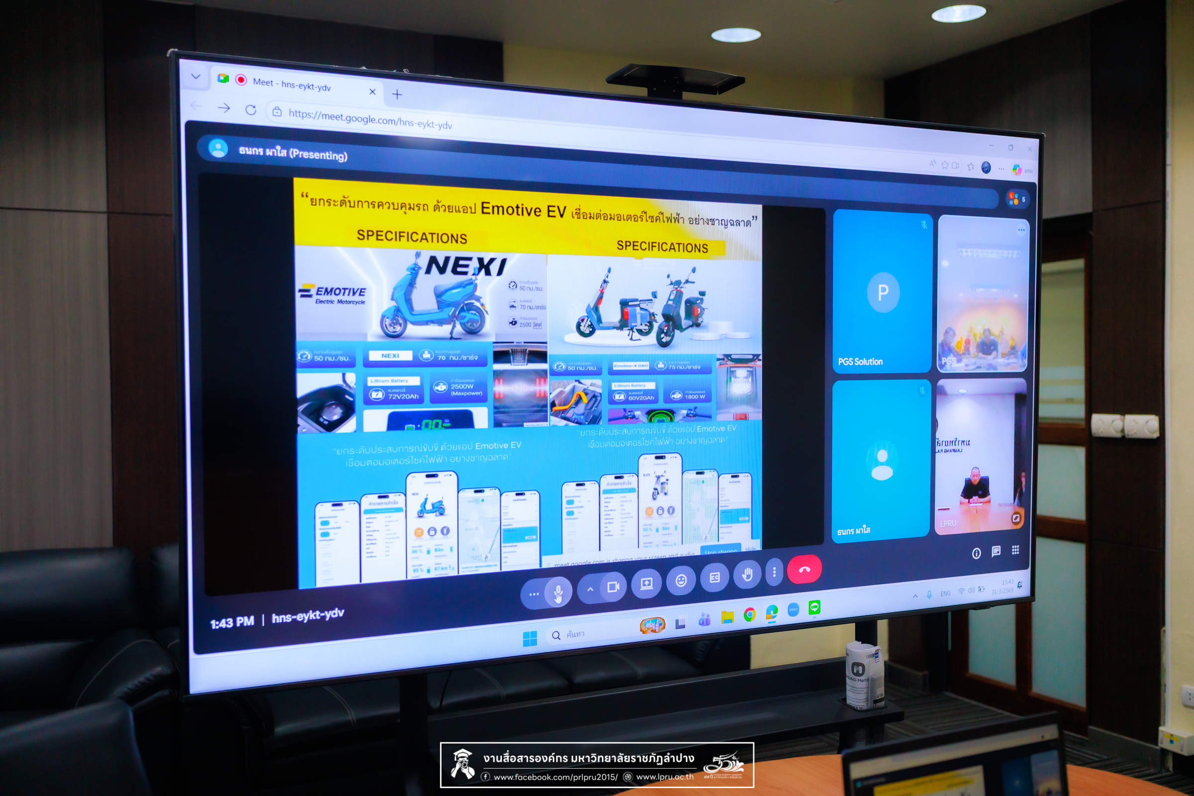 เมื่อวันที่ 31 มีนาคม 2569 รศ.ดร.ปริเยศ สิทธิสรวง รองอธิการบดีฝ่ายบริหาร พร้อมด้วย ว่าที่ ร.ต. ผศ.ปฐมพงศ์ พรมมาบุญ อาจารย์สังกัดสาขาวิชาวิศวกรรมการบำรุงรักษา คณะเทคโนโลยีอุตสาหกรรม น.ส.นุชรี ธิจินะ ปฏิบัติหน้าที่แทนหัวหน้างานงานจัดการทรัพย์สินและสิทธิประโยชน์ และ น.ส.ปาริชาติ ชัยยะ เจ้าหน้าที่บริหารงานทั่วไป สังกัดงานจัดการทรัพย์สินและสิทธิประโยชน์ มหาวิทยาลัยราชภัฏลำปาง เข้าร่วมรับฟังการนำเสนอโครงการวิจัยและพัฒนารถจักรยานยนต์ไฟฟ้าพลังงานสะอาด พร้อมทั้งเสนอบริการเช่าและจำหน่ายให้แก่นักศึกษาและบุคลากรภายในมหาวิทยาลัย เพื่อส่งเสริมการใช้พลังงานที่เป็นมิตรต่อสิ่งแวดล้อม จากบริษัท พาวเวอร์ กรีน โซลูชั่น จำกัด ในรูปแบบออนไลน์ ณ ห้องประชุมทองอุไร ชั้น 4 อาคารสำนักงานอธิการบดี มหาวิทยาลัยราชภัฏลำปาง เพื่อพิจารณาแนวทางความร่วมมือดังกล่าว