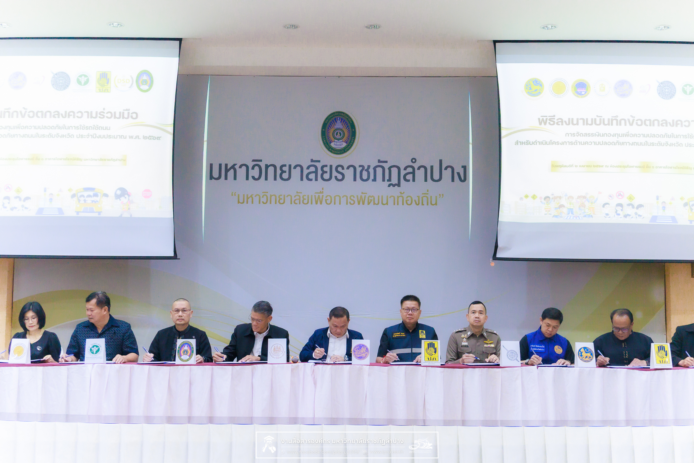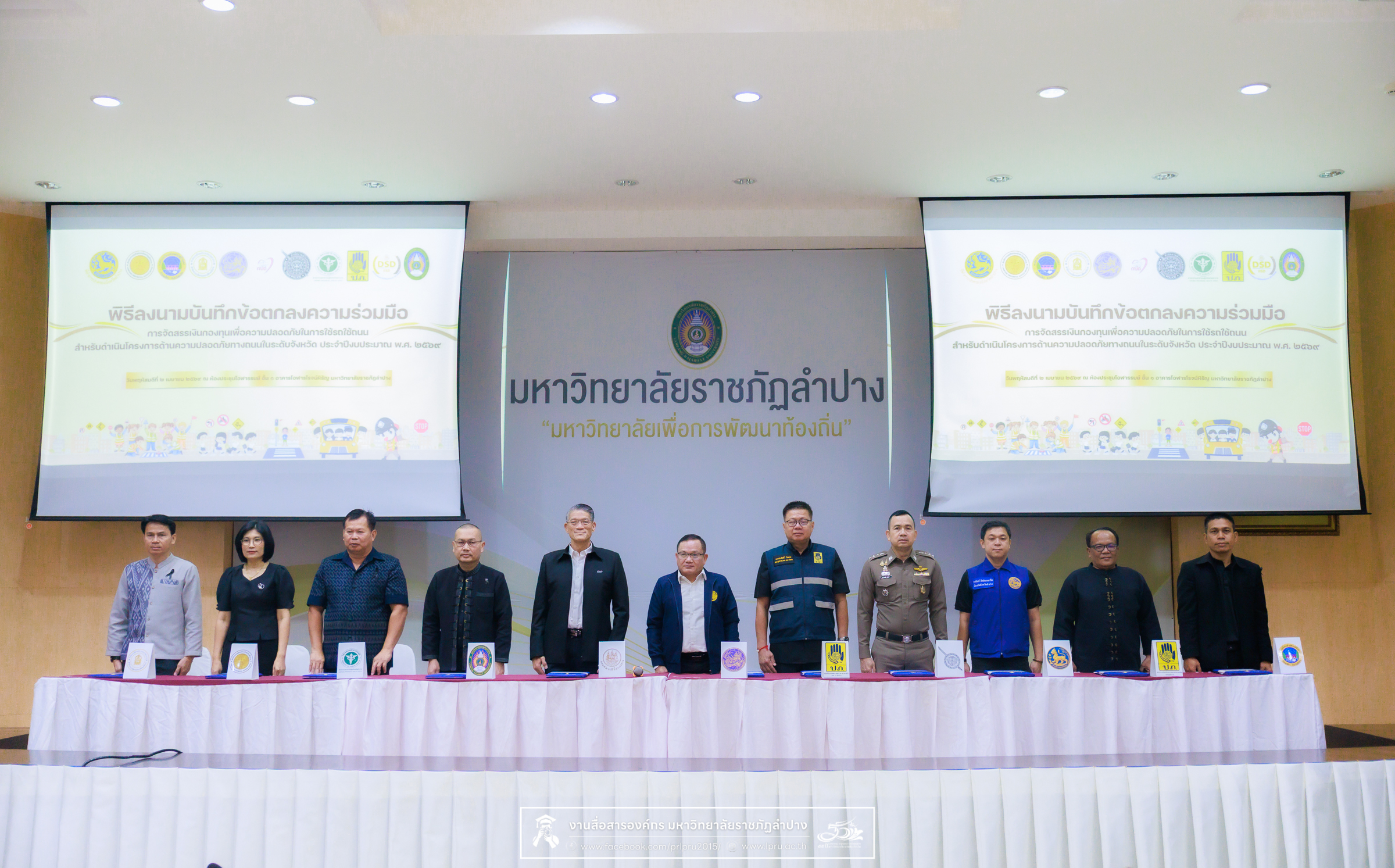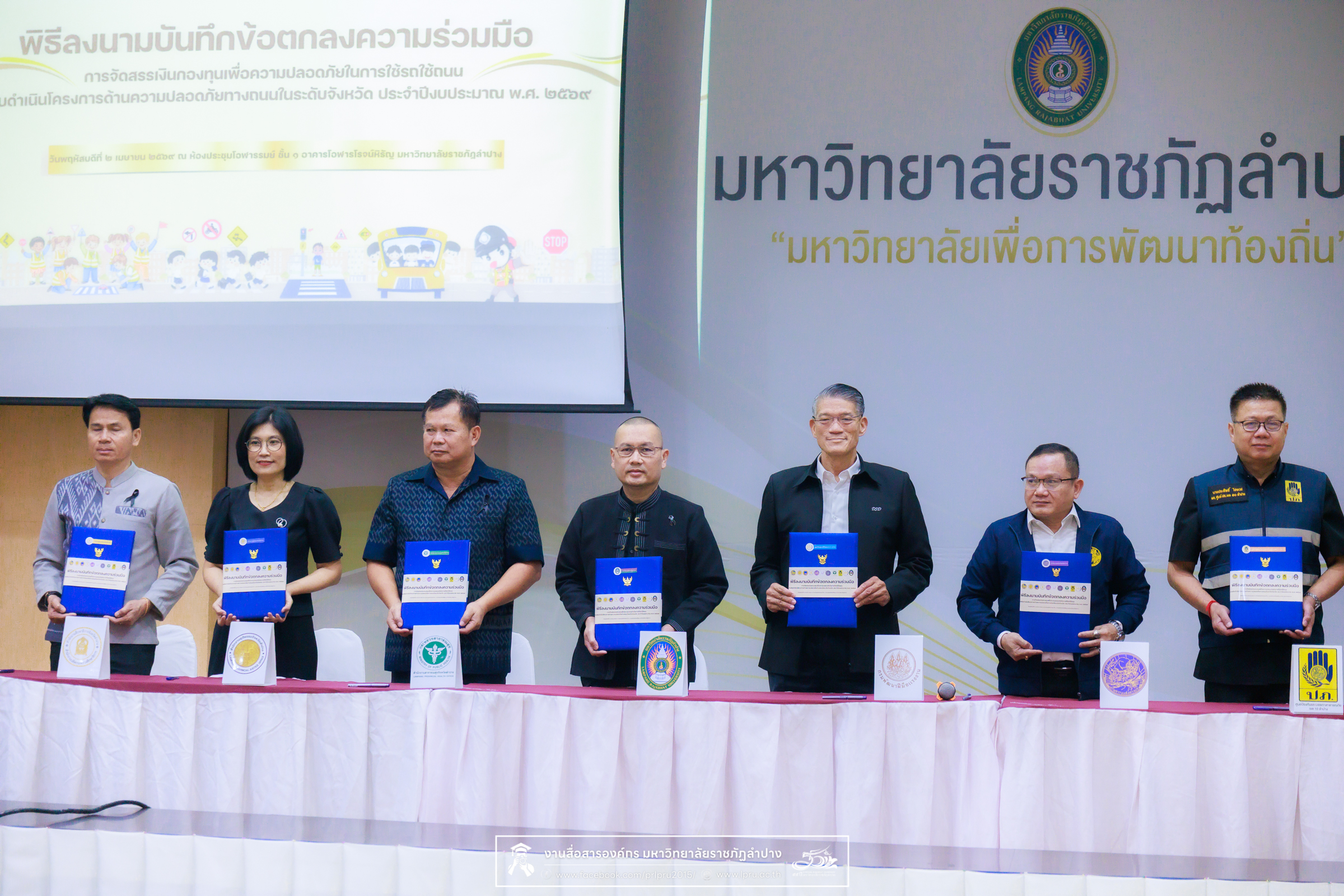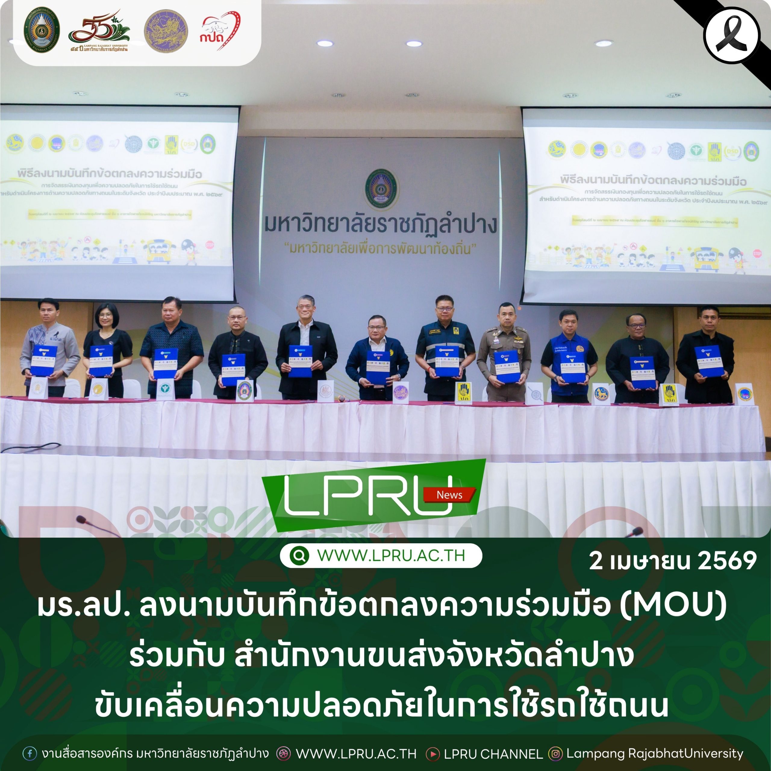 เมื่อวันที่ 2 เมษายน 2569 รศ.ดร.ปริเยศ สิทธิสรวง รองอธิการบดีฝ่ายบริหาร มหาวิทยาลัยราชภัฏลำปาง ลงนามบันทึกข้อตกลงความร่วมมือ (MOU) การจัดสรรเงินกองทุนเพื่อความปลอดภัยในการใช้รถใช้ถนน (กปถ.) สำหรับดำเนินโครงการด้านความปลอดภัยทางถนนในระดับจังหวัด ประจำปีงบประมาณ พ.ศ. 2569 ร่วมกับ สำนักงานขนสังจังหวัดลำปาง กรมการขนส่งทางบก โดยมี นายโกศล ธนบัตร ขนส่งจังหวัดลำปาง เป็นประธานในการลงนามบันทึกข้อตกลงความร่วมมือ (MOU) ณ ห้องประชุมโอฬารรมย์ ชั้น 1 อาคารโอฬาร โรจน์หิรัญ มหาวิทยาลัยราชภัฏลำปาง มีหน่วยงานที่ร่วมลงนามบันทึกข้อตกลงความร่วมมือ (MOU) และได้รับการจัดสรรงบประมาณจำนวน 10 หน่วยงาน ดังนี้ ตำรวจภูธรจังหวัดลำปาง สถาบันพัฒนาฝีมือแรงงาน 10 ลำปาง สำนักงานสาธารณสุขจังหวัดลำปาง สำนักงานยุติธรรมจังหวัดลำปาง ศูนย์ป้องกันและบรรเทาสาธารณภัย เขต 10 ลำปาง ที่ทำการปกครองจังหวัดลำปาง สำนักงานป้องกันและบรรเทาสาธารณภัยจังหวัดลำปาง สำนักงานศึกษาธิการจังหวัดลำปาง มหาวิทยาลัยราชภัฏลำปาง และองค์การบริหารส่วนตำบลบ้านแลง