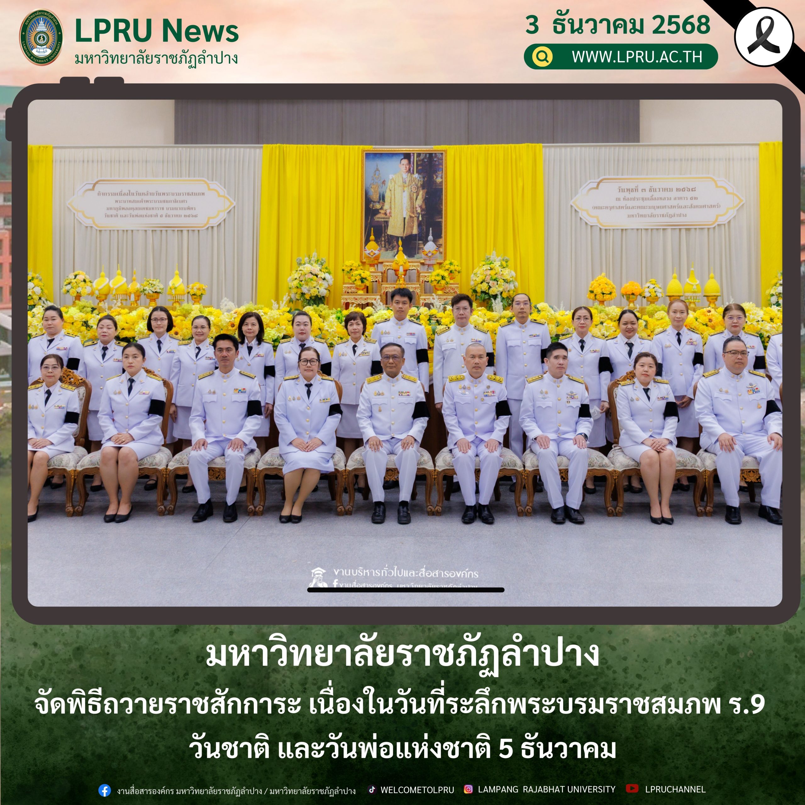 เมื่อวันที่ 3 ธันวาคม 2568 มหาวิทยาลัยราชภัฏลำปาง จัดพิธีถวายราชสักการะเนื่องในวันคล้ายวันพระบรมราชสมภพ พระบาทสมเด็จพระบรมชนกาธิเบศร มหาภูมิพลอดุลยเดชมหาราช บรมนาถบพิตร วันชาติ และวันพ่อแห่งชาติ เพื่อร่วมแสดงความจงรักภักดีและน้อมรำลึกในพระมหากรุณาธิคุณอันหาที่สุดมิได้ ณ ห้องประชุมเอื้องหลวง ชั้น 2 อาคาร 52 คณะครุศาสตร์และคณะมนุษยศาสตร์และสังคมศาสตร์ โดย รศ.ดร.กิตติศักดิ์ สมุทธารักษ์ อธิการบดีมหาวิทยาลัยราชภัฏลำปาง เป็นประธานในพิธี พร้อมนำคณะผู้บริหาร คณาจารย์ บุคลากร และนักศึกษาเข้าร่วม