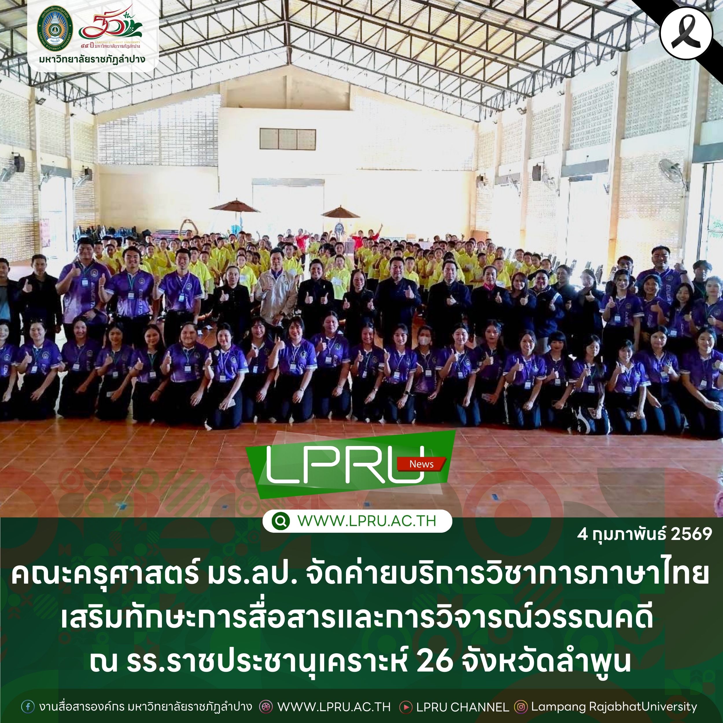 เมื่อวันที่ 4 กุมภาพันธ์ 2569 อ.เอกนรินทร์ สีฝั้น ประธานสาขาวิชาภาษาไทย พร้อมด้วย ผศ.ดร.ณัฐนรินทร์ เมธีวุฒินันทน์ ภาณุภัทรธนวัฒน์ อาจารย์สังกัดสาขาวิชาภาษาไทย นำนักศึกษาชั้นปีที่ 2 และชั้นปีที่ 3 หลักสูตรครุศาสตรบัณฑิต สาขาวิชาภาษาไทย จัดกิจกรรมค่ายบริการวิชาการ “รอบรู้หลักภาษา พัฒนาทักษะการสื่อสาร วิจารณ์วรรณคดีและวรรณกรรมไทย” ให้แก่นักเรียนระดับชั้นมัธยมศึกษา ณ โรงเรียนราชประชานุเคราะห์ 26 อำเภอป่าซาง จังหวัดลำพูน