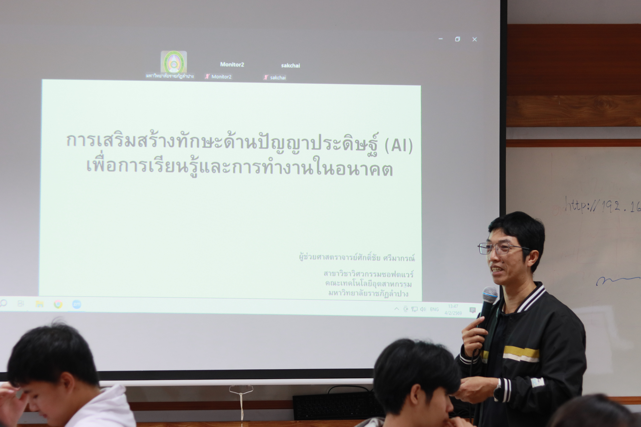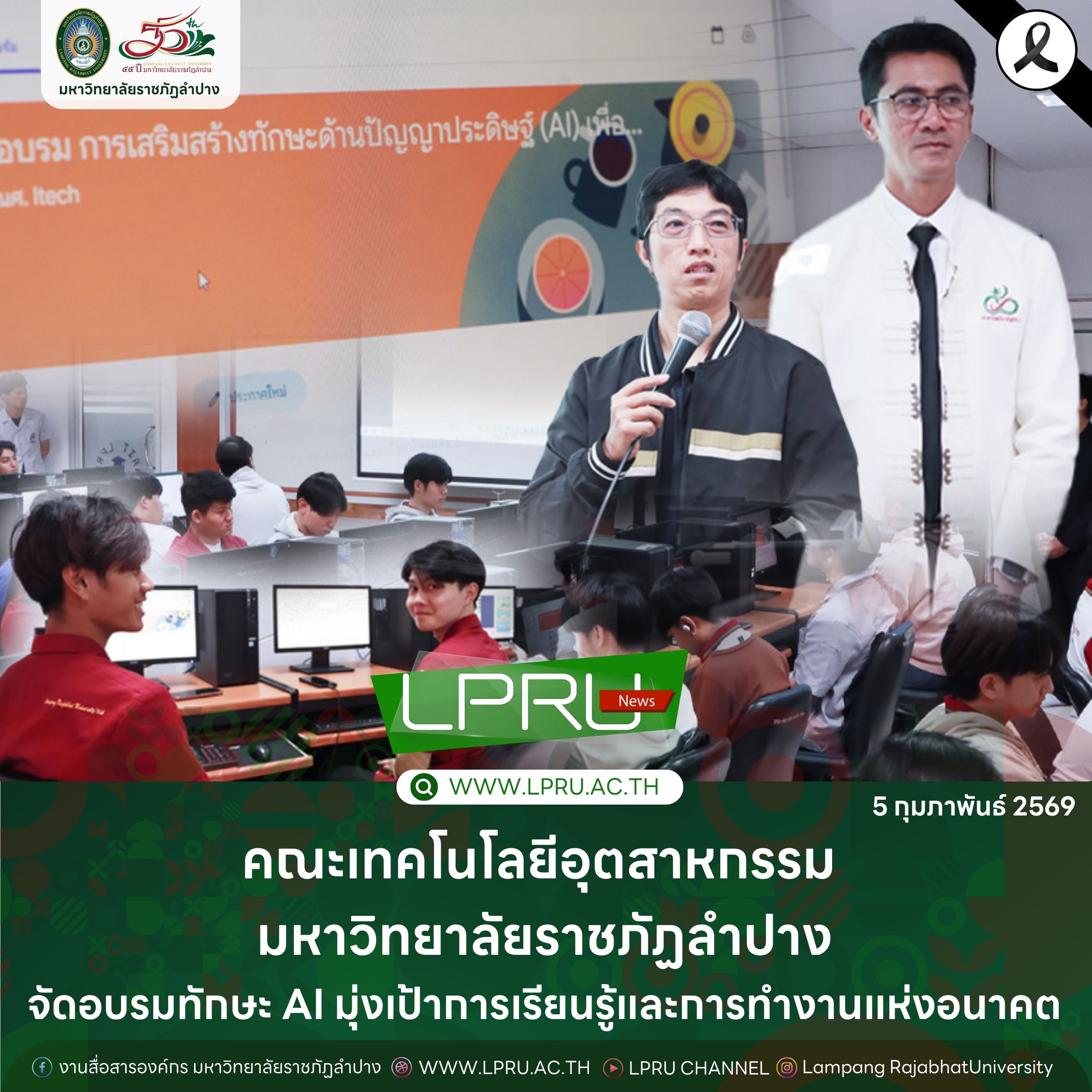 เมื่อวันที่ 4 กุมภาพันธ์ 2569 คณะเทคโนโลยีอุตสาหกรรม มหาวิทยาลัยราชภัฏลำปาง จัดโครงการอบรมเชิงปฏิบัติการเรื่อง “การเสริมสร้างทักษะด้านปัญญาประดิษฐ์ (Artificial Intelligence: AI) เพื่อการเรียนรู้และการทำงานในอนาคต” ภายใต้โครงการส่งเสริมการสื่อสารและการใช้เทคโนโลยีสารสนเทศ ณ ชั้น 2 อาคารศูนย์คอมพิวเตอร์ สำนักวิทยบริการและเทคโนโลยีสารสนเทศ โดยมี ผศ.จักรกฤษณ์ ฮั่นยะลา คณบดีคณะเทคโนโลยีอุตสาหกรรม เป็นประธานในพิธี อ.วรพล คณิตปัญญาเจริญ รองคณบดีฝ่ายกิจการนักศึกษาและประกันคุณภาพการศึกษา กล่าวรายงานถึงวัตถุประสงค์ ได้รับความสนใจจากนักศึกษา คณะเทคโนโลยีอุตสาหกรรม เข้าร่วมกว่า 80 คน