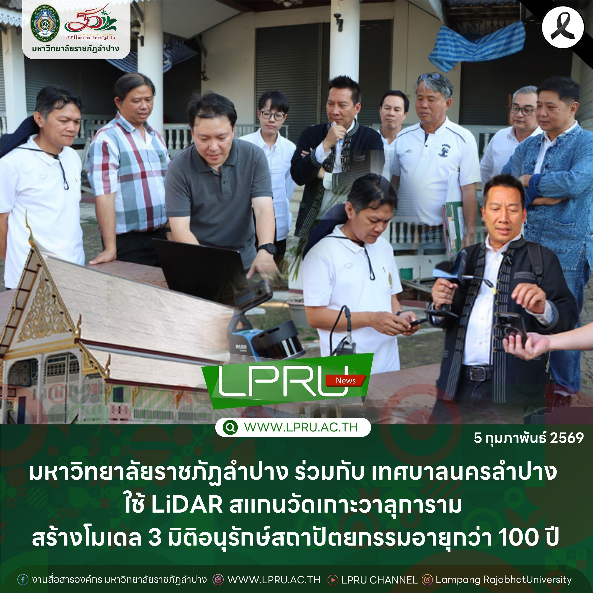 เมื่อวันที่ 4 กุมภาพันธ์ 2569 อ.ณรงค์ เครือกันทา อาจารย์สังกัดสาขาวิชาวิศวกรรมการบำรุงรักษา พร้อมด้วย อ.ธชนม์ ก้าวสมบูรณ์ ผศ.ศรายุทธ มาลัย อาจารย์สังกัดสาขาวิชาเทคโนโลยีโยธา คณะเทคโนโลยีอุตสาหกรรม ผศ.ดร.โอฬาร เชี่ยวชาญ และ ผศ.อนุกิจ เสาร์แก้ว อาจารย์สังกัดสาขาวิชาเทคโนโลยีสารสนเทศ คณะวิทยาศาสตร์ มหาวิทยาลัยราชภัฏลำปางร่วมกับเทศบาลนครลำปาง นำโดย นายปุณณสิน มณีนันทน์ นายกเทศมนตรีนครลำปาง พร้อมด้วยคณะผู้บริหาร สมาชิกสภาเทศบาลนครลำปาง และเจ้าหน้าที่ผู้เชี่ยวชาญในการใช้เครื่องสแกนพื้นที่แบบถือ SLAM 200E Handheld Lidar Scanner ลงพื้นที่ทำการสแกนเพื่อสร้างโมเดลพื้นที่และเก็บข้อมูลสถาปัตยกรรมสำคัญ ภายในวัดเกาะวาลุการาม อำเภอเมืองลำปาง จังหวัดลำปาง