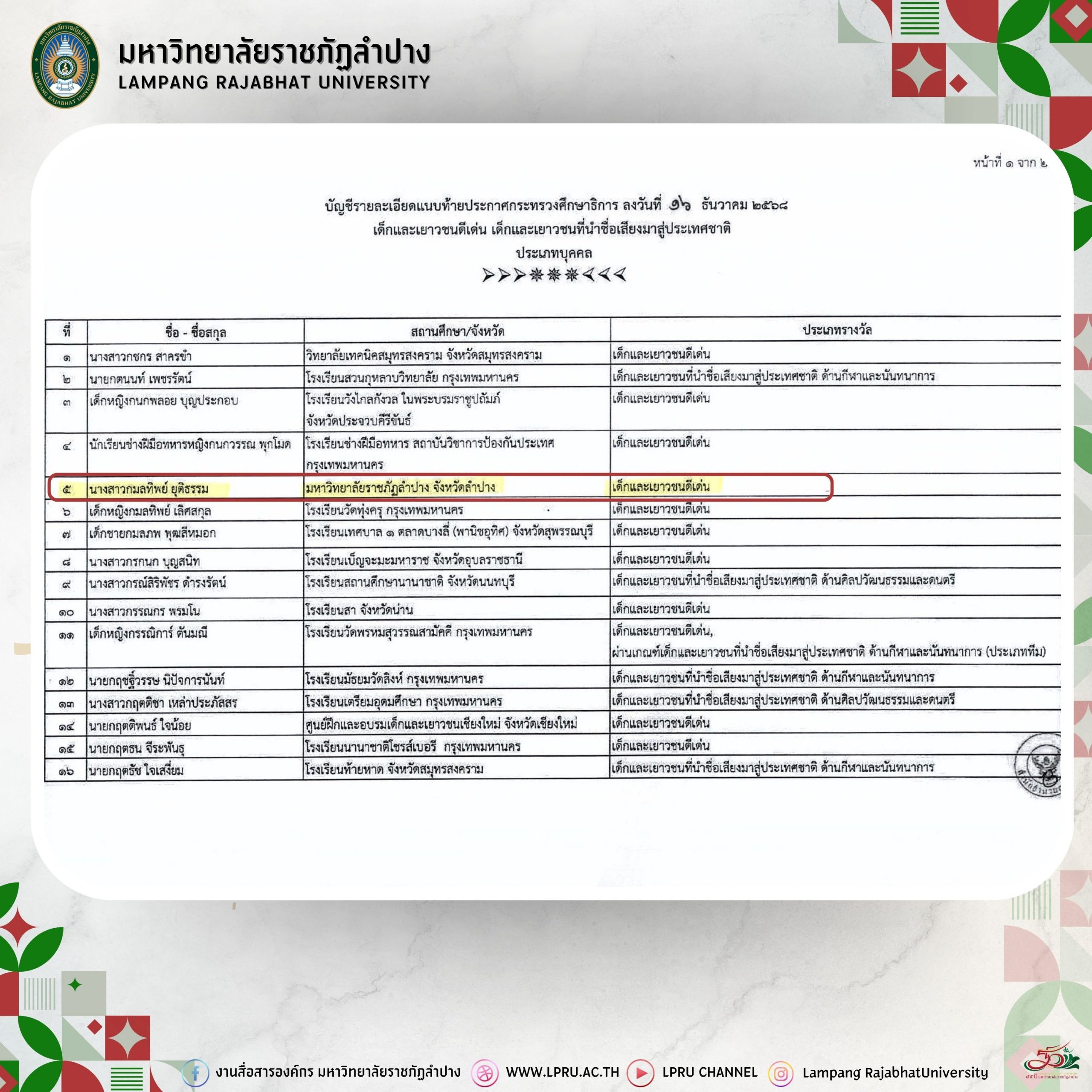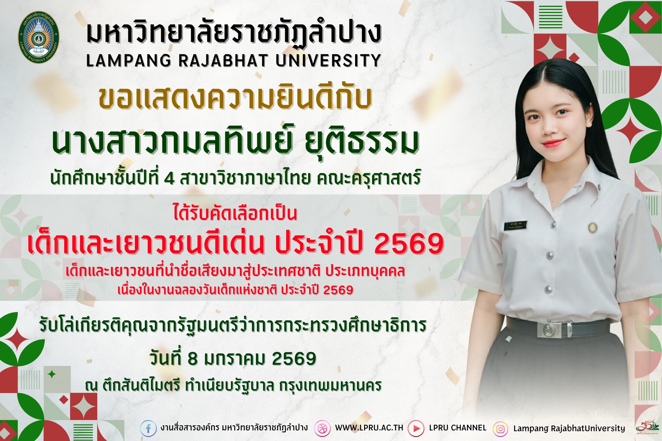 มหาวิทยาลัยราชภัฏลำปาง ขอแสดงความยินดีกับ นางสาวกมลทิพย์ ยุติธรรม นักศึกษาชั้นปีที่ 4 สาขาวิชาภาษาไทย คณะครุศาสตร์ สร้างชื่อเสียงและความภาคภูมิใจให้แก่มหาวิทยาลัย