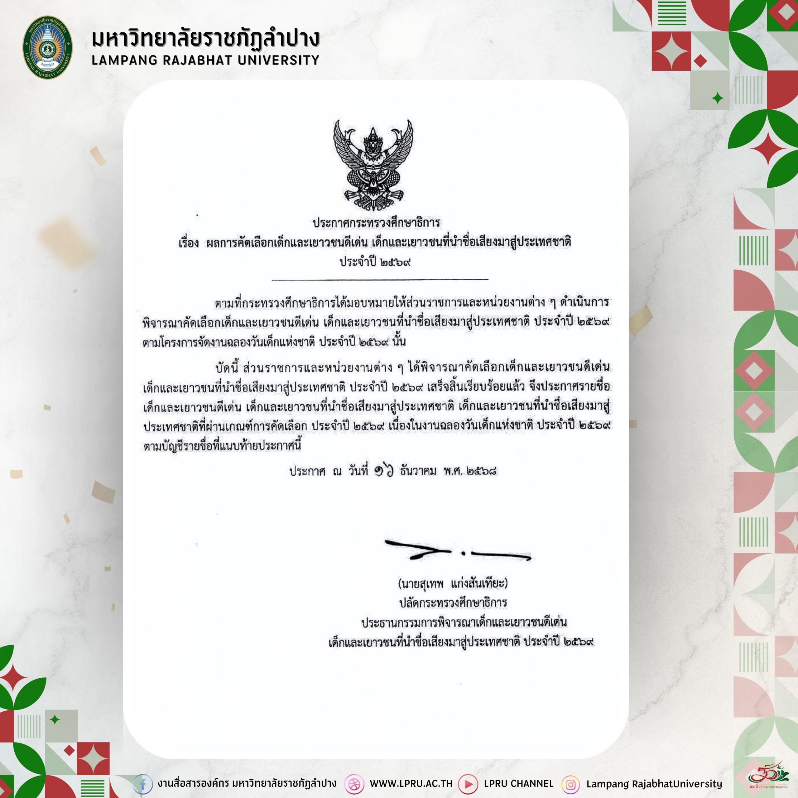มหาวิทยาลัยราชภัฏลำปาง ขอแสดงความยินดีกับ