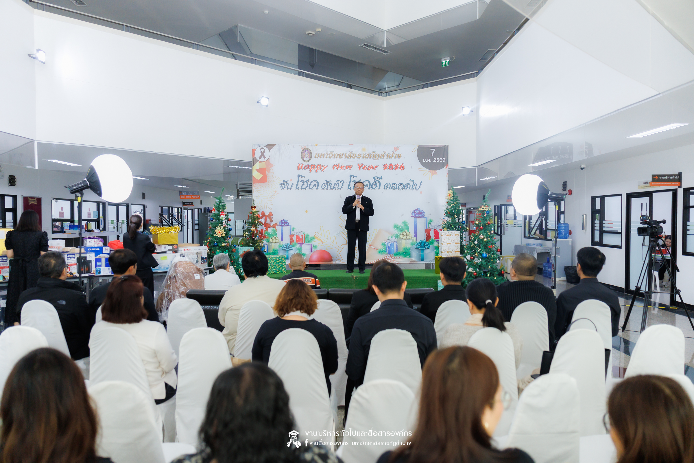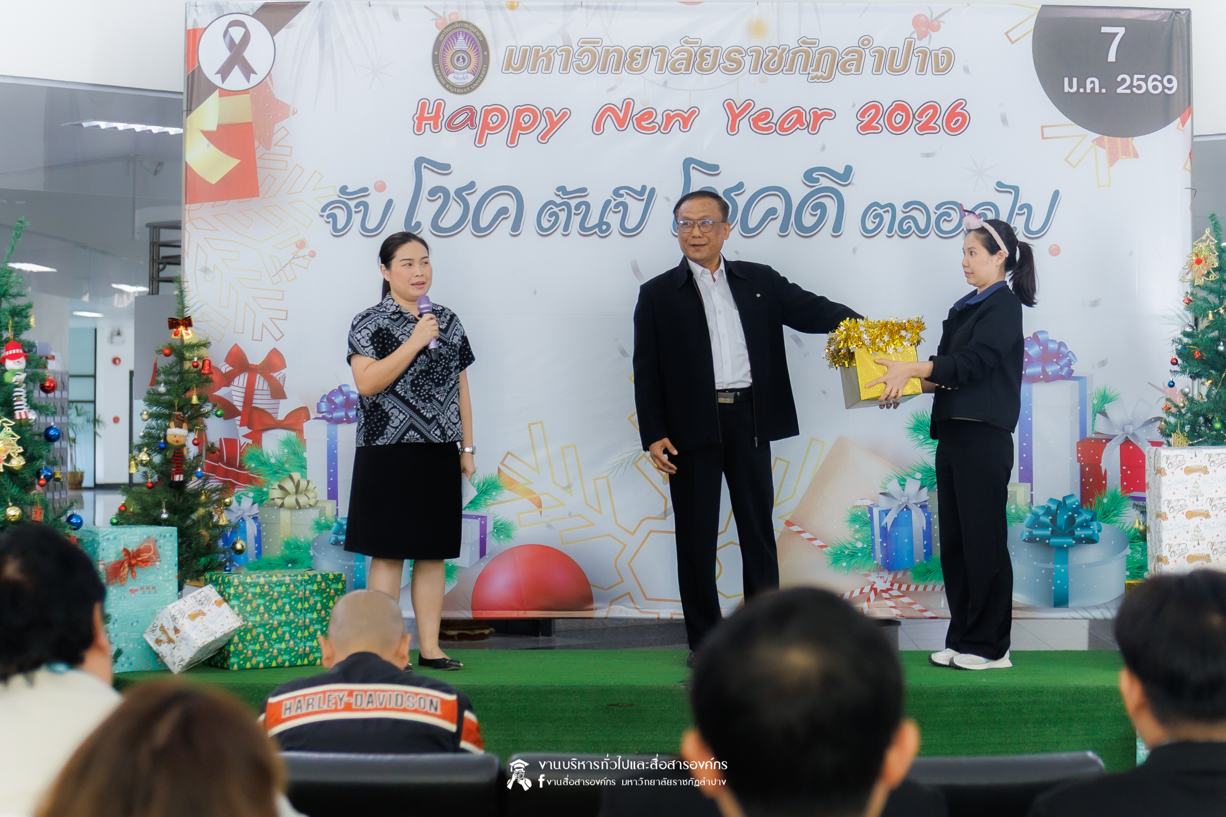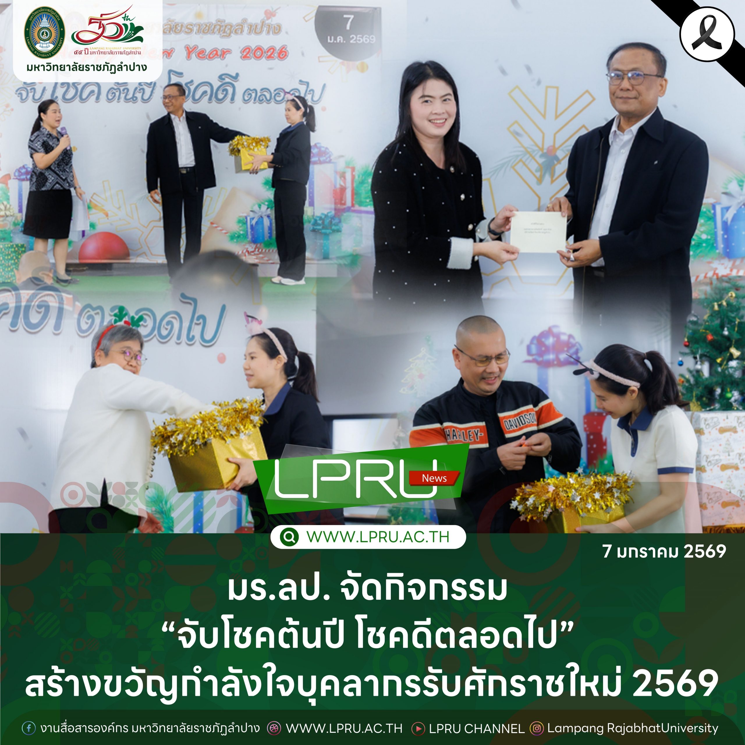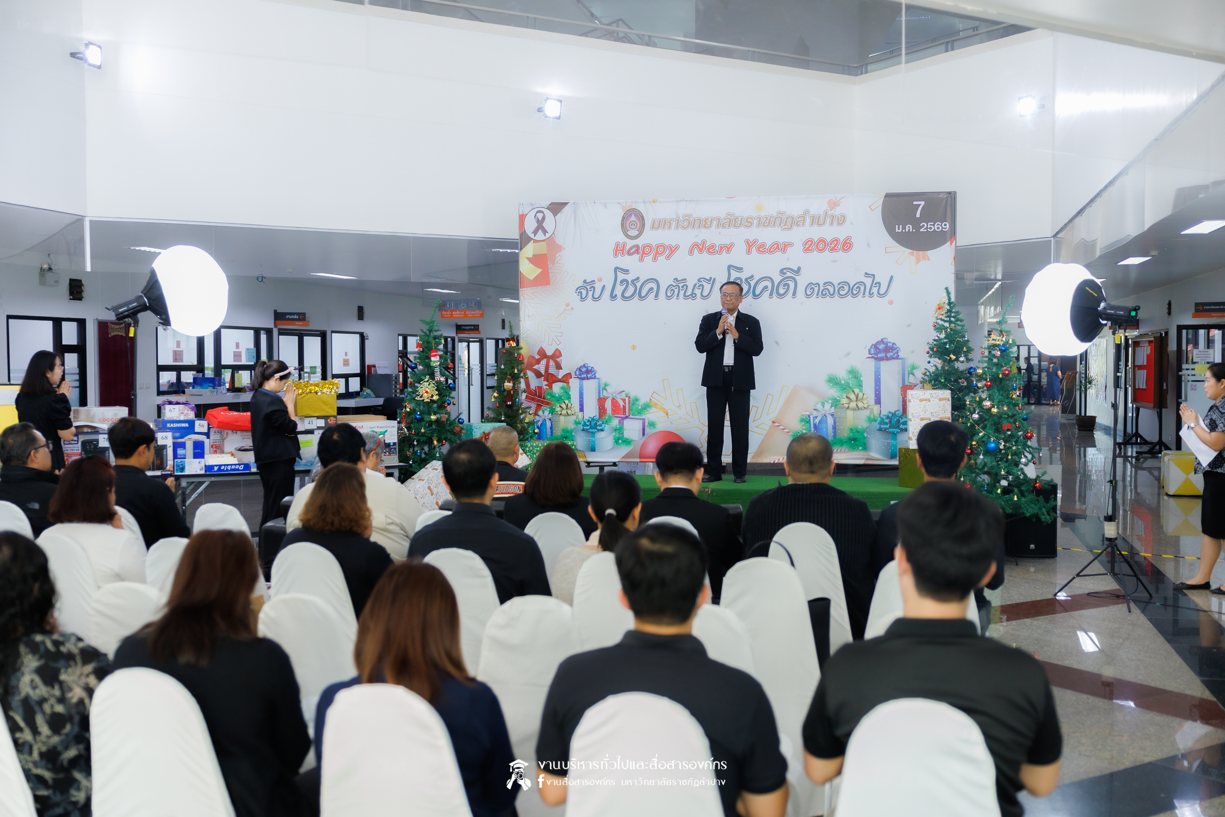 เมื่อวันที่ 7 มกราคม 2569 รศ.ดร.กิตติศักดิ์ สมุทธารักษ์ อธิการบดีมหาวิทยาลัยราชภัฏลำปาง เป็นประธานเปิดกิจกรรม “จับโชคต้นปี โชคดีตลอดไป” เนื่องในเทศกาลปีใหม่ พ.ศ. 2569 เพื่อสร้างขวัญและกำลังใจแก่คณะผู้บริหาร คณาจารย์ เจ้าหน้าที่ และบุคลากรของมหาวิทยาลัย พร้อมกล่าวอวยพรเนื่องในโอกาสขึ้นปีใหม่ แสดงความปรารถนาดีและให้กำลังใจแก่บุคลากรทุกภาคส่วนในการปฏิบัติหน้าที่ด้วยความมุ่งมั่น ตั้งใจ และร่วมกันขับเคลื่อนมหาวิทยาลัยสู่ความก้าวหน้าอย่างยั่งยืน