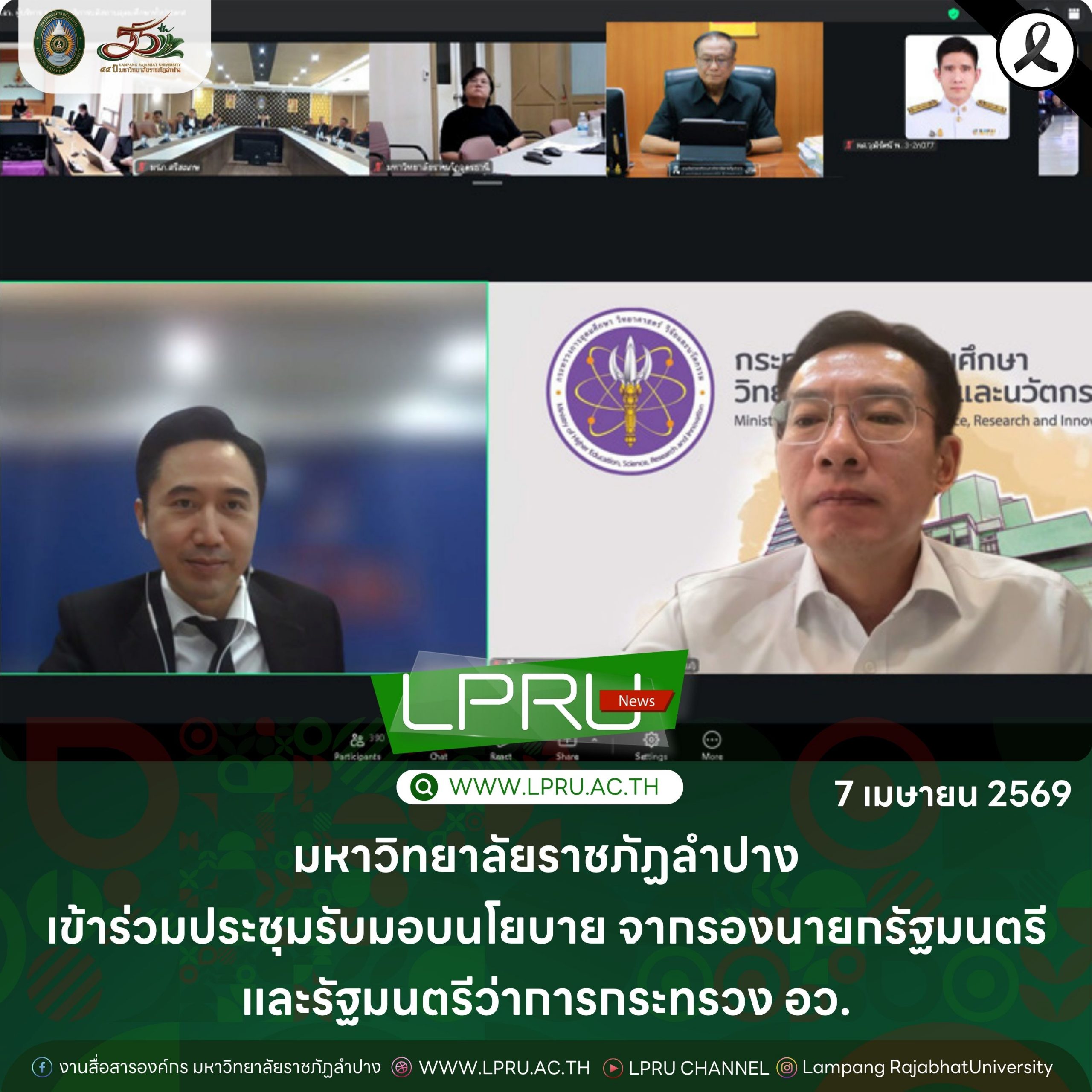 เมื่อวันที่ 7 เมษายน 2569 รศ.ดร.กิตติศักดิ์ สมุทธารักษ์ อธิการบดีมหาวิทยาลัยราชภัฏลำปาง พร้อมด้วย ผศ.วุฒิรัตน์ พัฒนิบูลย์ ผู้ช่วยอธิการบดีด้านติดตามนโยบายและกิจการพิเศษ เข้าร่วมการประชุมหารือแนวทางการจัดการเรียนการสอนและการบริหารจัดการองค์กร ภายใต้สถานการณ์ที่ต้องมีการบริหารจัดการด้านพลังงานอย่างประหยัดและมีประสิทธิภาพ ร่วมกับ ศ.ดร.ยศชนัน วงศ์สวัสดิ์ รองนายกรัฐมนตรีและรัฐมนตรีว่าการกระทรวง อว. พร้อมด้วย ศ.ดร.ศุภชัย ปทุมนากุล ปลัดกระทรวง อว. รวมถึงอธิการบดีและผู้บริหารจากสถาบันอุดมศึกษาทั่วประเทศเข้าร่วมประชุมผ่านระบบออนไลน์
