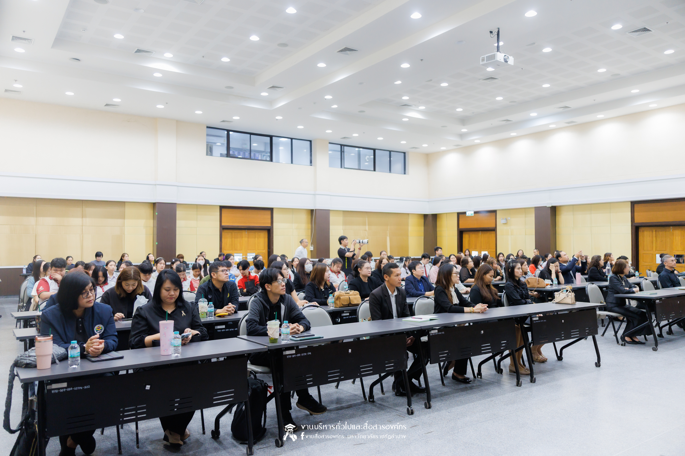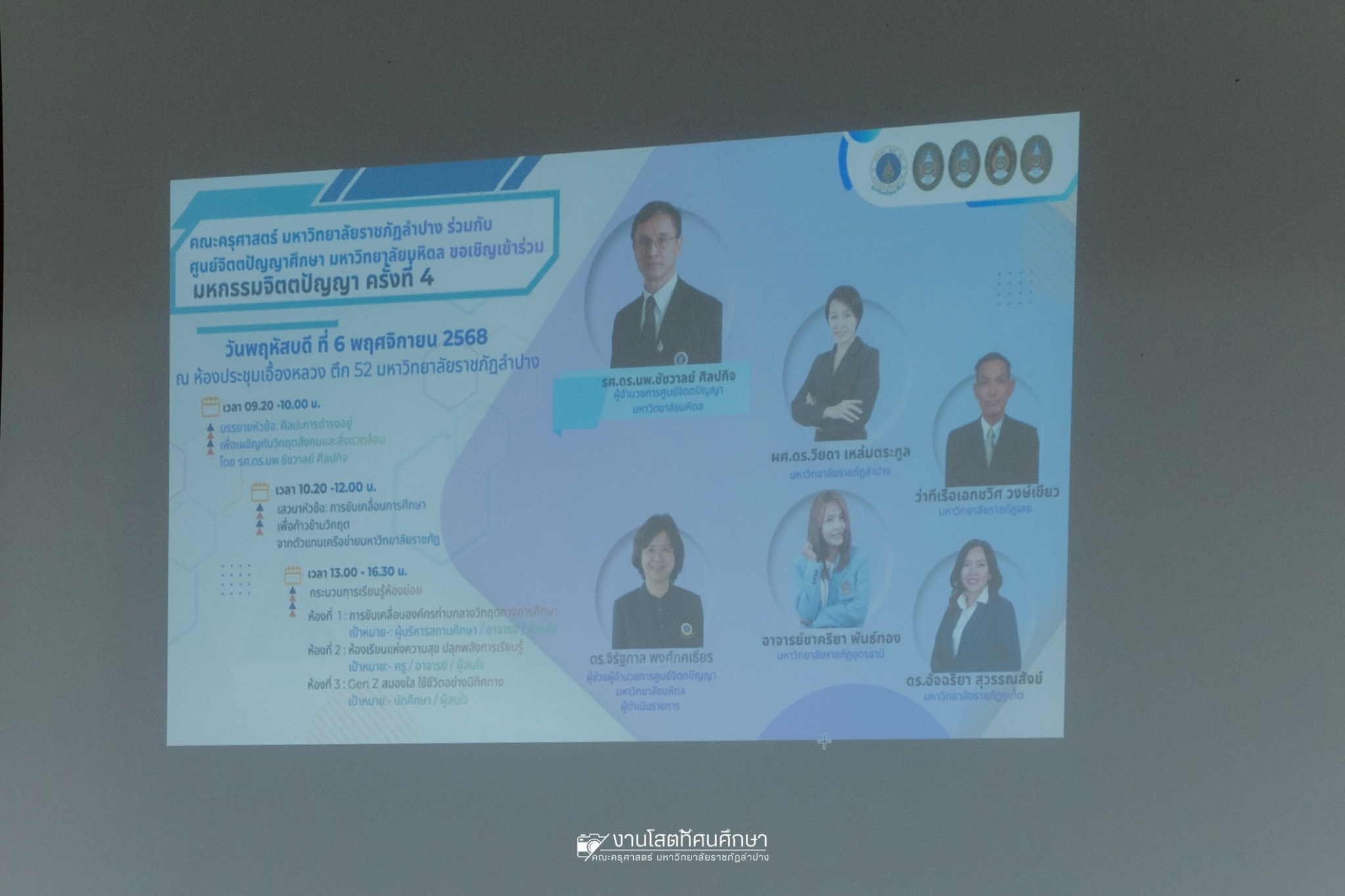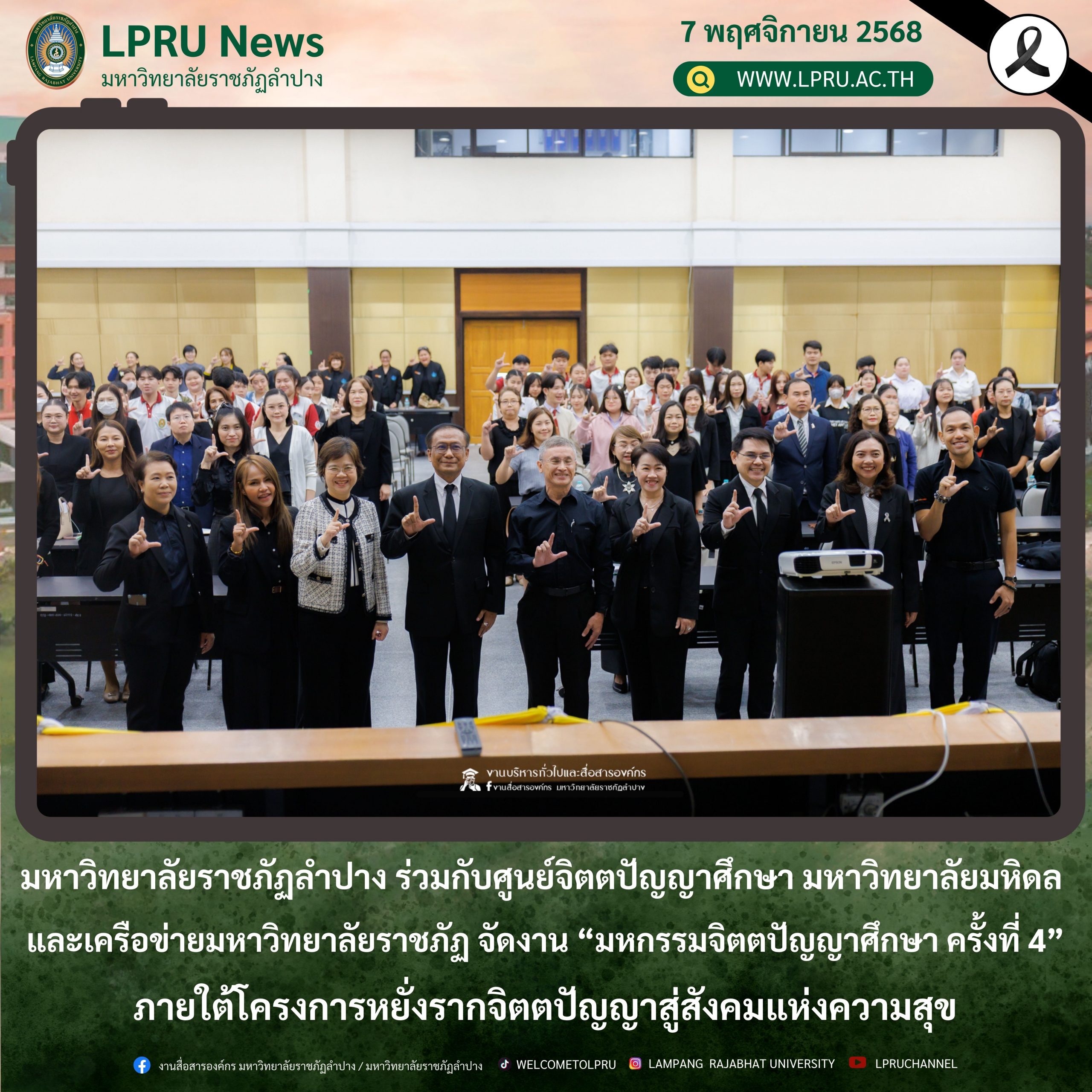เมื่อวันที่ 6 พฤศจิกายน 2568 รศ.ดร.กิตติศักดิ์ สมุทธารักษ์ อธิการบดีมหาวิทยาลัยราชภัฏลำปาง เป็นประธานเปิด “มหกรรมจิตตปัญญา ครั้งที่ 4” โครงการหยั่งรากจิตตปัญญาสู่สังคมแห่งความสุข ณ ห้องประชุมเอื้องหลวง อาคาร 52 คณะครุศาสตร์และคณะมนุษยศาสตร์และสังคมศาสตร์ มหาวิทยาลัยราชภัฏลำปาง โดย อ.ดร.จิรัฐกาล พงศ์ภคเธียร ผู้ช่วยผู้อำนวยการฝ่ายขับเคลื่อนจิตตปัญญาศึกษา ศูนย์จิตตปัญญาศึกษา มหาวิทยาลัยมหิดล กล่าวรายงานวัตถุประสงค์ พร้อมกันนี้ รศ.ดร.ฟิสิกส์ ฌอณ บัวกนก คณบดีคณะครุศาสตร์ พร้อมด้วยผู้บริหาร คณาจารย์ และนักศึกษาสาขาวิชาจิตวิทยาการศึกษาและการแนะแนว และสาขาวิชาดนตรีศึกษา หลักสูตรตรุศาสตร์บัณฑิต เข้าร่วมในกิจกรรมครั้งนี้ นอกจากนี้ยังมีคณาจารย์หลักสูตรครุศาสตรบัณฑิต จากมหาวิทยาลัยราชภัฏภาคเหนือ 8 แห่ง และ มหาวิทยาลัยราชภัฏเครือข่าย อาทิ มหาวิทยาลัยราชภัฏเลย มหาวิทยาลัยราชภัฏอุดรธานี และมหาวิทยาลัยราชภัฏภูเก็ต เข้าร่วม