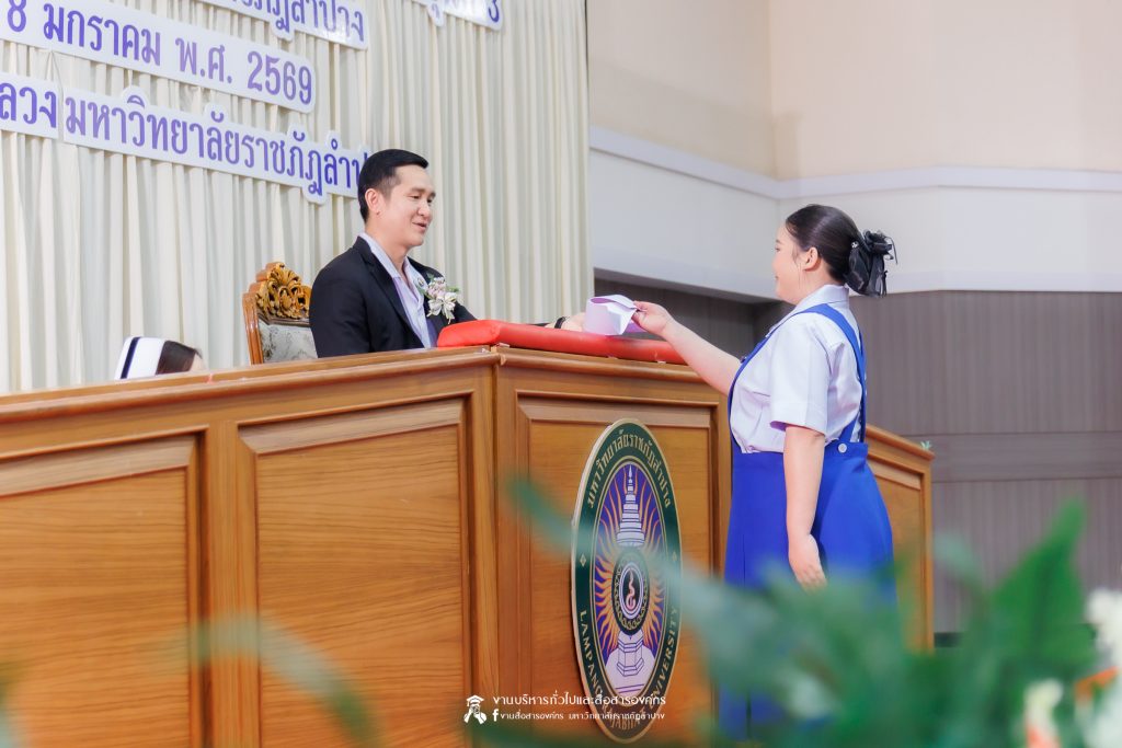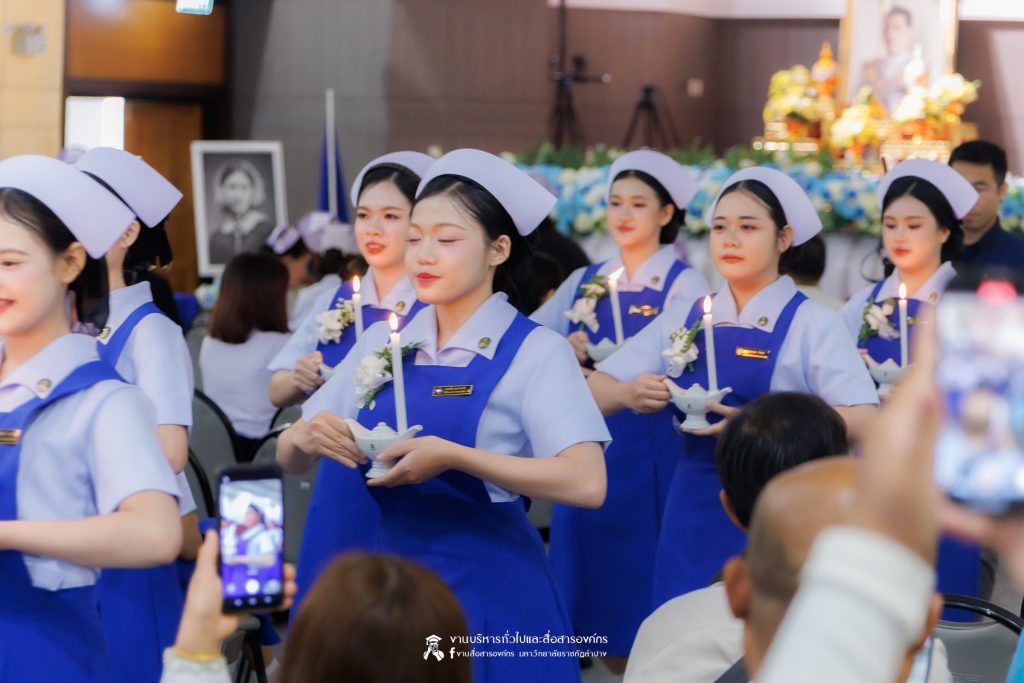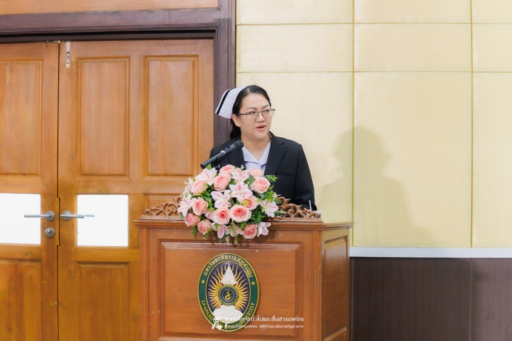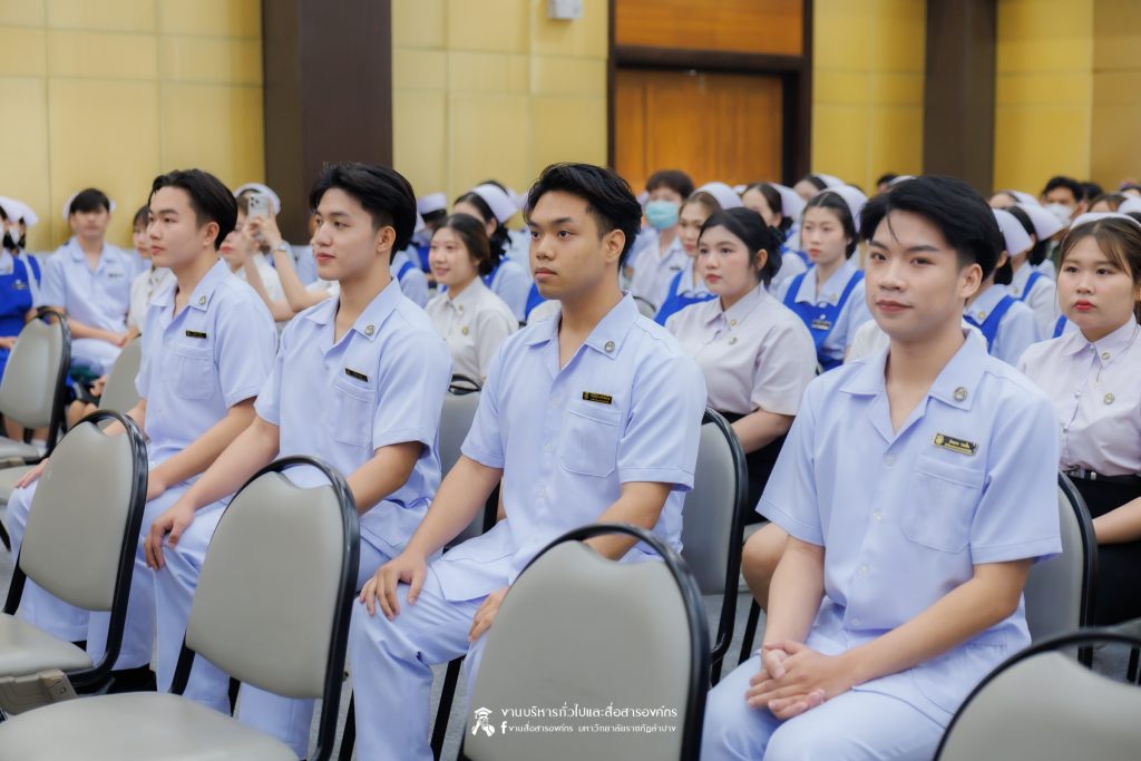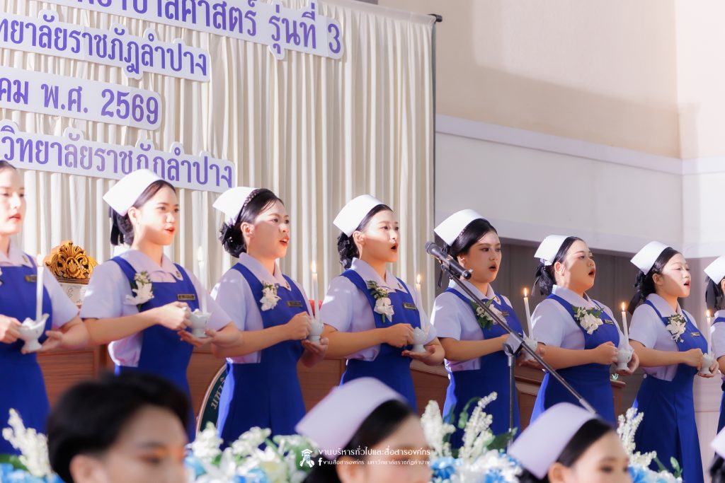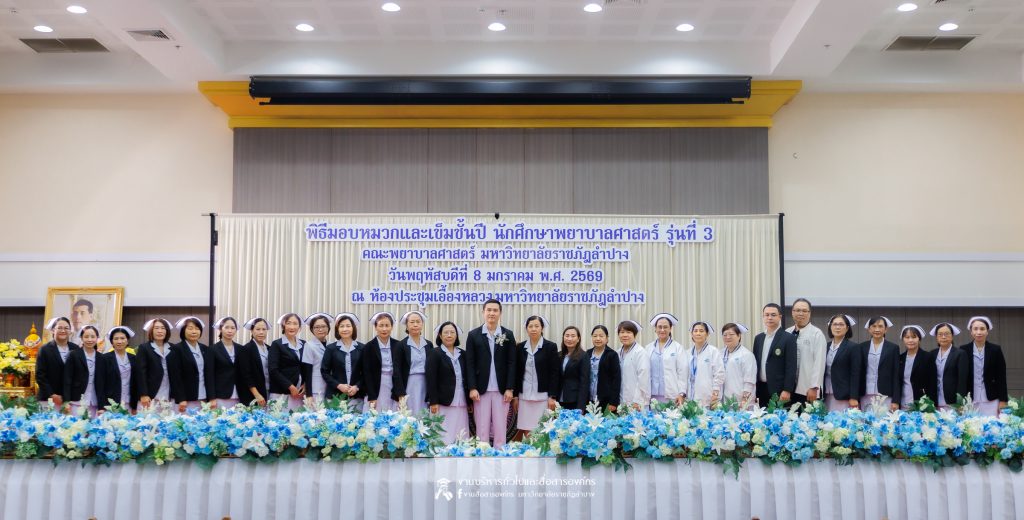คณะพยาบาลศาสตร์ มหาวิทยาลัยราชภัฏลำปาง จัดพิธีมอบหมวกและเข็มเครื่องหมายประจำชั้นปี ให้แก่นักศึกษาหลักสูตรพยาบาลศาสตรบัณฑิต ชั้นปีที่ 2 ปีการศึกษา 2568 เมื่อวันที่ 8 มกราคม 2569 ณ ห้องประชุมเอื้องหลวง อาคาร 52 คณะครุศาสตร์และคณะมนุษยศาสตร์และสังคมศาสตร์ มหาวิทยาลัยราชภัฏลำปาง โดยมี อ.ปิยธรณ์ เร่งเร็ว คณบดีคณะพยาบาลศาสตร์ เป็นประธานในพิธี พร้อมด้วยผู้บริหาร คณาจารย์ พยาบาลวิชาชีพจากแหล่งฝึก นักศึกษา และผู้ปกครอง เข้าร่วมพิธีกว่า 300 คน
