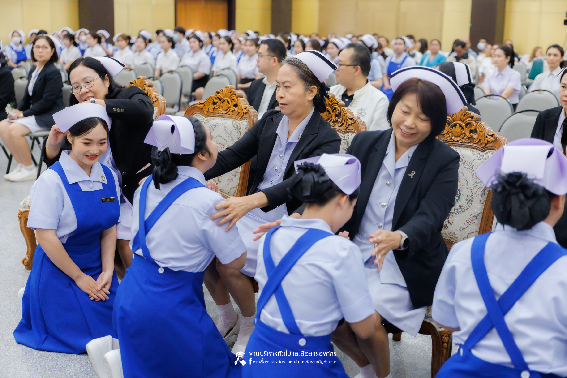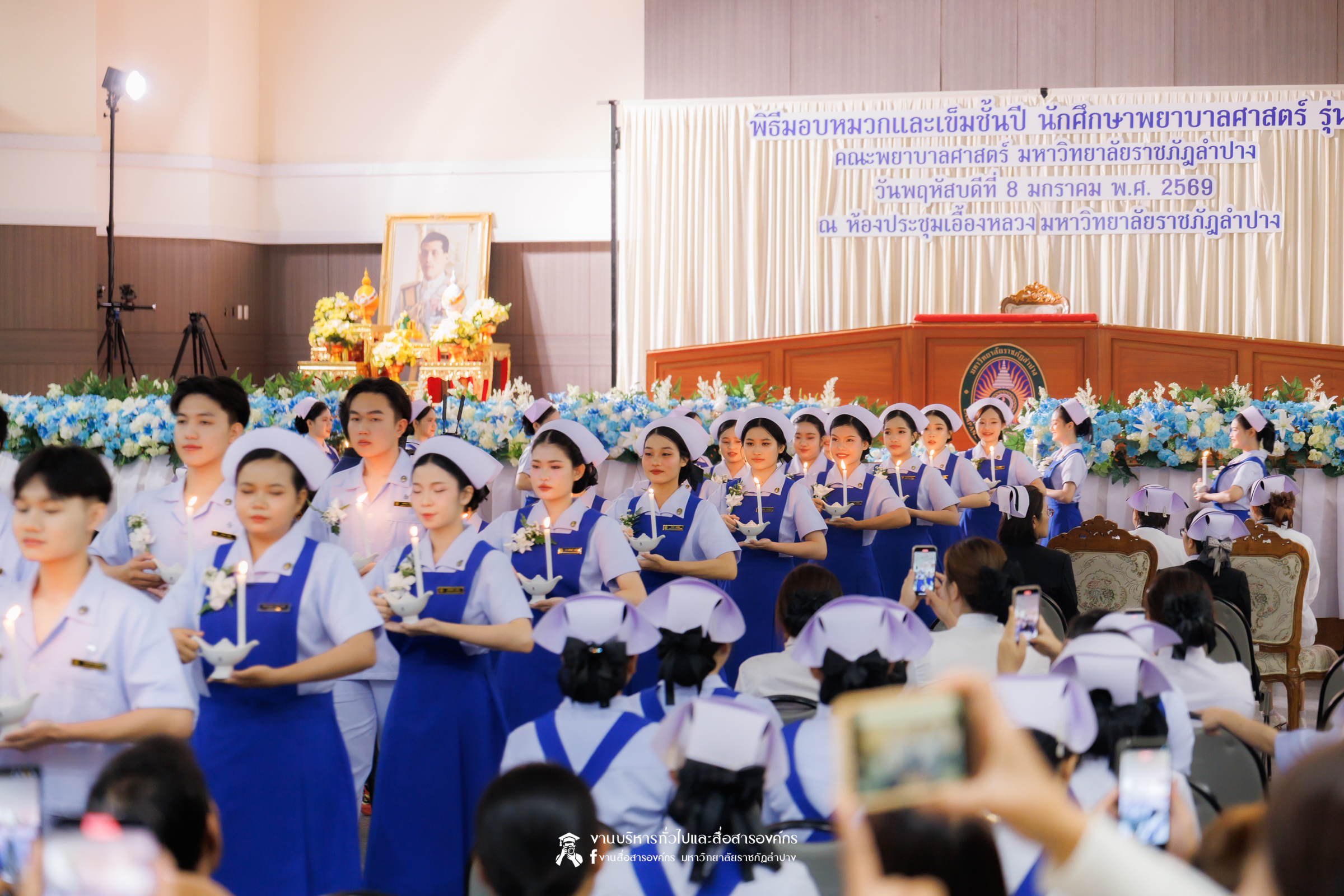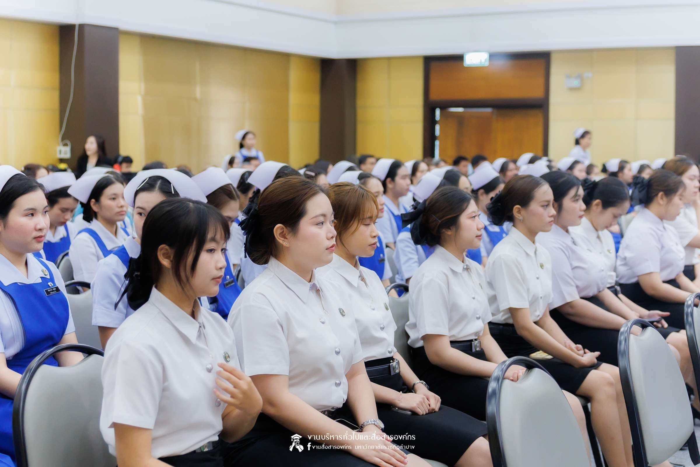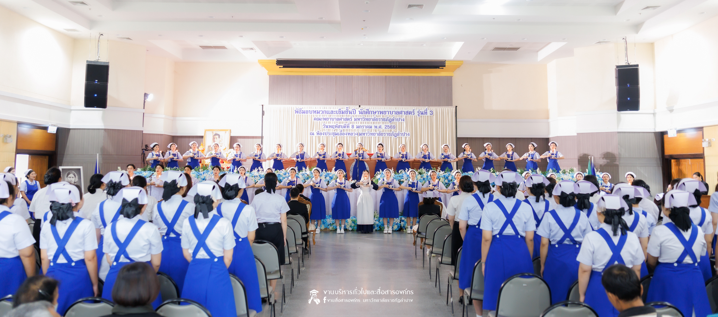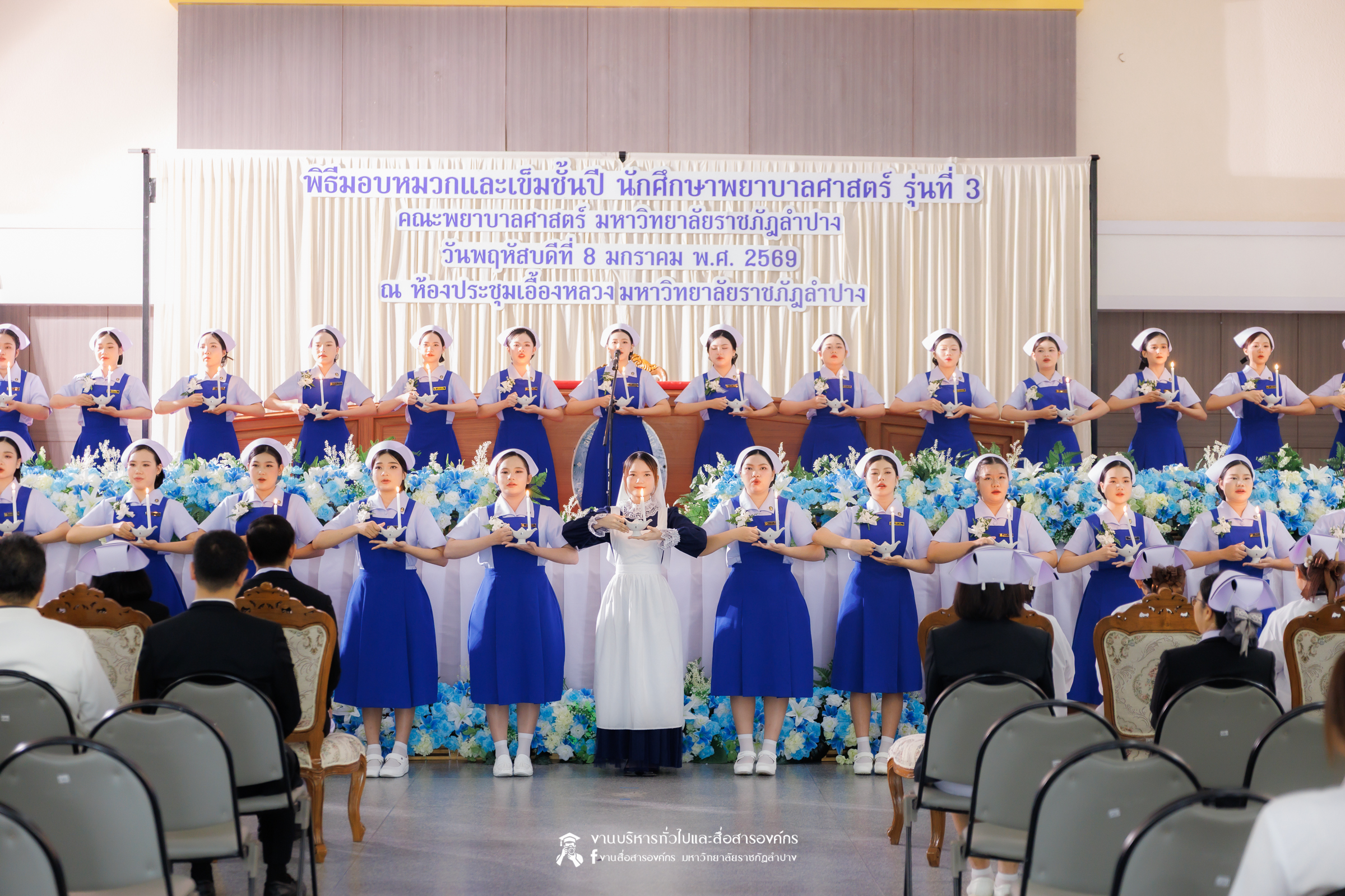 คณะพยาบาลศาสตร์ มหาวิทยาลัยราชภัฏลำปาง จัดพิธีมอบหมวกและเข็มเครื่องหมายประจำชั้นปี ให้แก่นักศึกษาหลักสูตรพยาบาลศาสตรบัณฑิต ชั้นปีที่ 2 ปีการศึกษา 2568 เมื่อวันที่ 8 มกราคม 2569 ณ ห้องประชุมเอื้องหลวง อาคาร 52 คณะครุศาสตร์และคณะมนุษยศาสตร์และสังคมศาสตร์ มหาวิทยาลัยราชภัฏลำปาง โดยมี อ.ปิยธรณ์ เร่งเร็ว คณบดีคณะพยาบาลศาสตร์ เป็นประธานในพิธี พร้อมด้วยผู้บริหาร คณาจารย์ พยาบาลวิชาชีพจากแหล่งฝึก นักศึกษา และผู้ปกครอง เข้าร่วมพิธีกว่า 300 คน