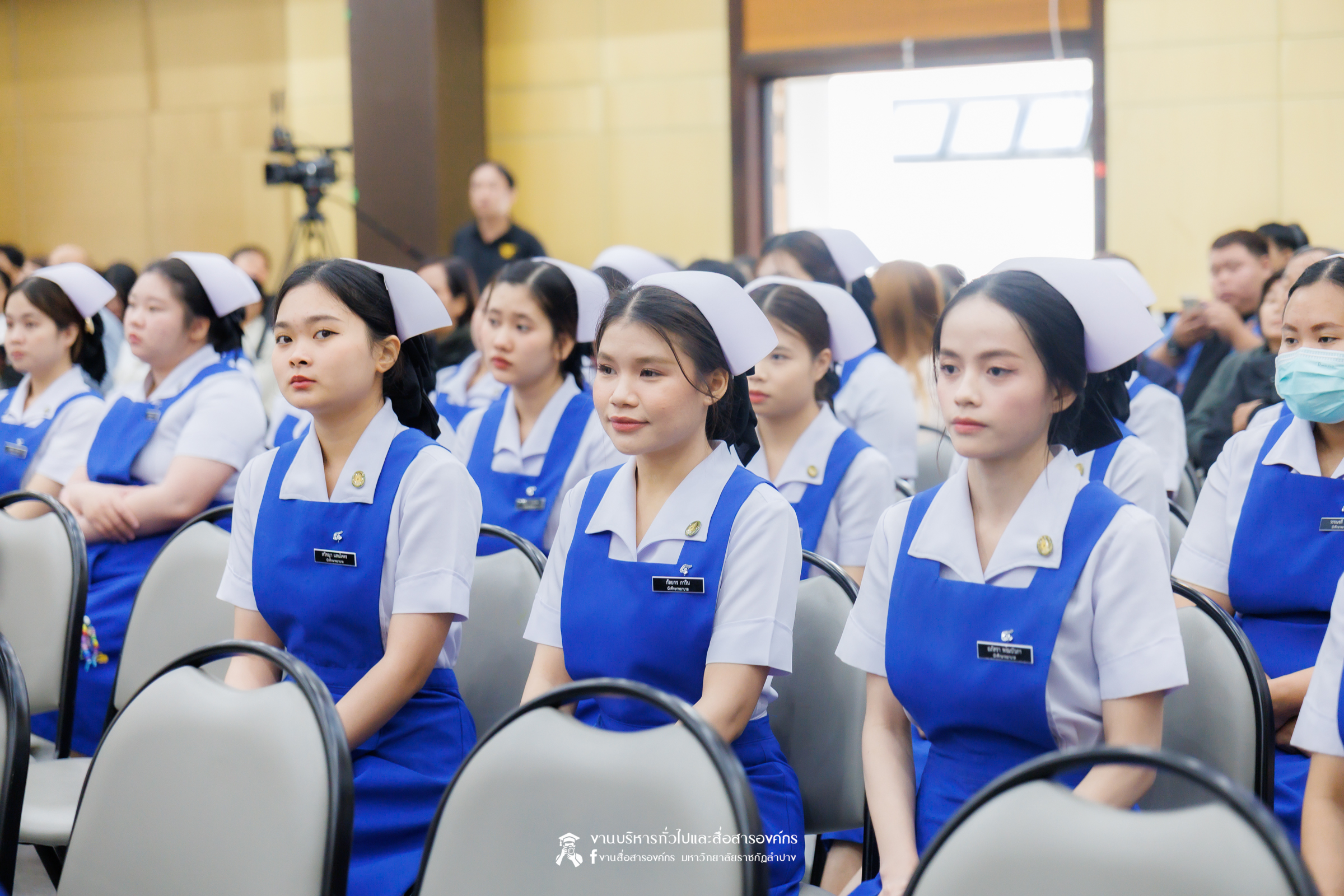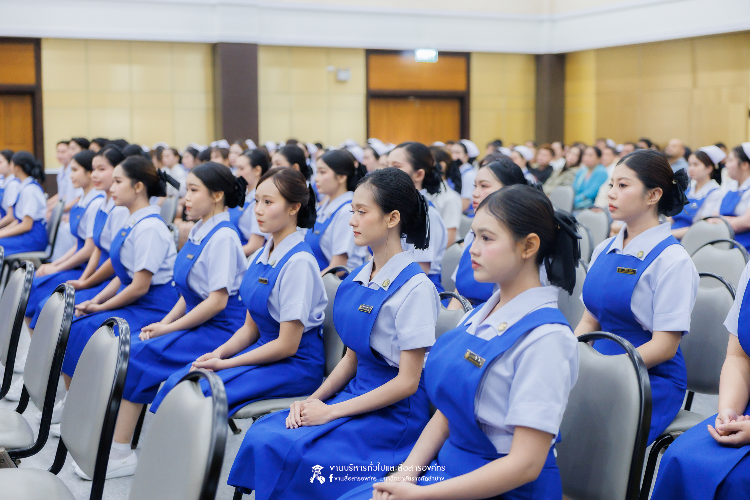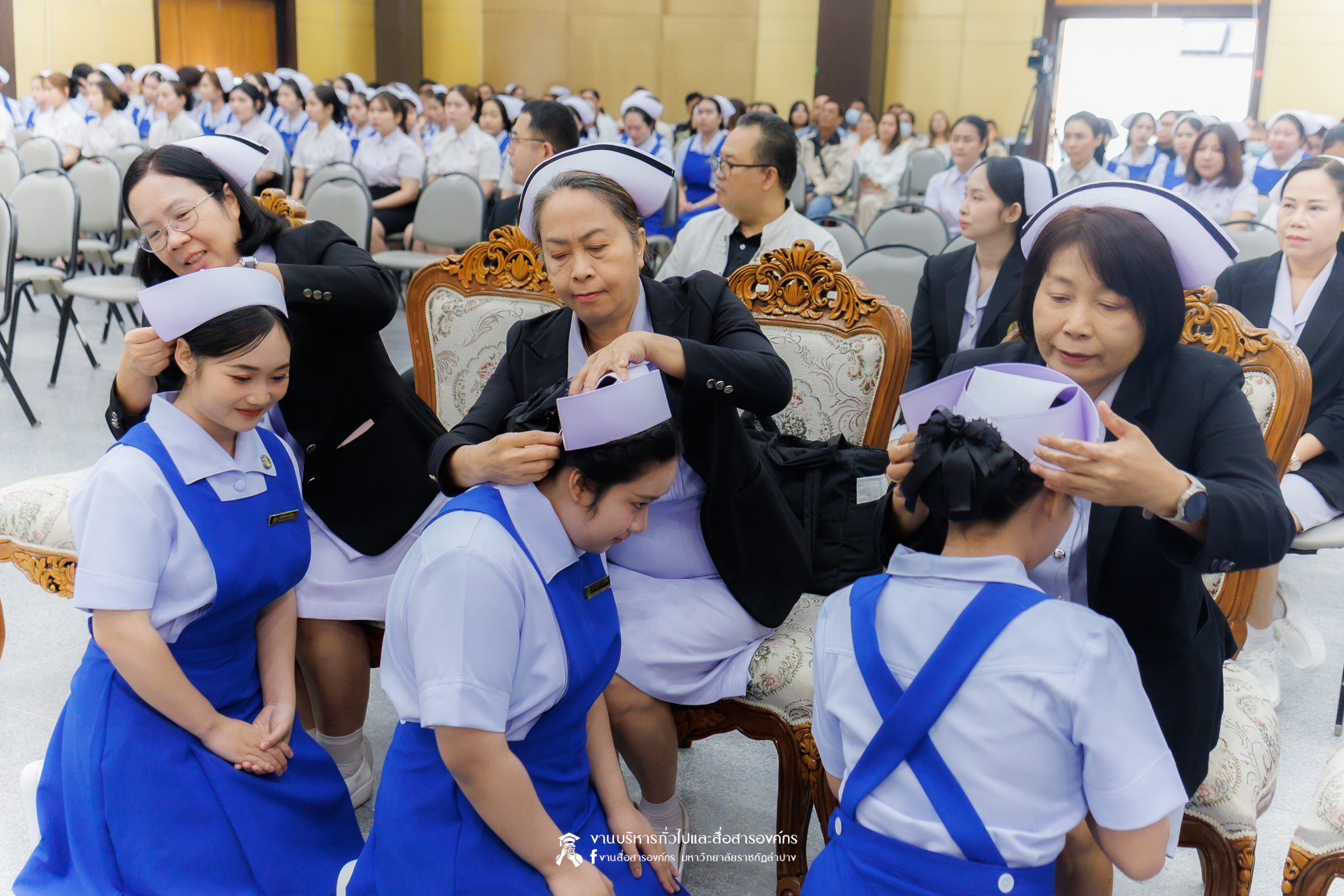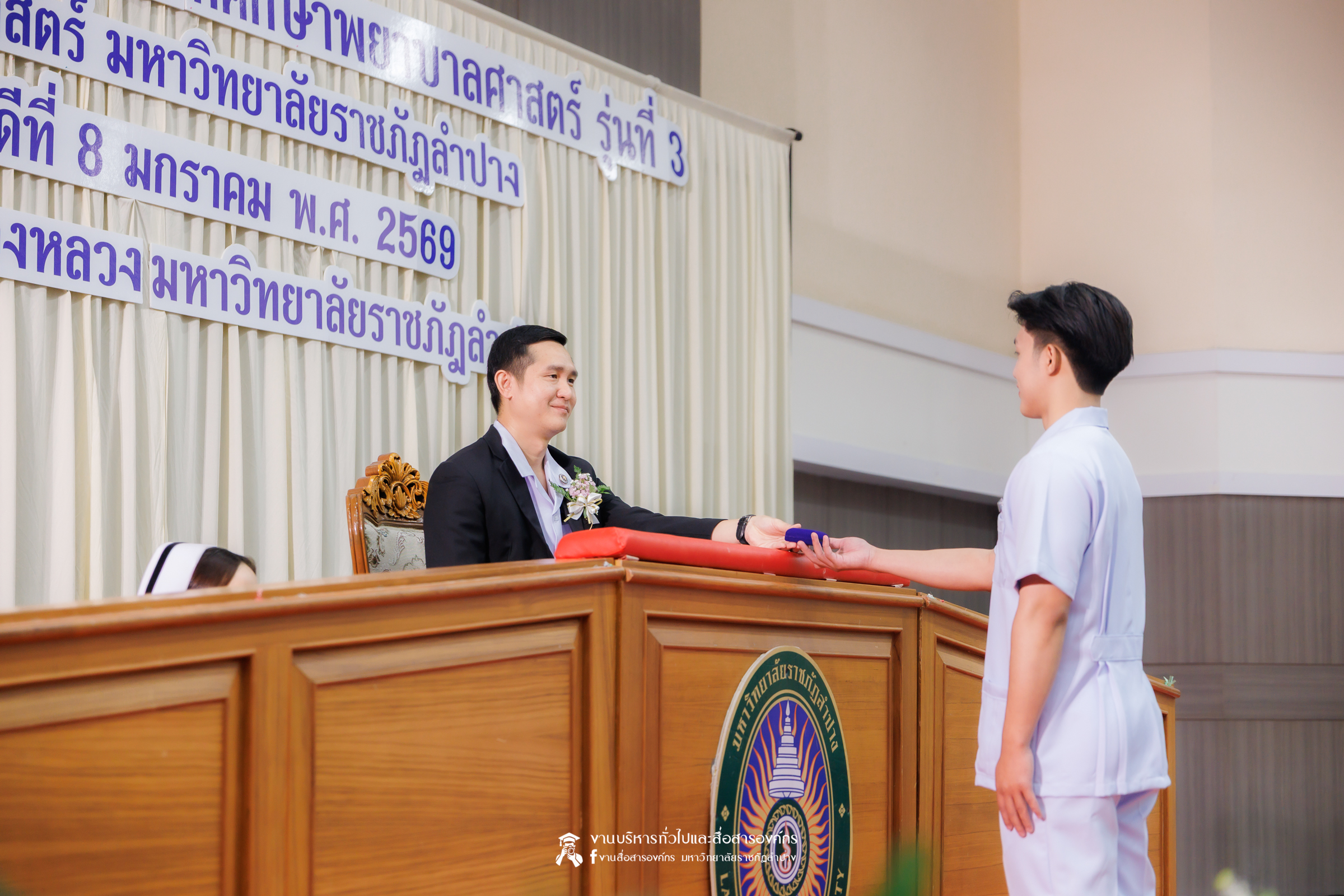 คณะพยาบาลศาสตร์ มหาวิทยาลัยราชภัฏลำปาง จัดพิธีมอบหมวกและเข็มเครื่องหมายประจำชั้นปี ให้แก่นักศึกษาหลักสูตรพยาบาลศาสตรบัณฑิต ชั้นปีที่ 2 ปีการศึกษา 2568 เมื่อวันที่ 8 มกราคม 2569 ณ ห้องประชุมเอื้องหลวง อาคาร 52 คณะครุศาสตร์และคณะมนุษยศาสตร์และสังคมศาสตร์ มหาวิทยาลัยราชภัฏลำปาง โดยมี อ.ปิยธรณ์ เร่งเร็ว คณบดีคณะพยาบาลศาสตร์ เป็นประธานในพิธี พร้อมด้วยผู้บริหาร คณาจารย์ พยาบาลวิชาชีพจากแหล่งฝึก นักศึกษา และผู้ปกครอง เข้าร่วมพิธีกว่า 300 คน