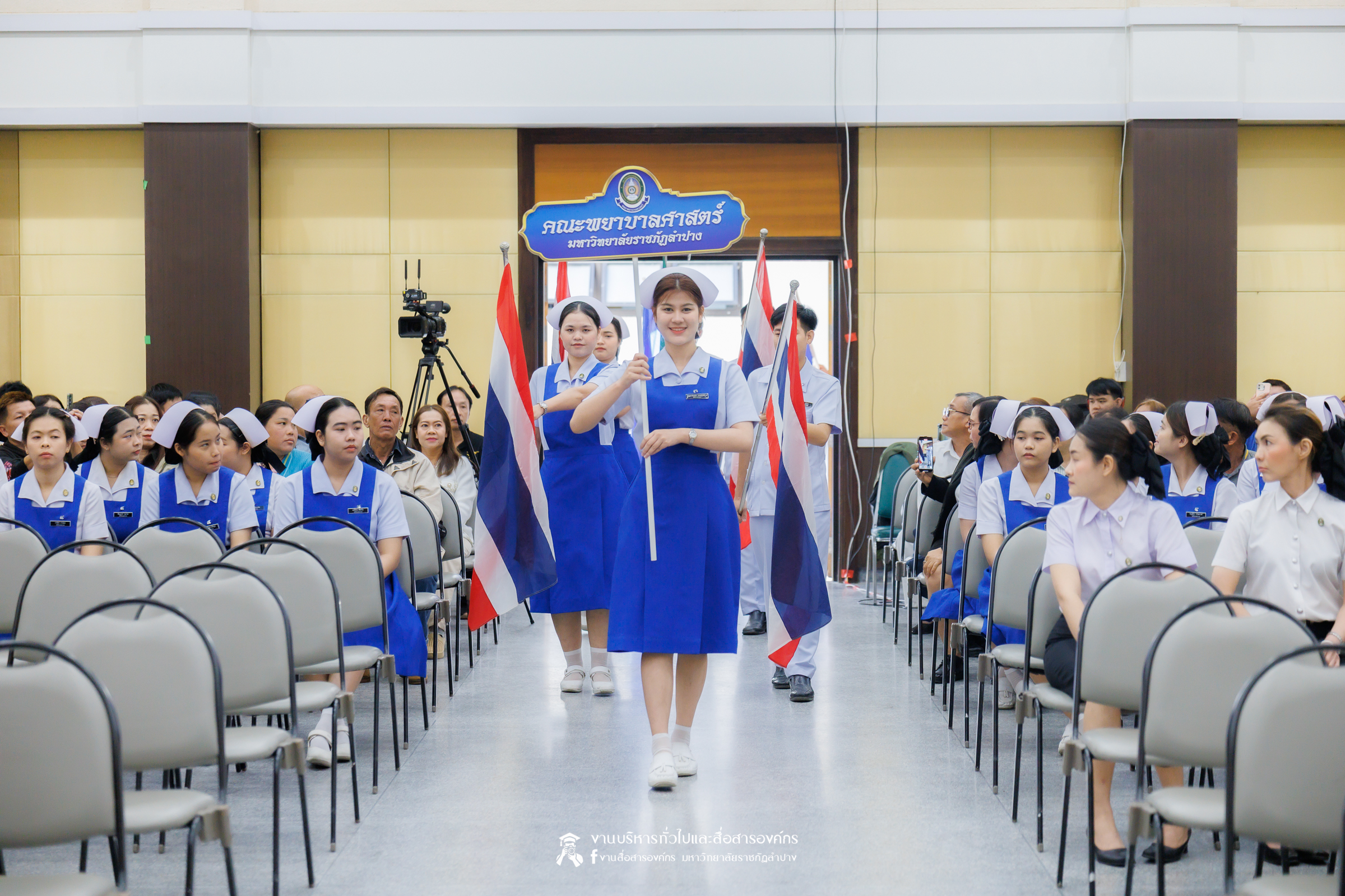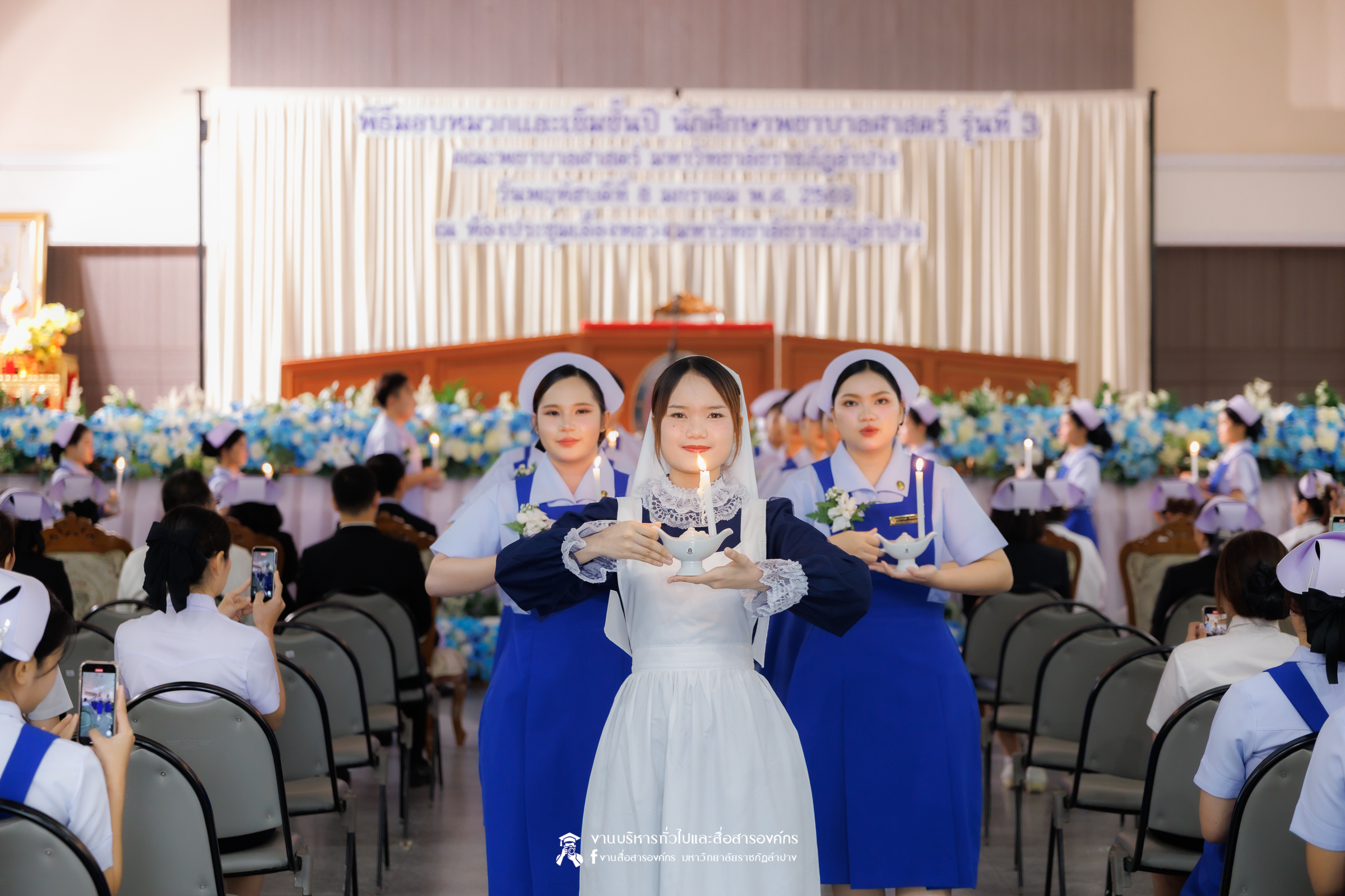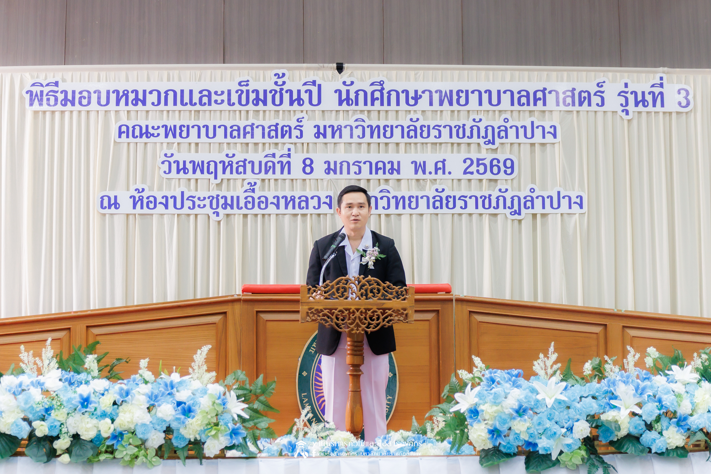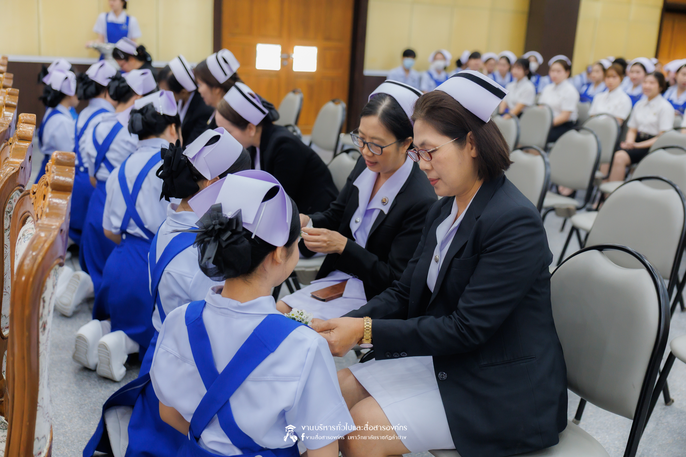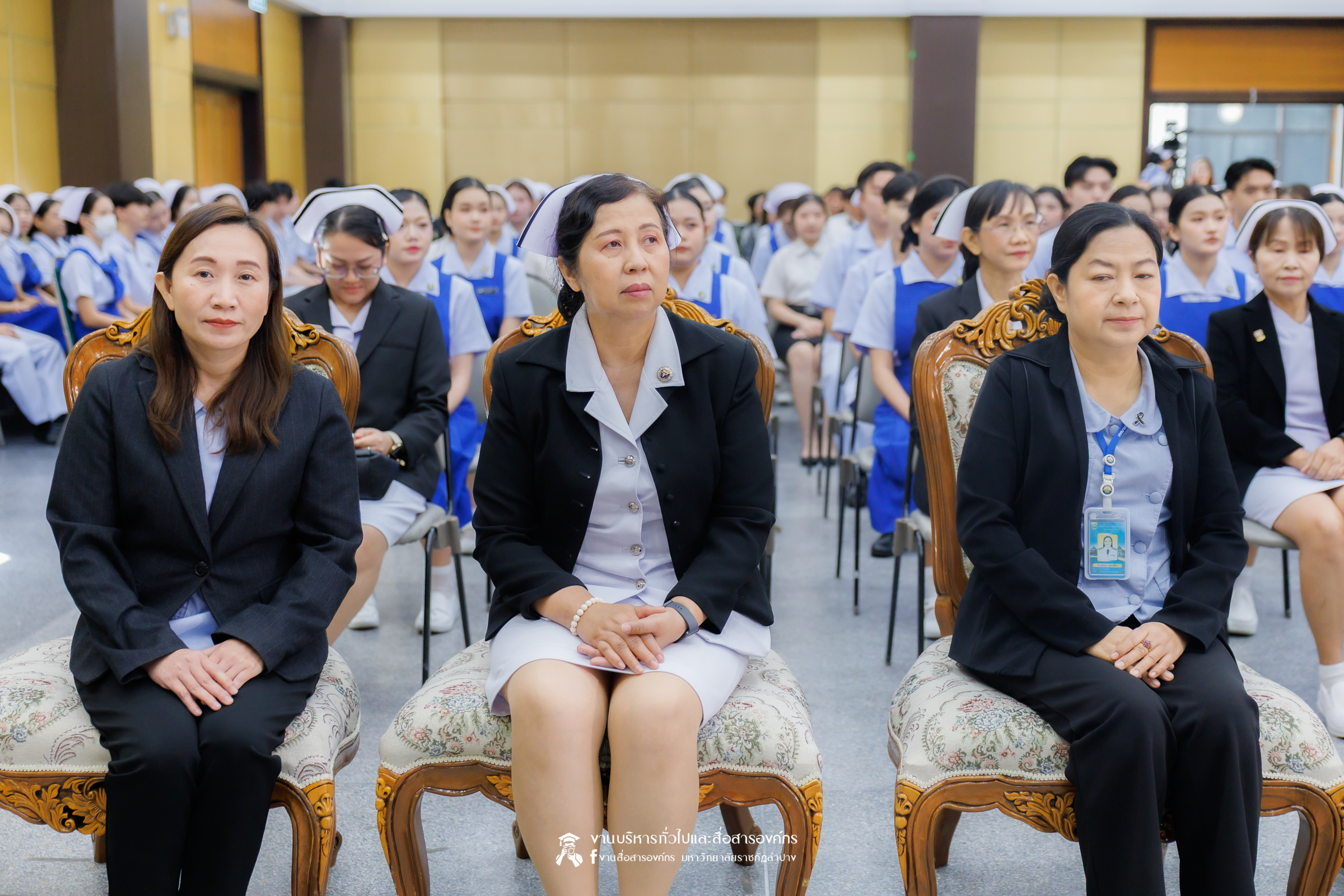 คณะพยาบาลศาสตร์ มหาวิทยาลัยราชภัฏลำปาง จัดพิธีมอบหมวกและเข็มเครื่องหมายประจำชั้นปี ให้แก่นักศึกษาหลักสูตรพยาบาลศาสตรบัณฑิต ชั้นปีที่ 2 ปีการศึกษา 2568 เมื่อวันที่ 8 มกราคม 2569 ณ ห้องประชุมเอื้องหลวง อาคาร 52 คณะครุศาสตร์และคณะมนุษยศาสตร์และสังคมศาสตร์ มหาวิทยาลัยราชภัฏลำปาง โดยมี อ.ปิยธรณ์ เร่งเร็ว คณบดีคณะพยาบาลศาสตร์ เป็นประธานในพิธี พร้อมด้วยผู้บริหาร คณาจารย์ พยาบาลวิชาชีพจากแหล่งฝึก นักศึกษา และผู้ปกครอง เข้าร่วมพิธีกว่า 300 คน