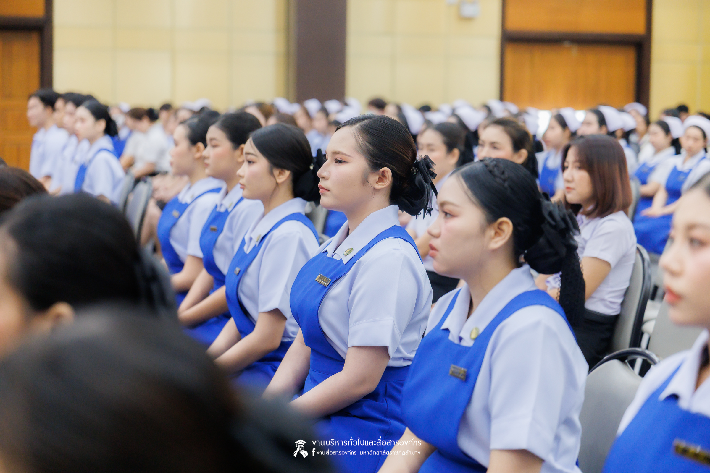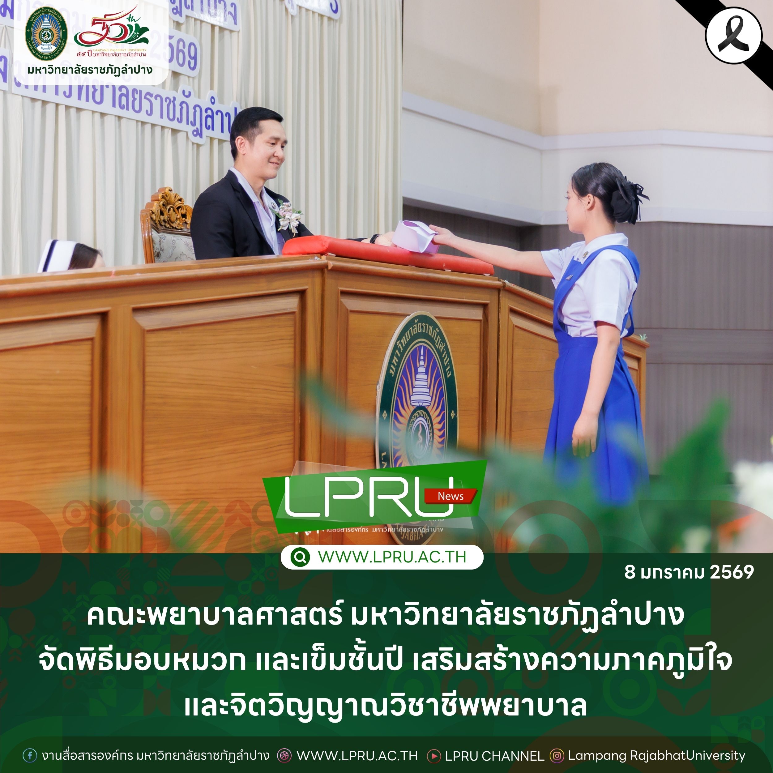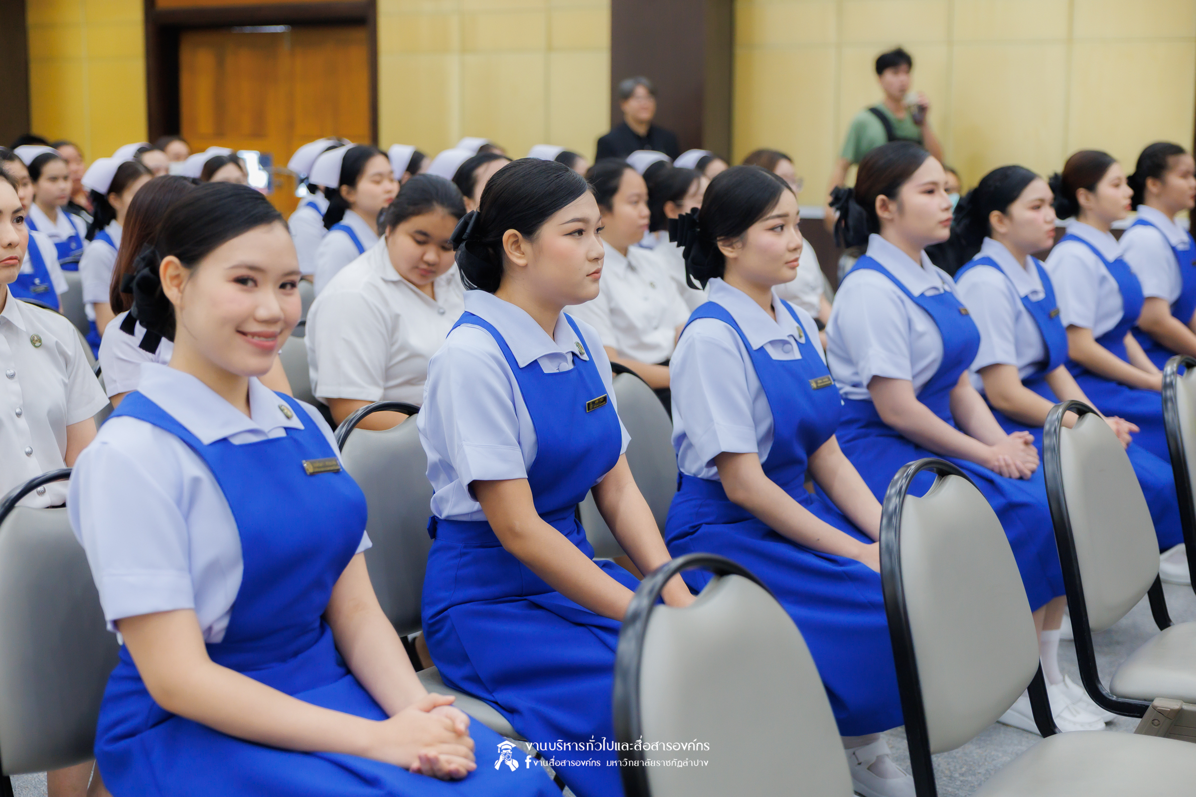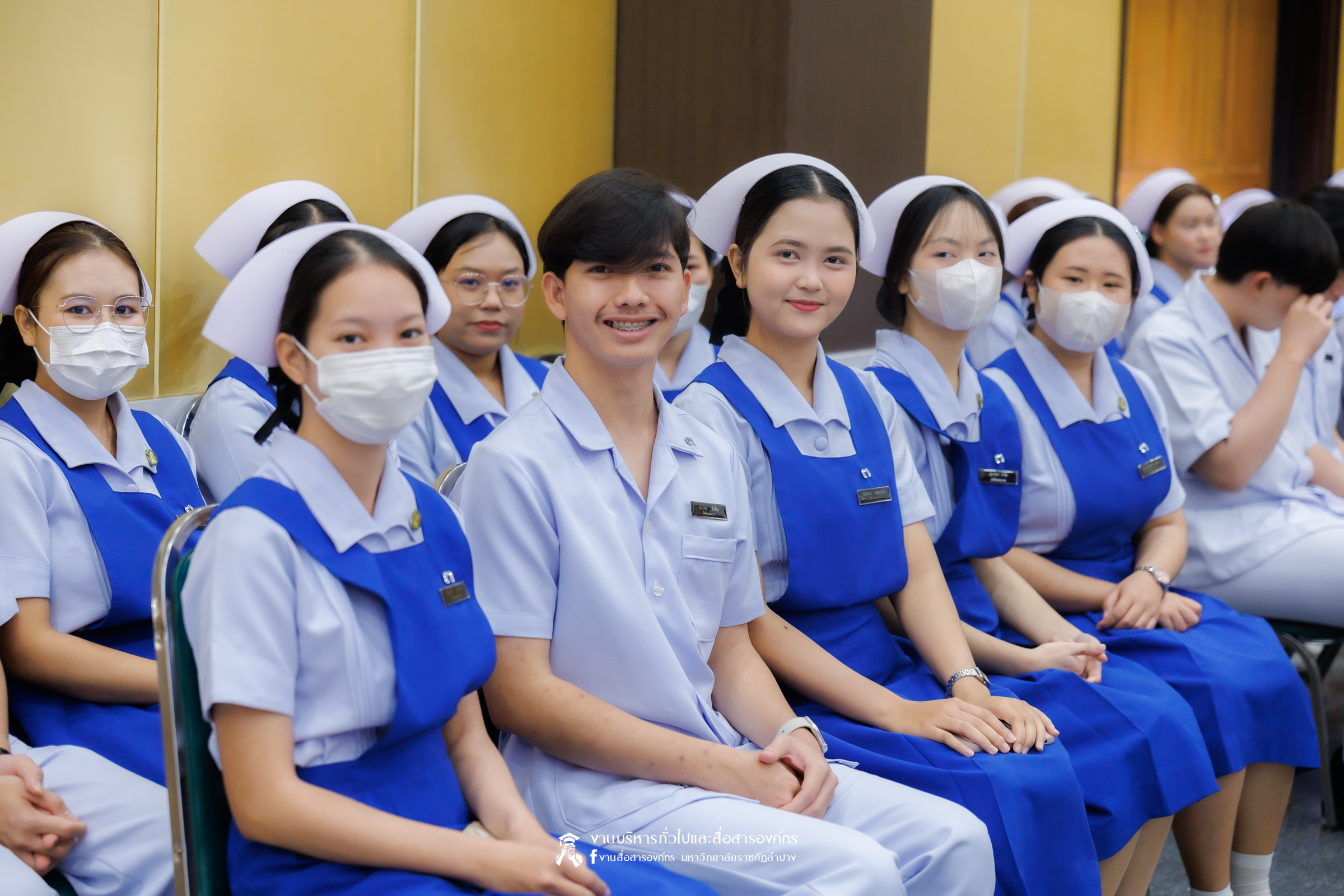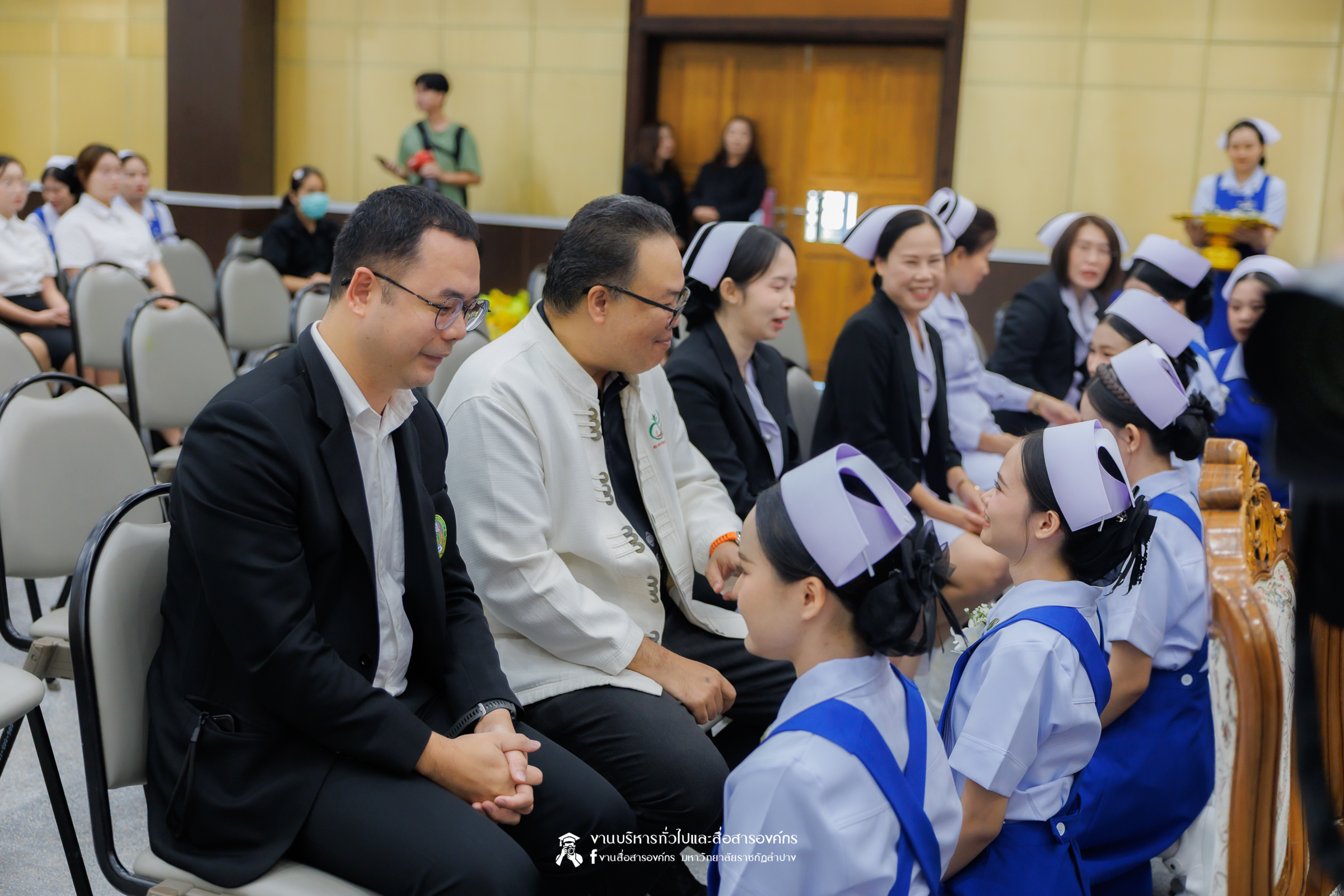 คณะพยาบาลศาสตร์ มหาวิทยาลัยราชภัฏลำปาง จัดพิธีมอบหมวกและเข็มเครื่องหมายประจำชั้นปี ให้แก่นักศึกษาหลักสูตรพยาบาลศาสตรบัณฑิต ชั้นปีที่ 2 ปีการศึกษา 2568 เมื่อวันที่ 8 มกราคม 2569 ณ ห้องประชุมเอื้องหลวง อาคาร 52 คณะครุศาสตร์และคณะมนุษยศาสตร์และสังคมศาสตร์ มหาวิทยาลัยราชภัฏลำปาง โดยมี อ.ปิยธรณ์ เร่งเร็ว คณบดีคณะพยาบาลศาสตร์ เป็นประธานในพิธี พร้อมด้วยผู้บริหาร คณาจารย์ พยาบาลวิชาชีพจากแหล่งฝึก นักศึกษา และผู้ปกครอง เข้าร่วมพิธีกว่า 300 คน