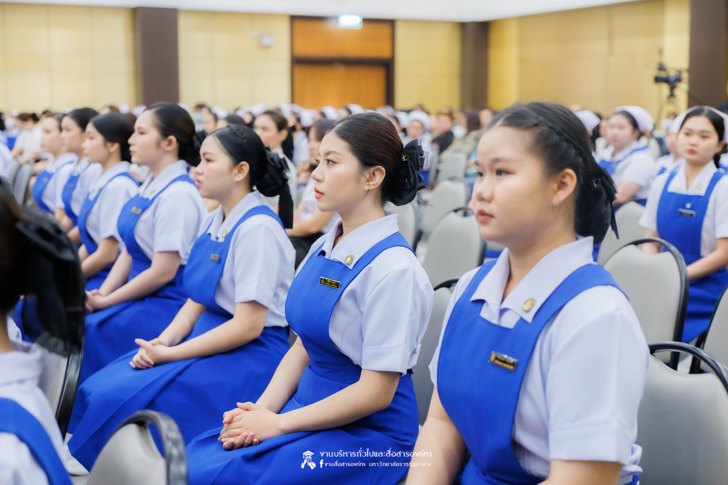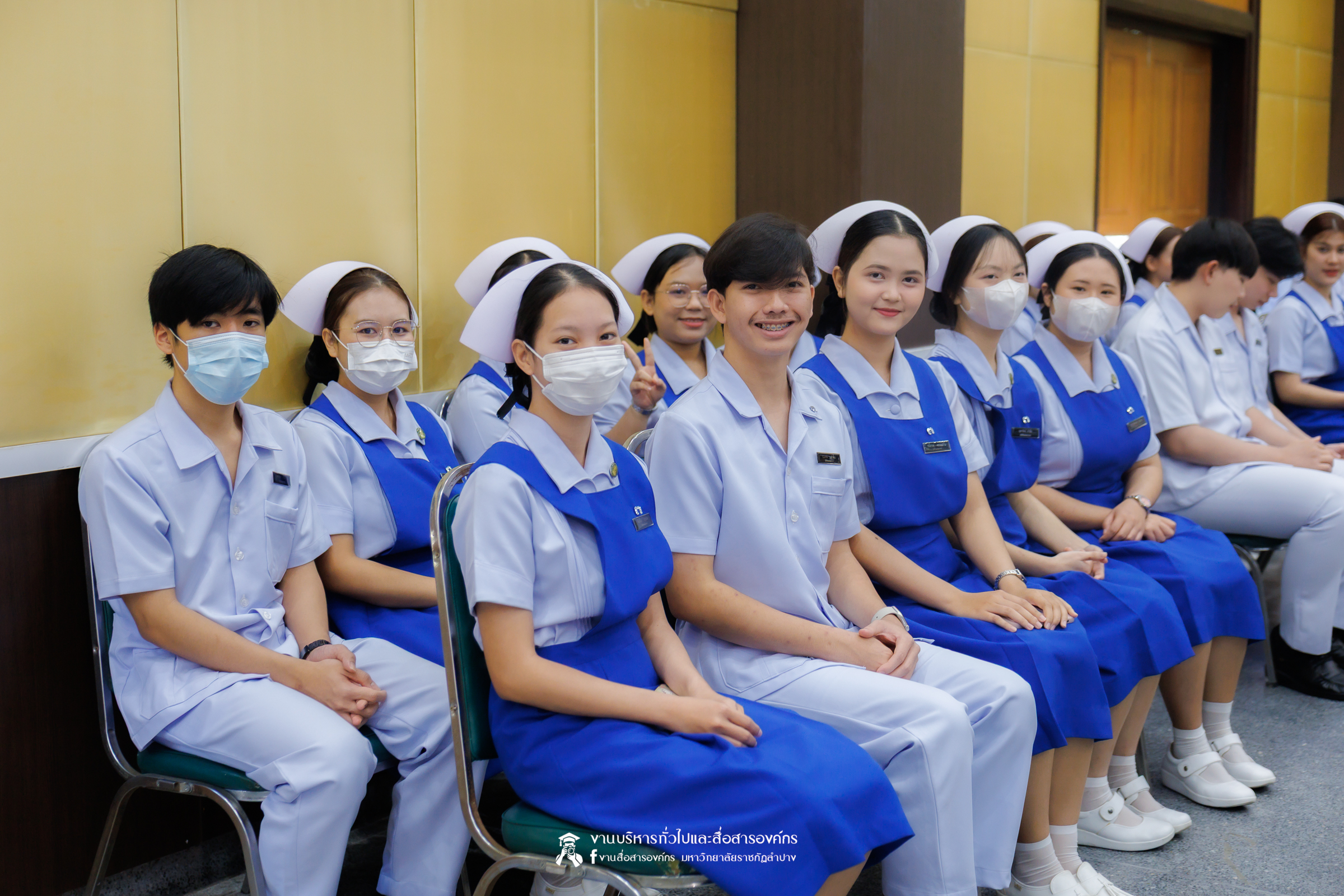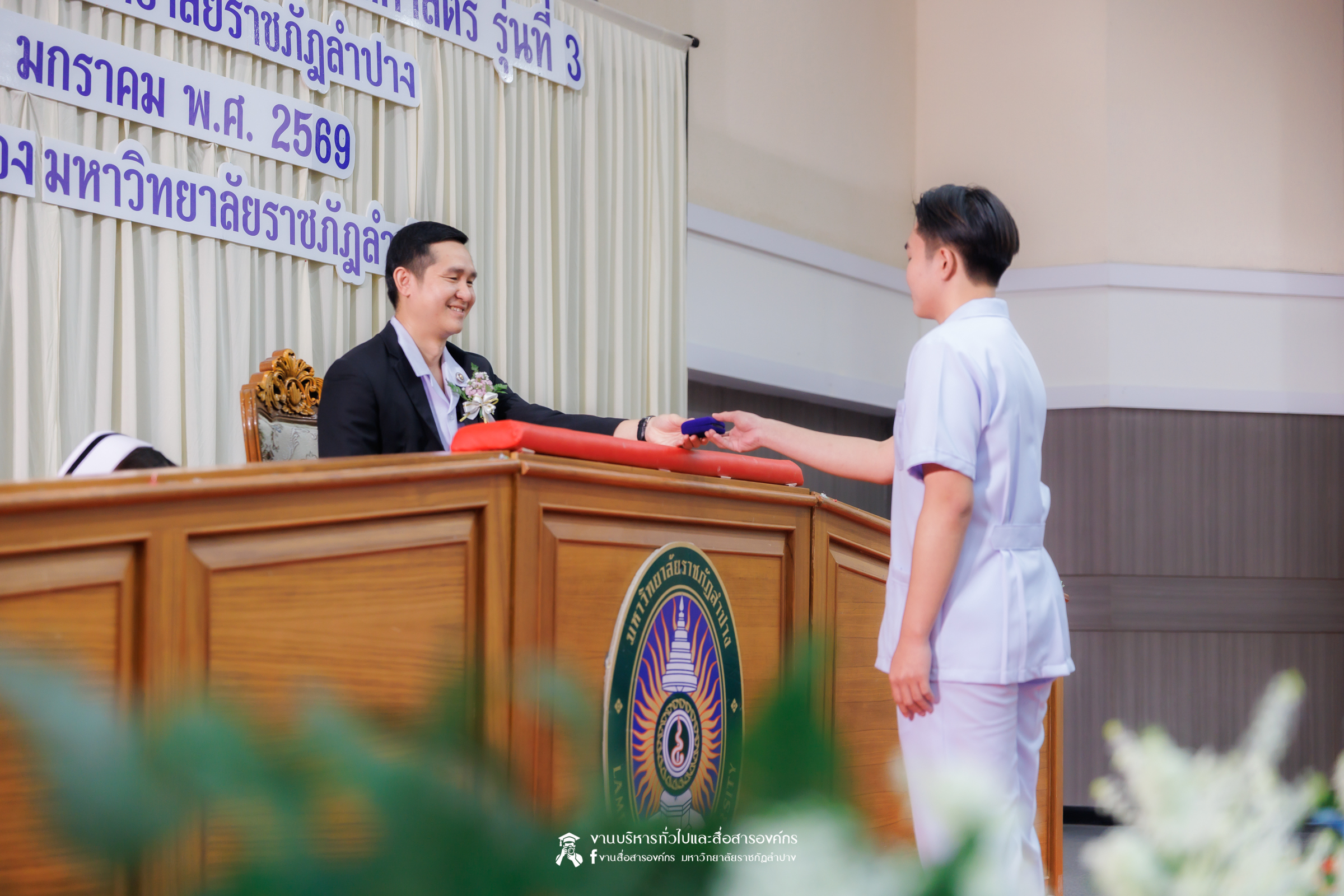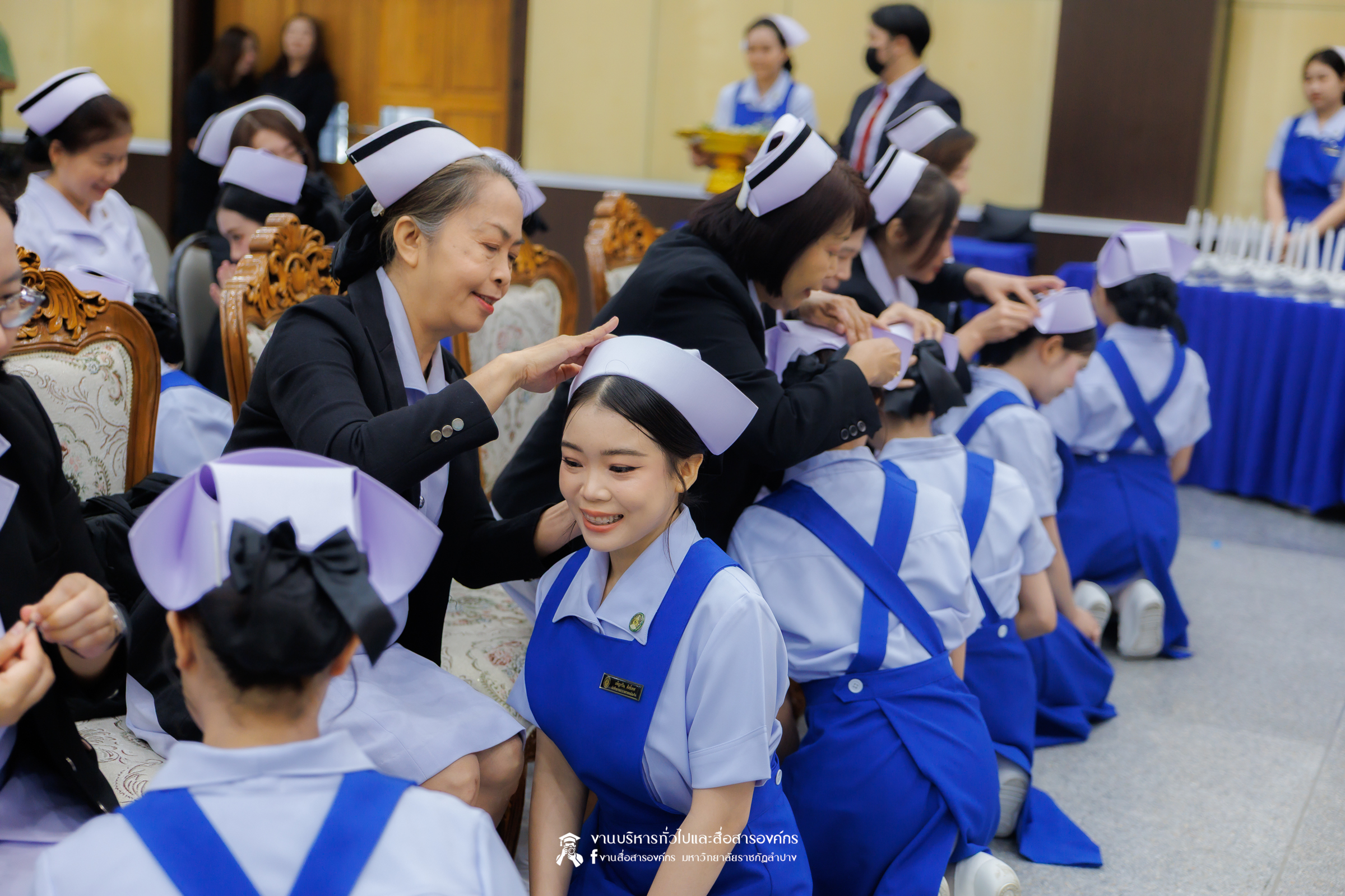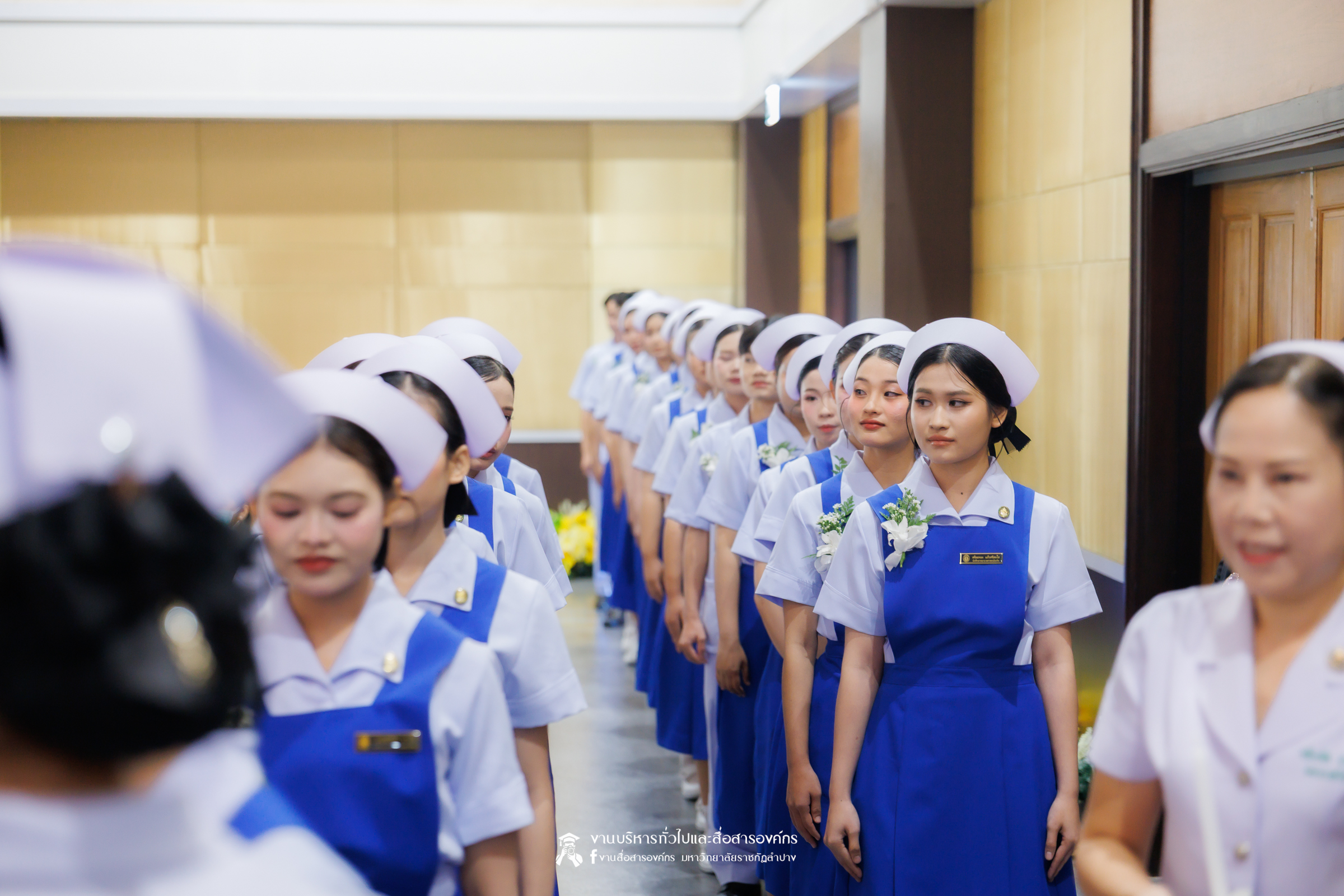 คณะพยาบาลศาสตร์ มหาวิทยาลัยราชภัฏลำปาง จัดพิธีมอบหมวกและเข็มเครื่องหมายประจำชั้นปี ให้แก่นักศึกษาหลักสูตรพยาบาลศาสตรบัณฑิต ชั้นปีที่ 2 ปีการศึกษา 2568 เมื่อวันที่ 8 มกราคม 2569 ณ ห้องประชุมเอื้องหลวง อาคาร 52 คณะครุศาสตร์และคณะมนุษยศาสตร์และสังคมศาสตร์ มหาวิทยาลัยราชภัฏลำปาง โดยมี อ.ปิยธรณ์ เร่งเร็ว คณบดีคณะพยาบาลศาสตร์ เป็นประธานในพิธี พร้อมด้วยผู้บริหาร คณาจารย์ พยาบาลวิชาชีพจากแหล่งฝึก นักศึกษา และผู้ปกครอง เข้าร่วมพิธีกว่า 300 คน