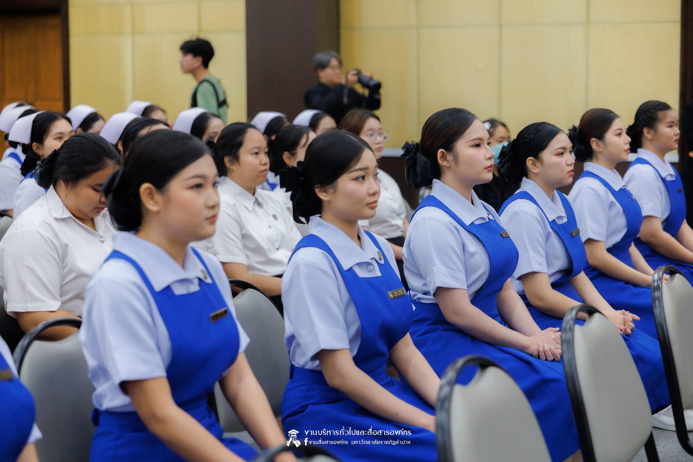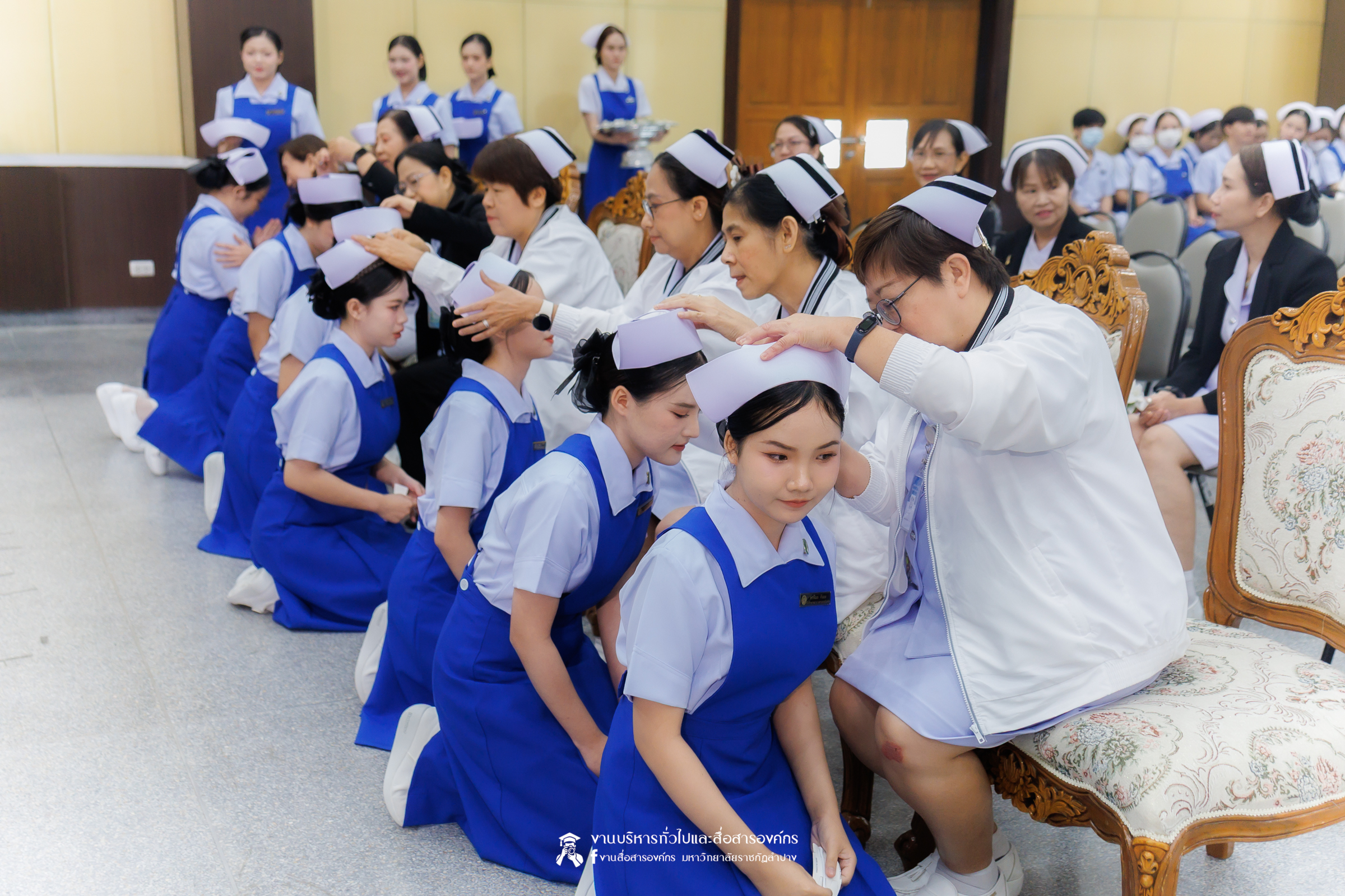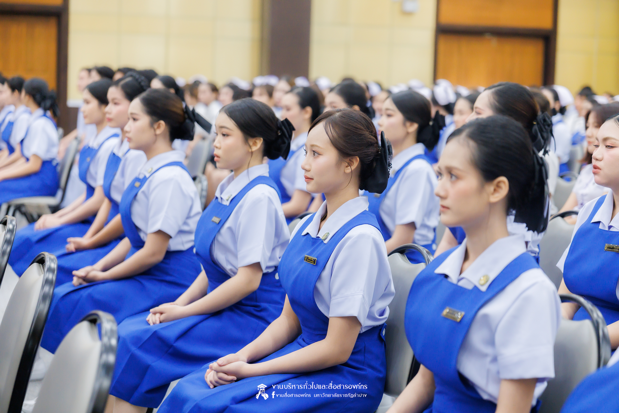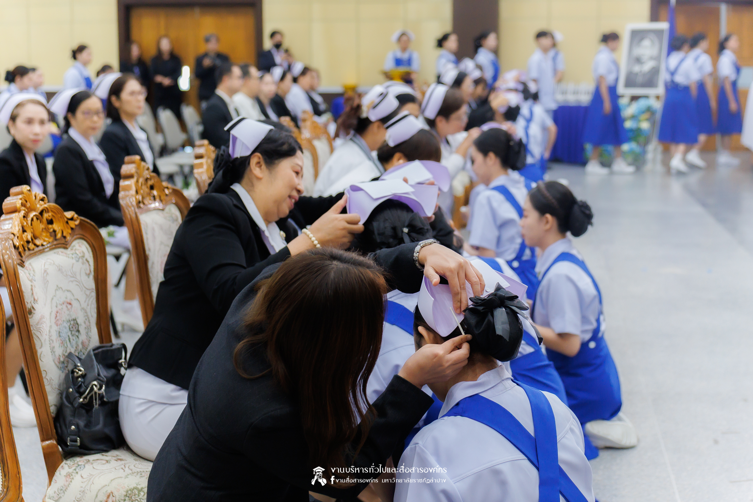 คณะพยาบาลศาสตร์ มหาวิทยาลัยราชภัฏลำปาง จัดพิธีมอบหมวกและเข็มเครื่องหมายประจำชั้นปี ให้แก่นักศึกษาหลักสูตรพยาบาลศาสตรบัณฑิต ชั้นปีที่ 2 ปีการศึกษา 2568 เมื่อวันที่ 8 มกราคม 2569 ณ ห้องประชุมเอื้องหลวง อาคาร 52 คณะครุศาสตร์และคณะมนุษยศาสตร์และสังคมศาสตร์ มหาวิทยาลัยราชภัฏลำปาง โดยมี อ.ปิยธรณ์ เร่งเร็ว คณบดีคณะพยาบาลศาสตร์ เป็นประธานในพิธี พร้อมด้วยผู้บริหาร คณาจารย์ พยาบาลวิชาชีพจากแหล่งฝึก นักศึกษา และผู้ปกครอง เข้าร่วมพิธีกว่า 300 คน