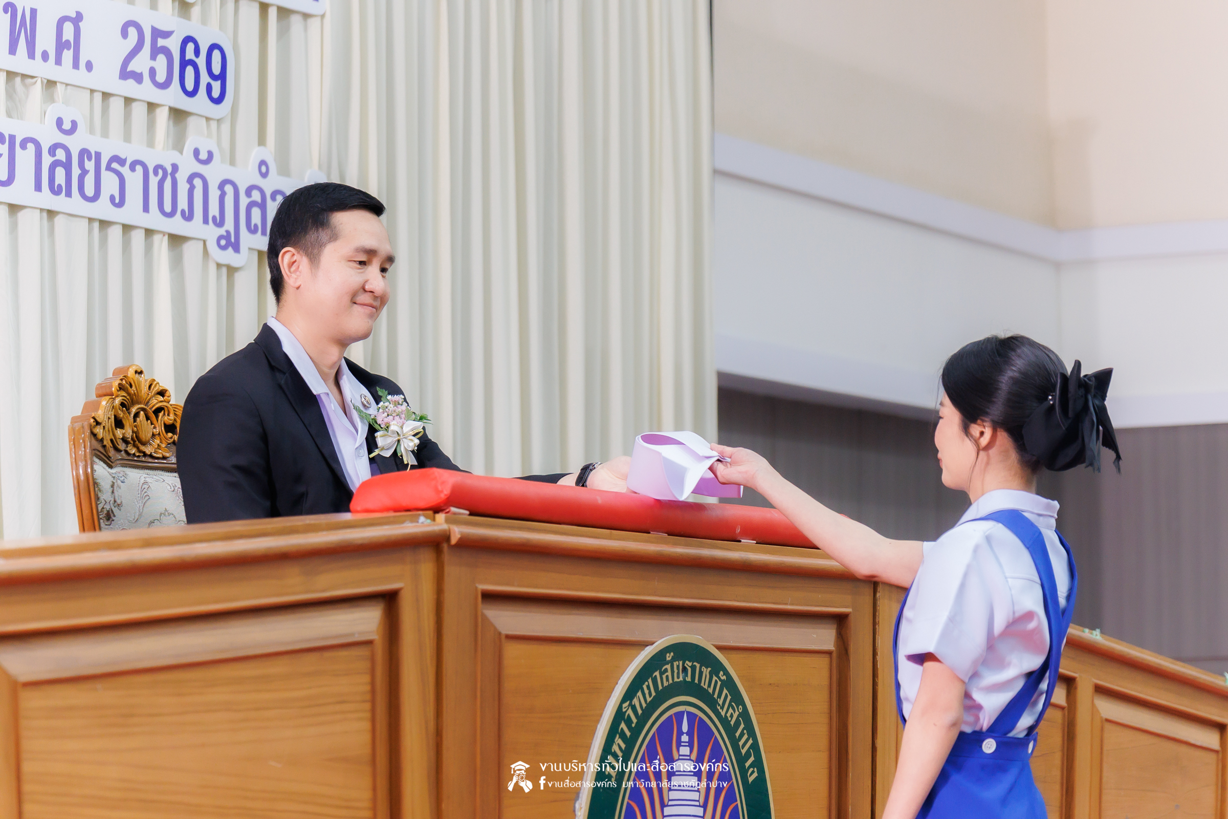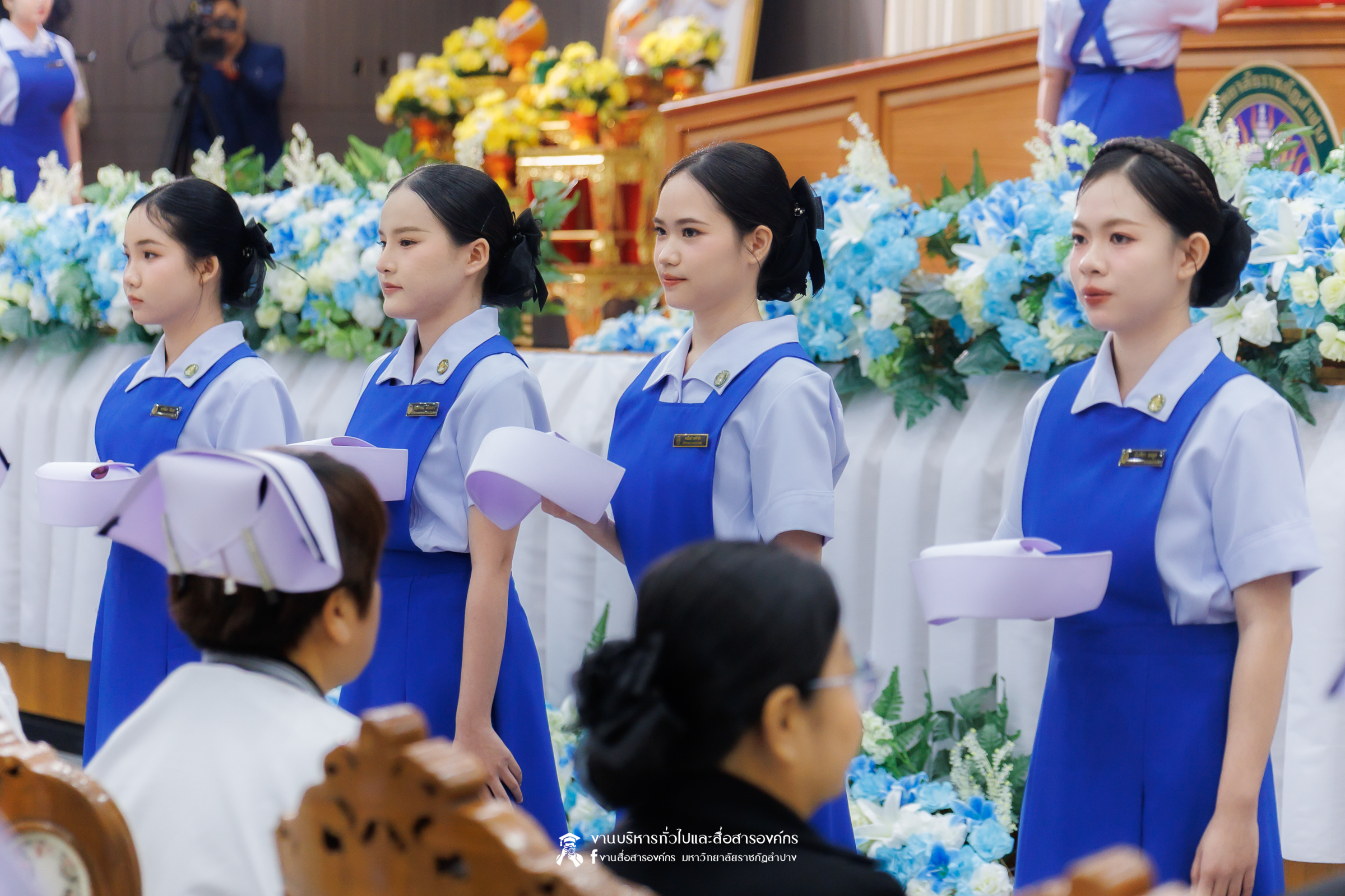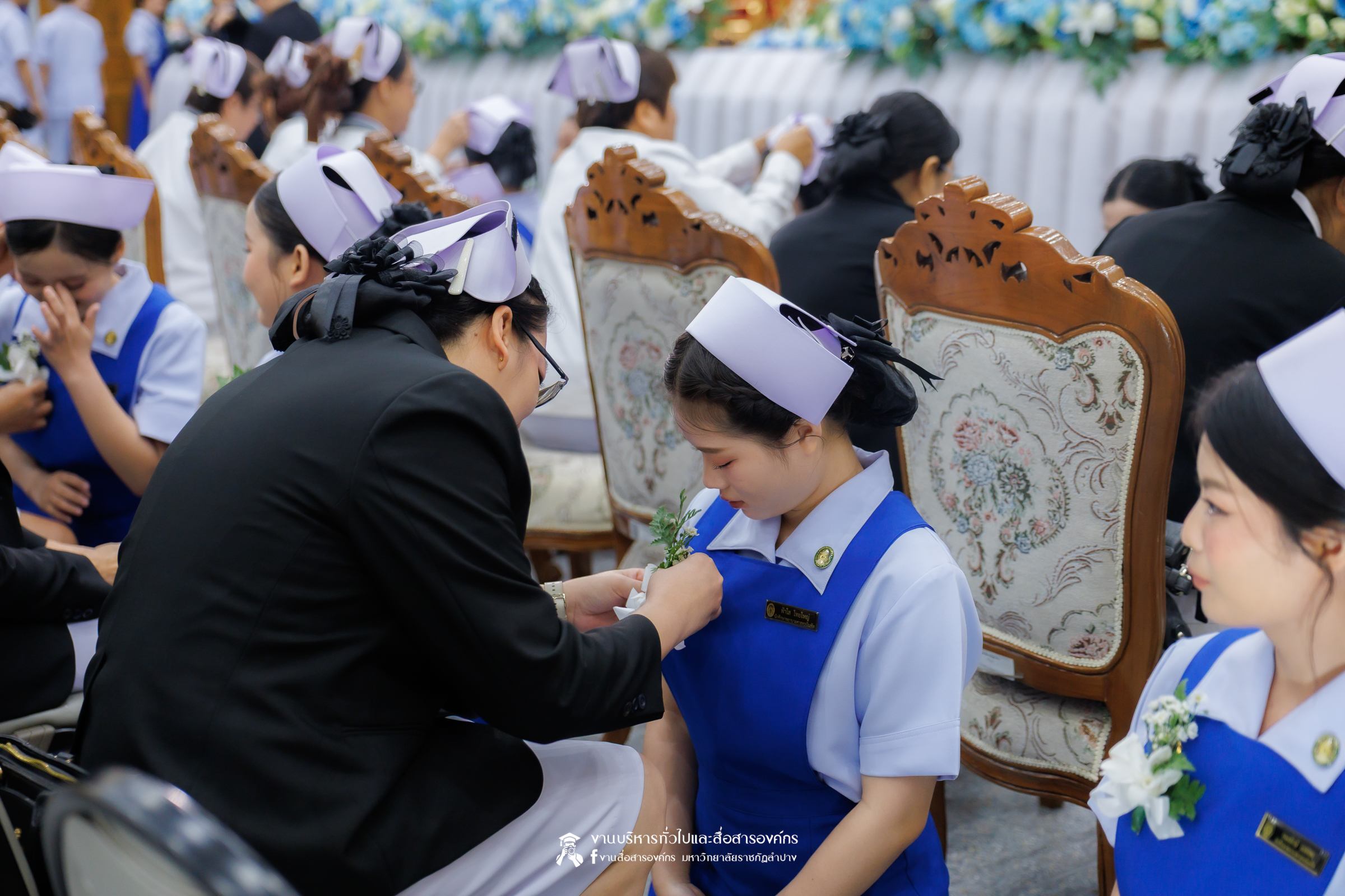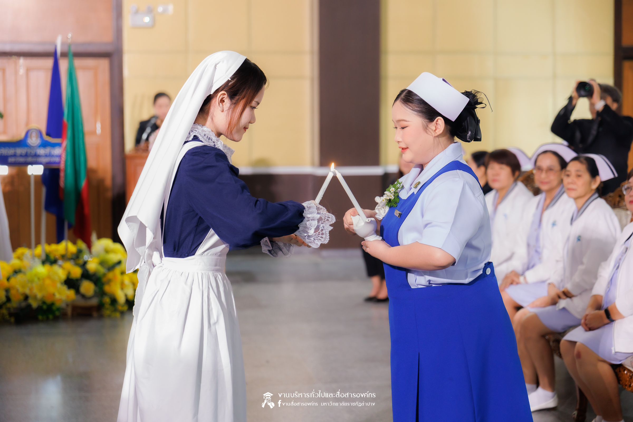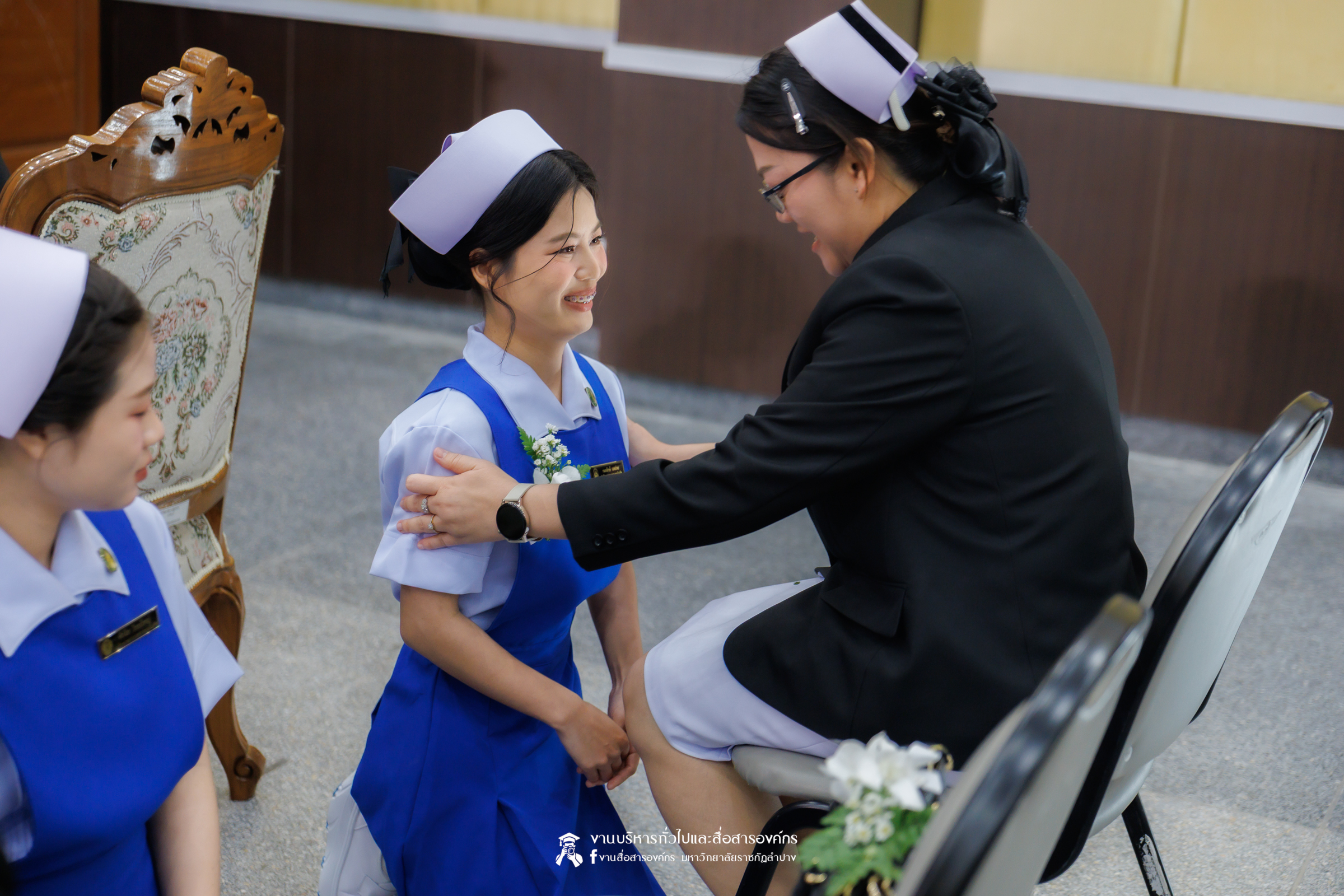 คณะพยาบาลศาสตร์ มหาวิทยาลัยราชภัฏลำปาง จัดพิธีมอบหมวกและเข็มเครื่องหมายประจำชั้นปี ให้แก่นักศึกษาหลักสูตรพยาบาลศาสตรบัณฑิต ชั้นปีที่ 2 ปีการศึกษา 2568 เมื่อวันที่ 8 มกราคม 2569 ณ ห้องประชุมเอื้องหลวง อาคาร 52 คณะครุศาสตร์และคณะมนุษยศาสตร์และสังคมศาสตร์ มหาวิทยาลัยราชภัฏลำปาง โดยมี อ.ปิยธรณ์ เร่งเร็ว คณบดีคณะพยาบาลศาสตร์ เป็นประธานในพิธี พร้อมด้วยผู้บริหาร คณาจารย์ พยาบาลวิชาชีพจากแหล่งฝึก นักศึกษา และผู้ปกครอง เข้าร่วมพิธีกว่า 300 คน