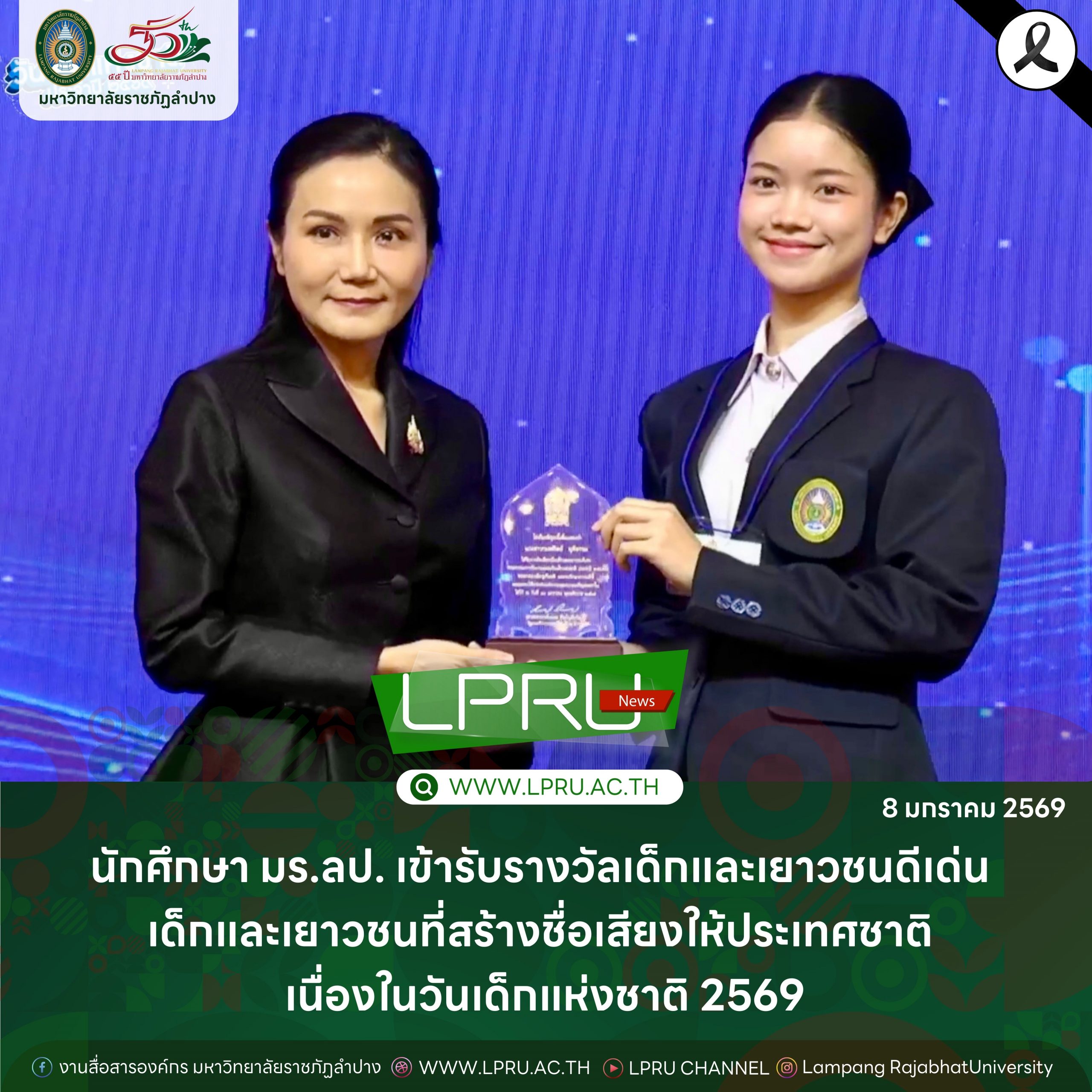 นักศึกษา มร.ลป. เข้ารับรางวัลเด็กและเยาวชนดีเด่น เด็กและเยาวชนที่สร้างชื่อเสียงให้ประเทศชาติ เนื่องในวันเด็กแห่งชาติ 2569