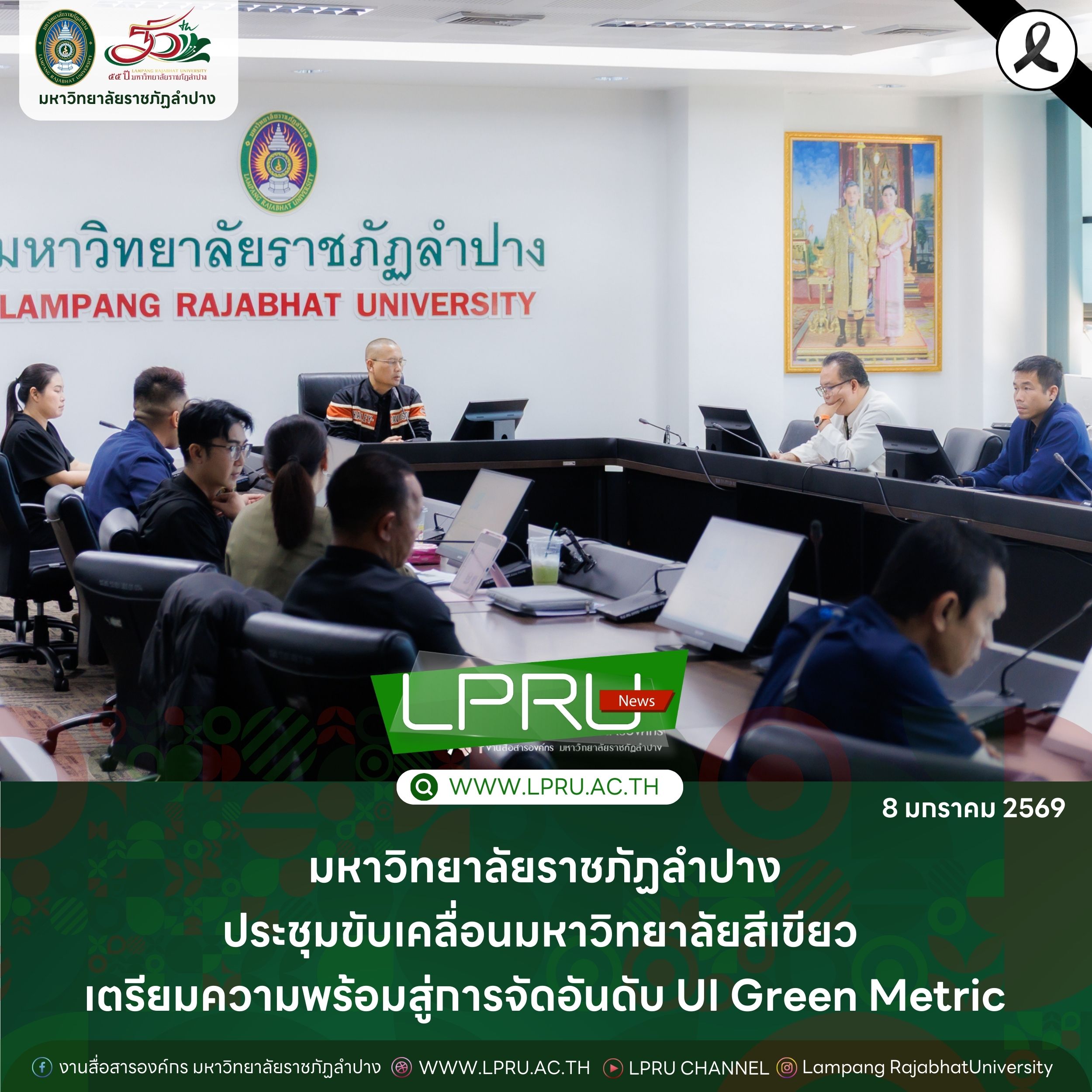 เมื่อวันที่ 8 มกราคม 2569 รศ. ดร.ปริเยศ สิทธิสรวง รองอธิการบดีฝ่ายบริหาร มหาวิทยาลัยราชภัฏลำปาง เป็นประธานการประชุมคณะกรรมการ มหาวิทยาลัยสีเขียว (Green University) มหาวิทยาลัยราชภัฏลำปาง โดยมีคณะกรรมการและเจ้าหน้าที่ที่เกี่ยวข้องเข้าร่วมประชุม ณ ห้องประชุมดอกปีบ ชั้น 2 อาคารสำนักงานอธิการบดี เพื่อติดตามการเตรียมข้อมูลเข้าระบบ ในการประเมินการจัดอันดับมหาวิทยาลัยสีเขียว UI Green Metric World University Rankings ซึ่งเป็นการจัดอันดับระดับนานาชาติที่มุ่งเน้นการพัฒนามหาวิทยาลัยอย่างยั่งยืน โดยพิจารณา 6 ด้าน ได้แก่