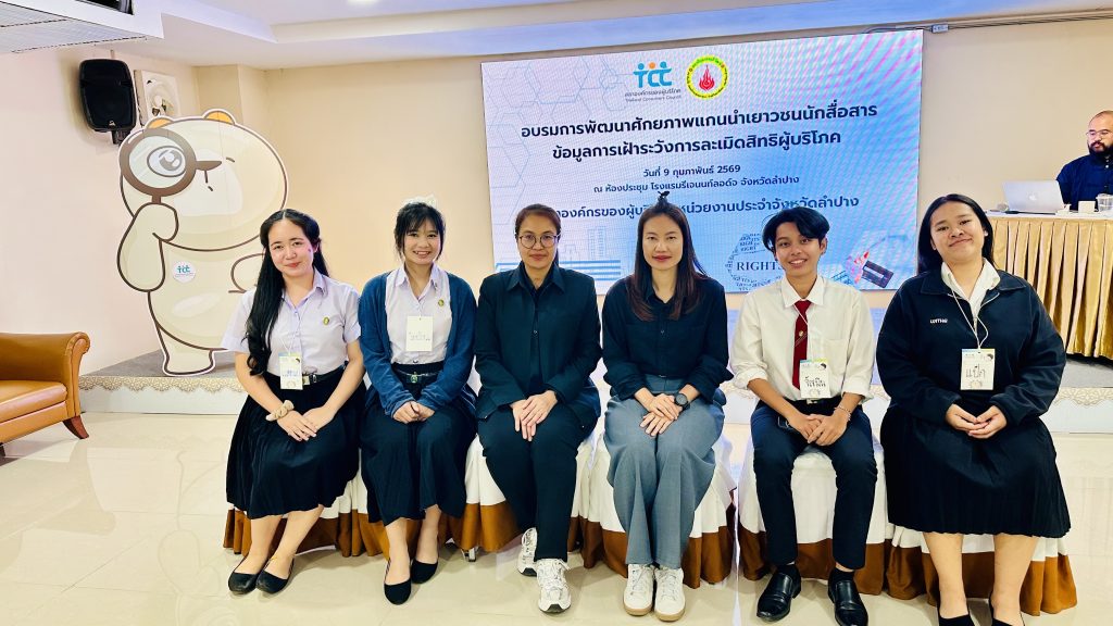 เมื่อวันที่ 9 กุมภาพันธ์ 2569 ผศ.เกียรติสุดา โสดามรรค อาจารย์สังกัดสาขาวิชานิติศาสตร์ คณะมนุษยศาสตร์และสังคมศาสตร์ พร้อมด้วย นางบุญรักษา ปัญญายืน นักวิชาการศึกษา ปฏิบัติการ สังกัดงานกิจกรรมนักศึกษาและพัฒนานักศึกษา กองพัฒนานักศึกษา มหาวิทยาลัยราชภัฏลำปาง นำนักศึกษามหาวิทยาลัยราชภัฏลำปางเข้าร่วมการอบรมพัฒนาศักยภาพแกนนำเยาวชนสื่อสารข้อมูลเฝ้าระวังการละเมิดสิทธิผู้บริโภค ณ ห้องประชุมจาววัง โรงแรมรีเจ้นท์ ลอดจ์ จังหวัดลำปาง นักศึกษาที่เข้าร่วมอบรมประกอบด้วย น.ส.ปภัสสร พันธุเดช น.ส.ฐิตินันท์ อินทร์ต๊ะกอง นักศึกษาชั้นปีที่ 2 สาขาวิชาสาธารณสุขชุมชน คณะวิทยาศาสตร์ น.ส.จัสมิน เสนาะ และ น.ส.ฐิตาพร สุขแจ่ม นักศึกษาชั้นปีที่ 2 สาขาวิชานิติศาสตร์ คณะมนุษยศาสตร์และสังคมศาสตร์