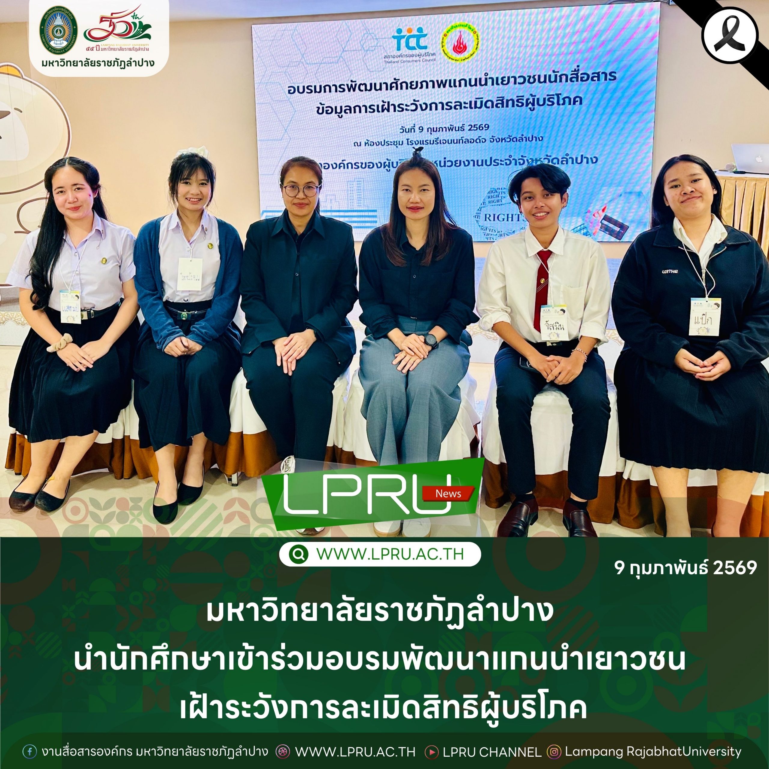 เมื่อวันที่ 9 กุมภาพันธ์ 2569 ผศ.เกียรติสุดา โสดามรรค อาจารย์สังกัดสาขาวิชานิติศาสตร์ คณะมนุษยศาสตร์และสังคมศาสตร์ พร้อมด้วย นางบุญรักษา ปัญญายืน นักวิชาการศึกษา ปฏิบัติการ สังกัดงานกิจกรรมนักศึกษาและพัฒนานักศึกษา กองพัฒนานักศึกษา มหาวิทยาลัยราชภัฏลำปาง นำนักศึกษามหาวิทยาลัยราชภัฏลำปางเข้าร่วมการอบรมพัฒนาศักยภาพแกนนำเยาวชนสื่อสารข้อมูลเฝ้าระวังการละเมิดสิทธิผู้บริโภค ณ ห้องประชุมจาววัง โรงแรมรีเจ้นท์ ลอดจ์ จังหวัดลำปาง นักศึกษาที่เข้าร่วมอบรมประกอบด้วย น.ส.ปภัสสร พันธุเดช น.ส.ฐิตินันท์ อินทร์ต๊ะกอง นักศึกษาชั้นปีที่ 2 สาขาวิชาสาธารณสุขชุมชน คณะวิทยาศาสตร์ น.ส.จัสมิน เสนาะ และ น.ส.ฐิตาพร สุขแจ่ม นักศึกษาชั้นปีที่ 2 สาขาวิชานิติศาสตร์ คณะมนุษยศาสตร์และสังคมศาสตร์