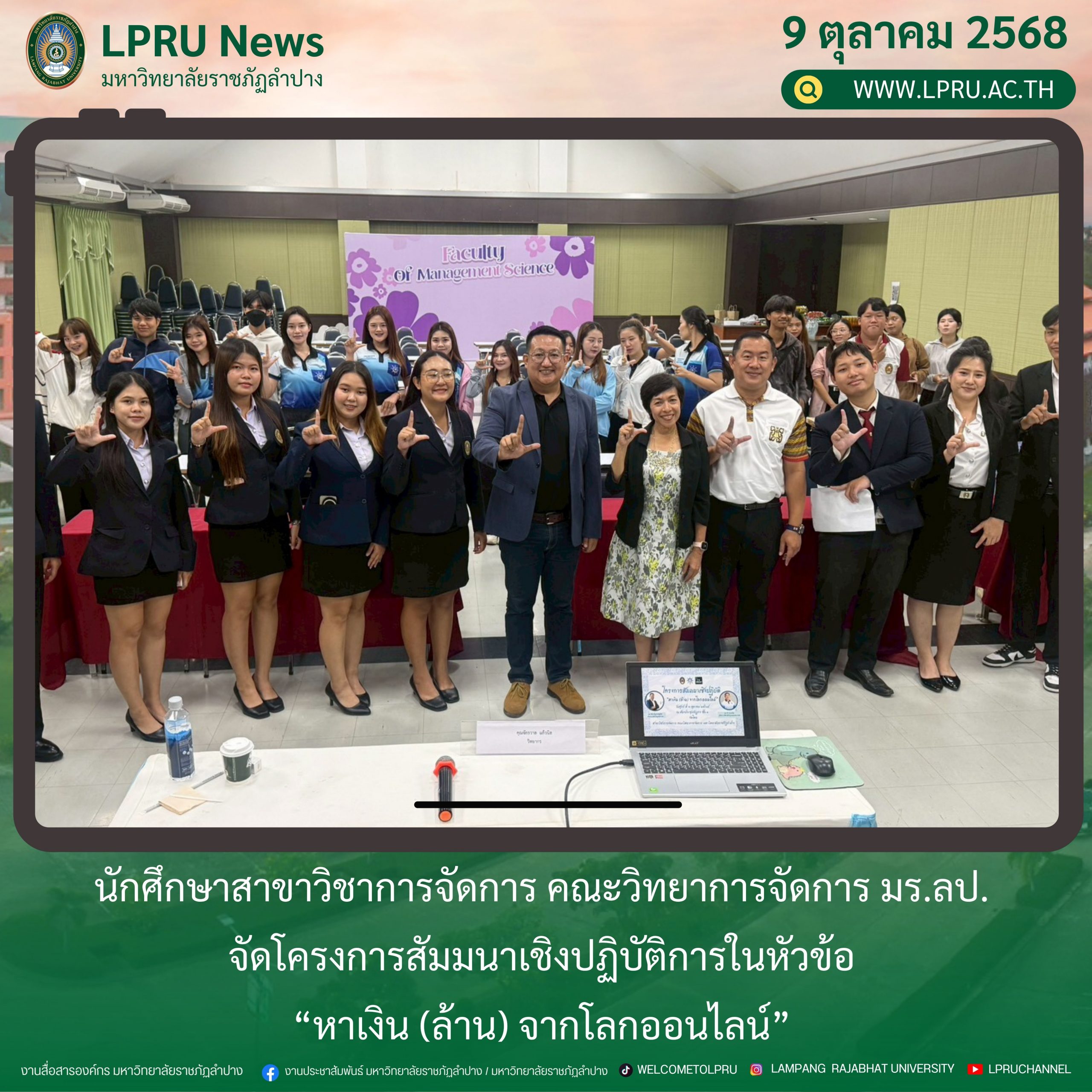 นักศึกษาสาขาวิชาการจัดการ คณะวิทยาการจัดการ มร.ลป. จัดโครงการสัมมนาเชิงปฏิบัติการในหัวข้อ “หาเงิน (ล้าน) จากโลกออนไลน์”