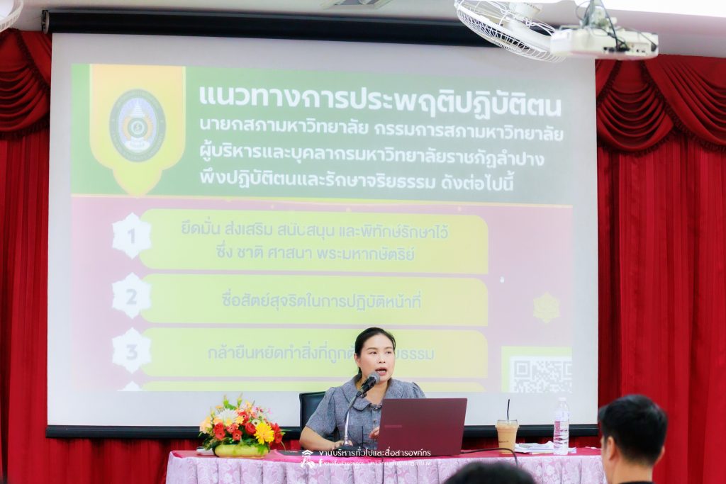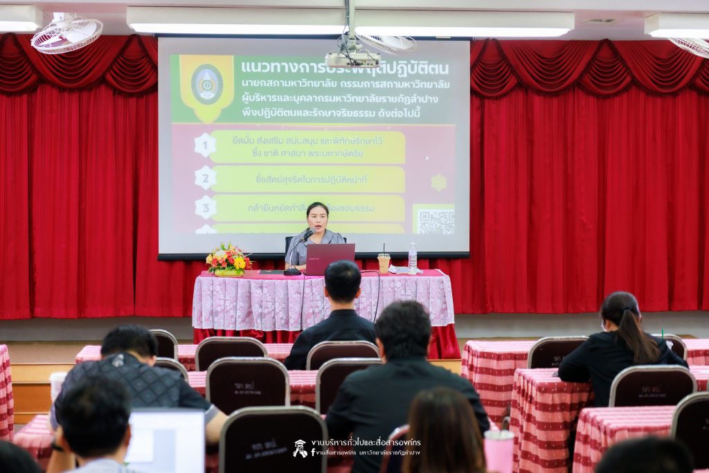 ทั้งนี้ มหาวิทยาลัยราชภัฏลำปางได้ให้ความสำคัญกับการดำเนินงานตามหลักธรรมาภิบาล โดยมุ่งส่งเสริมให้ทุกภาคส่วนปฏิบัติงานด้วยความโปร่งใส เป็นธรรม และสามารถตรวจสอบได้ เพื่อร่วมกันขับเคลื่อนองค์กรสู่การเป็นหน่วยงานภาครัฐที่มีคุณธรรมและความโปร่งใสอย่างยั่งยืน ซึ่งการจัดกิจกรรมครั้งต่อไปจะเป็นหน่วยงานคณะวิทยาศาสตร์ และคณะพยาบาลศาสตร์