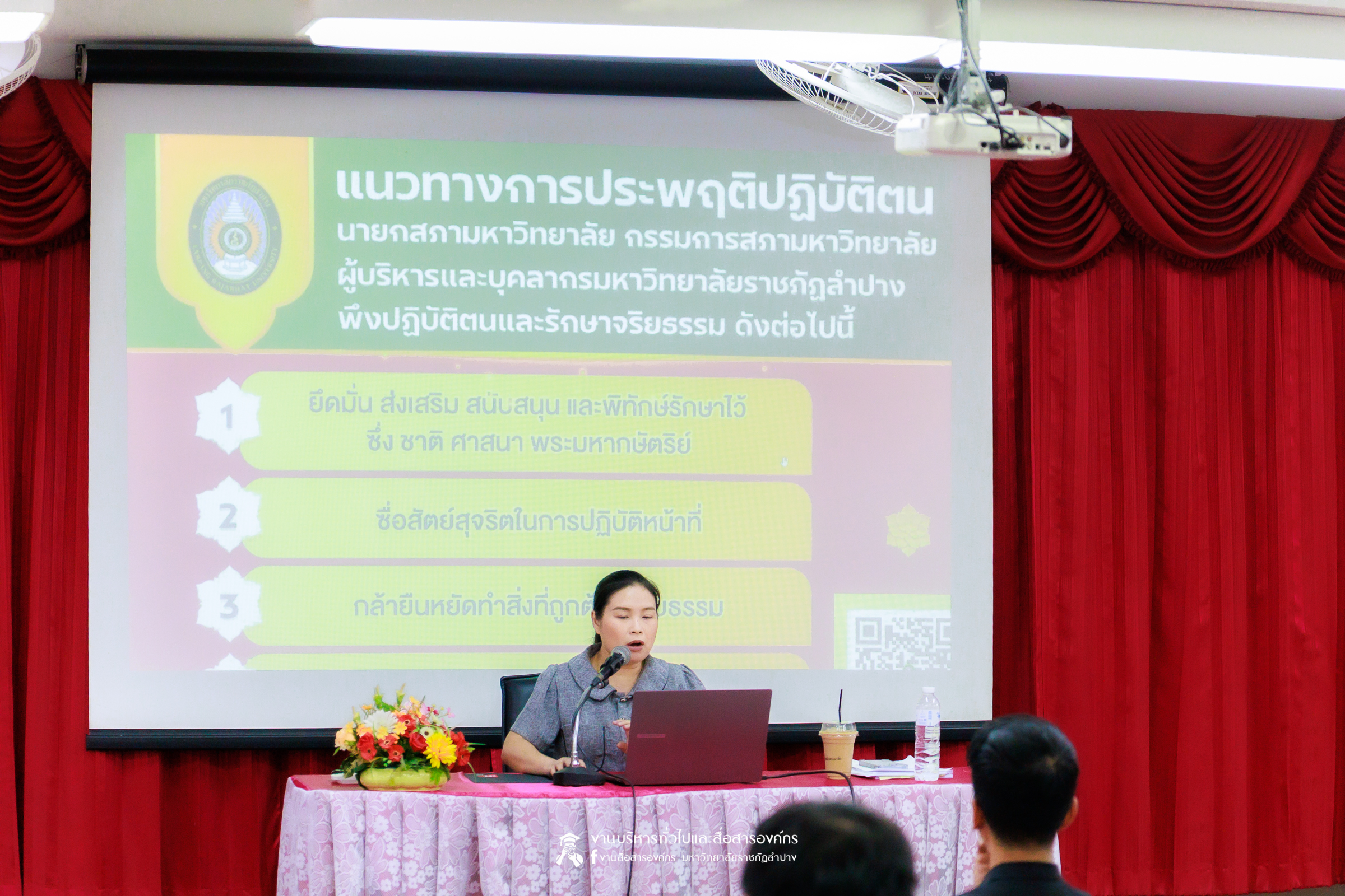 ทั้งนี้ มหาวิทยาลัยราชภัฏลำปางได้ให้ความสำคัญกับการดำเนินงานตามหลักธรรมาภิบาล โดยมุ่งส่งเสริมให้ทุกภาคส่วนปฏิบัติงานด้วยความโปร่งใส เป็นธรรม และสามารถตรวจสอบได้ เพื่อร่วมกันขับเคลื่อนองค์กรสู่การเป็นหน่วยงานภาครัฐที่มีคุณธรรมและความโปร่งใสอย่างยั่งยืน ซึ่งการจัดกิจกรรมครั้งต่อไปจะเป็นหน่วยงานคณะวิทยาศาสตร์ และคณะพยาบาลศาสตร์