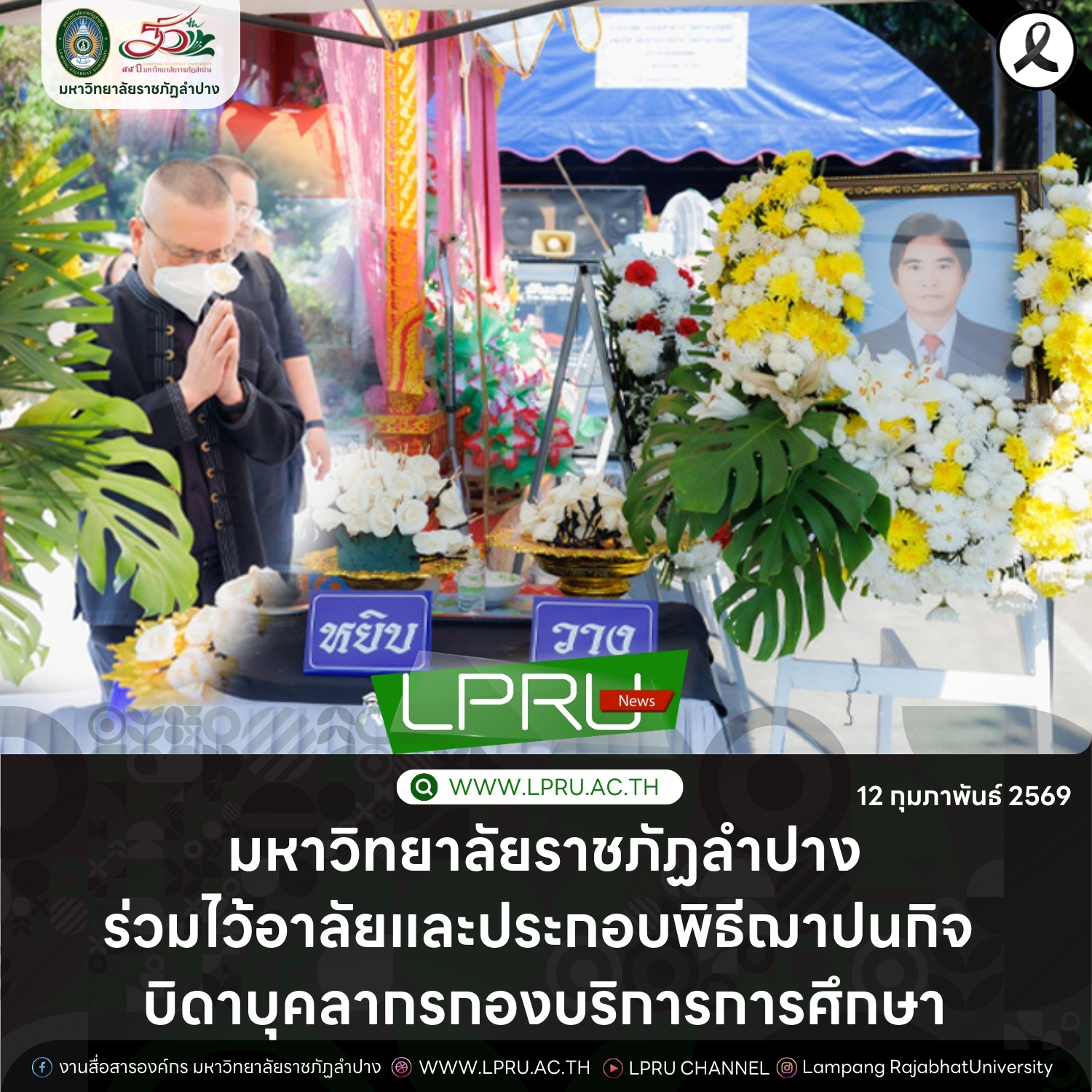 เมื่อวันที่ 12 กุมภาพันธ์ 2569 รศ.ดร.ปริเยศ สิทธิสรวง รองอธิการบดีฝ่ายบริหาร มหาวิทยาลัยราชภัฏลำปาง นำคณะผู้บริหาร คณาจารย์ และบุคลากร ร่วมพิธีฌาปนกิจ คุณพ่ออรรถวุฒิ วังใจฟู บิดาของ นายคฑาวุฒิ วังใจฟู นักวิชาการคอมพิวเตอร์ สังกัดกองบริการการศึกษา สำนักงานอธิการบดี ณ บ้านเลขที่ 252 หมู่ที่ 2 บ้านหมอสม ซอย 12 ตำบลปงแสนทอง อำเภอเมือง จังหวัดลำปาง สำหรับคุณพ่ออรรถวุฒิ วังใจฟู ได้เสียชีวิตลงอย่างสงบในวัย 71 ปี โดยทางครอบครัวได้จัดพิธีสวดพระอภิธรรมตั้งแต่วันที่ 7 – 11 กุมภาพันธ์ 2569 ที่ผ่านมา และหลังจากทำพิธีทางศาสนาที่บ้านเรียบร้อยแล้ว จะประกอบพิธีฌาปนกิจ ณ ฌาปนสถานบ้านหมอสม–วังแคว้ง อำเภอเมืองลำปาง จังหวัดลำปาง เป็นลำดับต่อไป