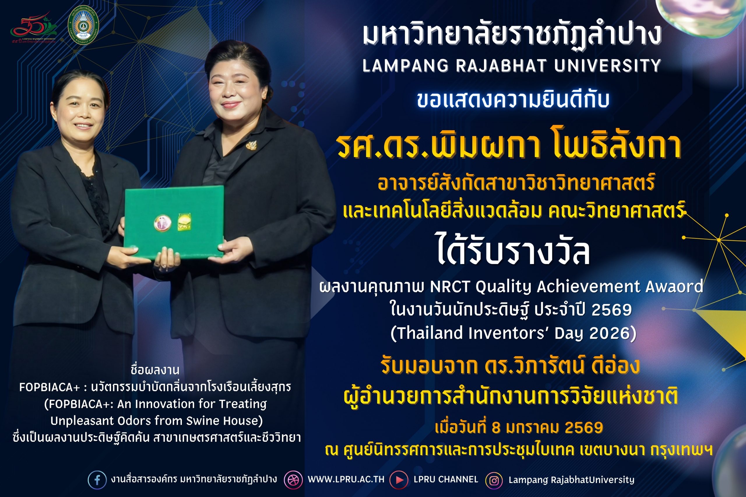มหาวิทยาลัยราชภัฏลำปาง ขอแสดงความยินดีกับ รองศาสตราจารย์ ดร.พิมผกา โพธิลังกา อาจารย์สังกัดสาขาวิชาวิทยาศาสตร์และเทคโนโลยีสิ่งแวดล้อมคณะวิทยาศาสตร์