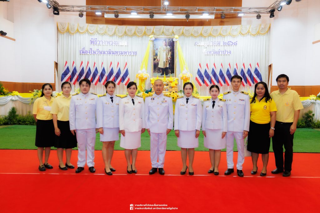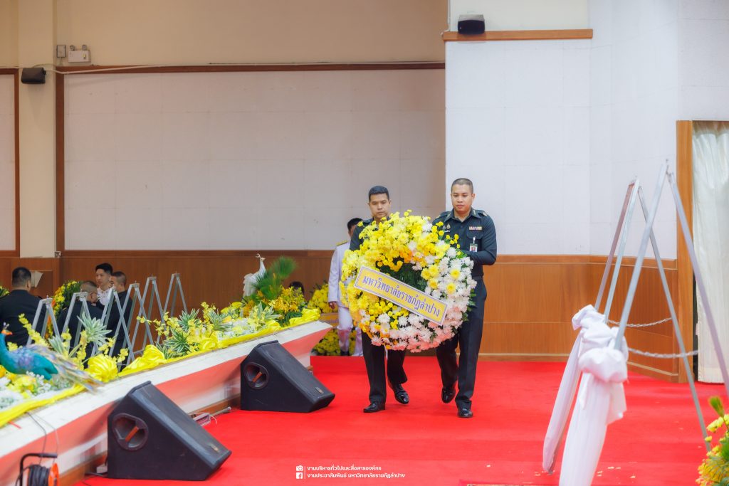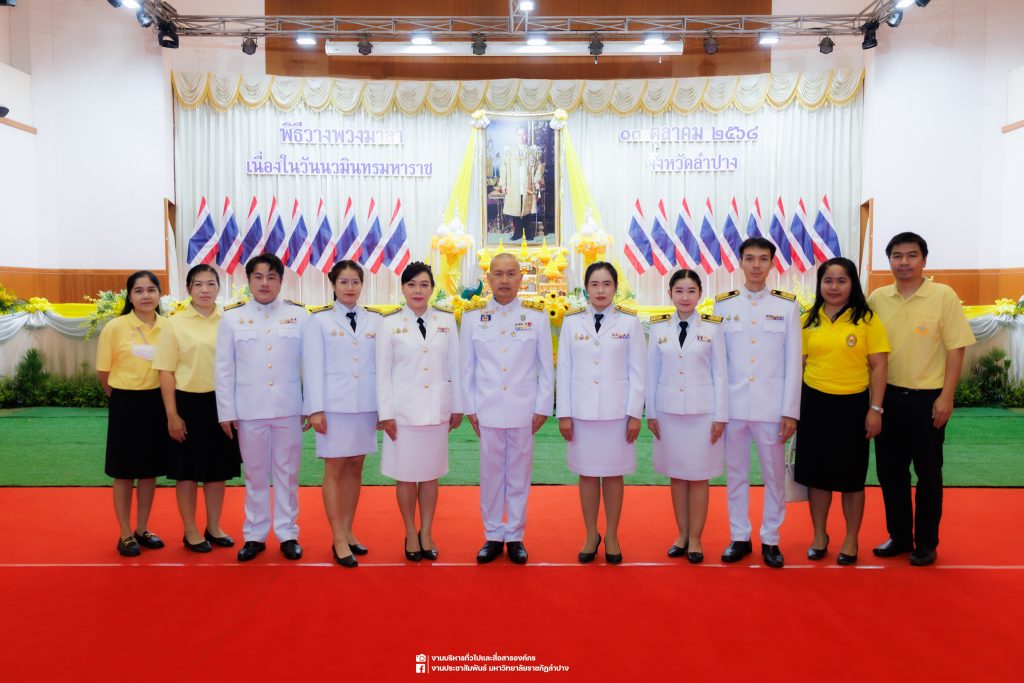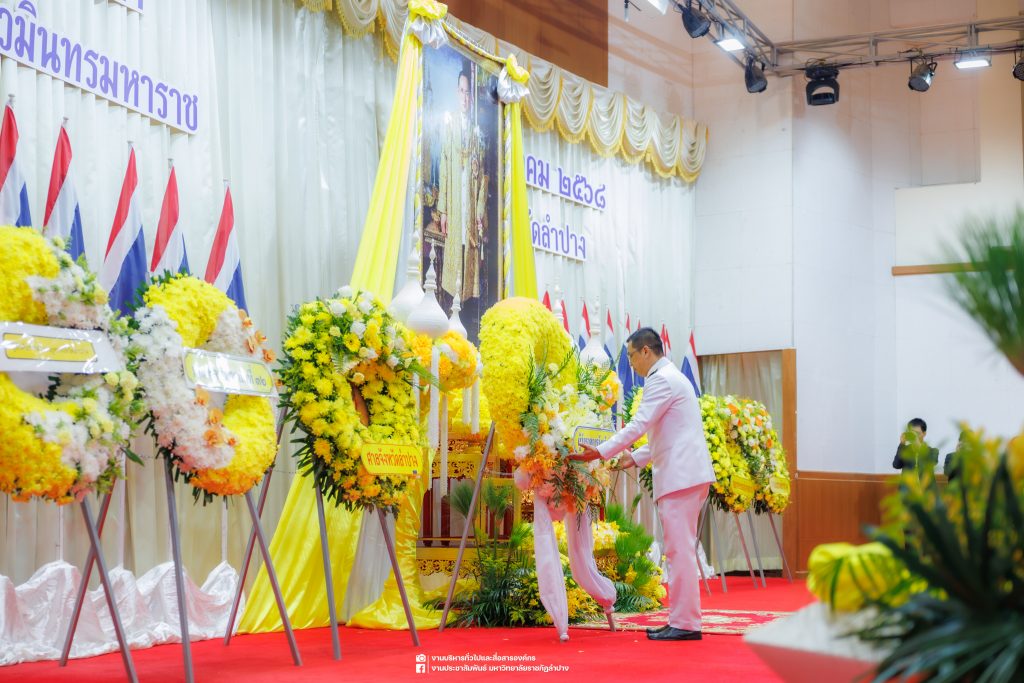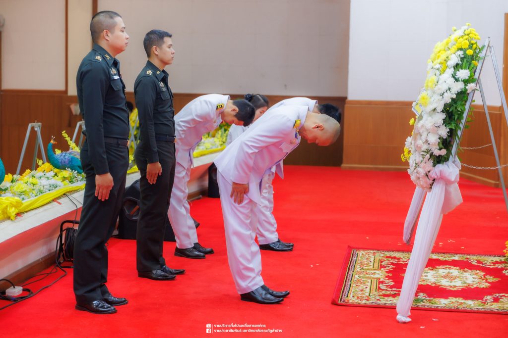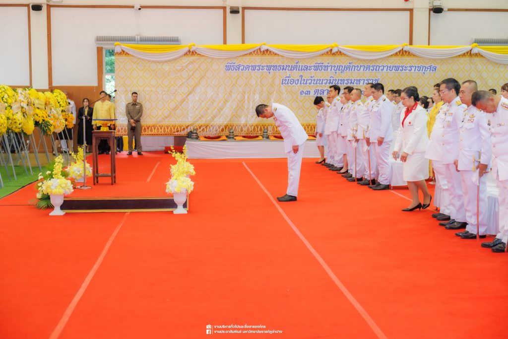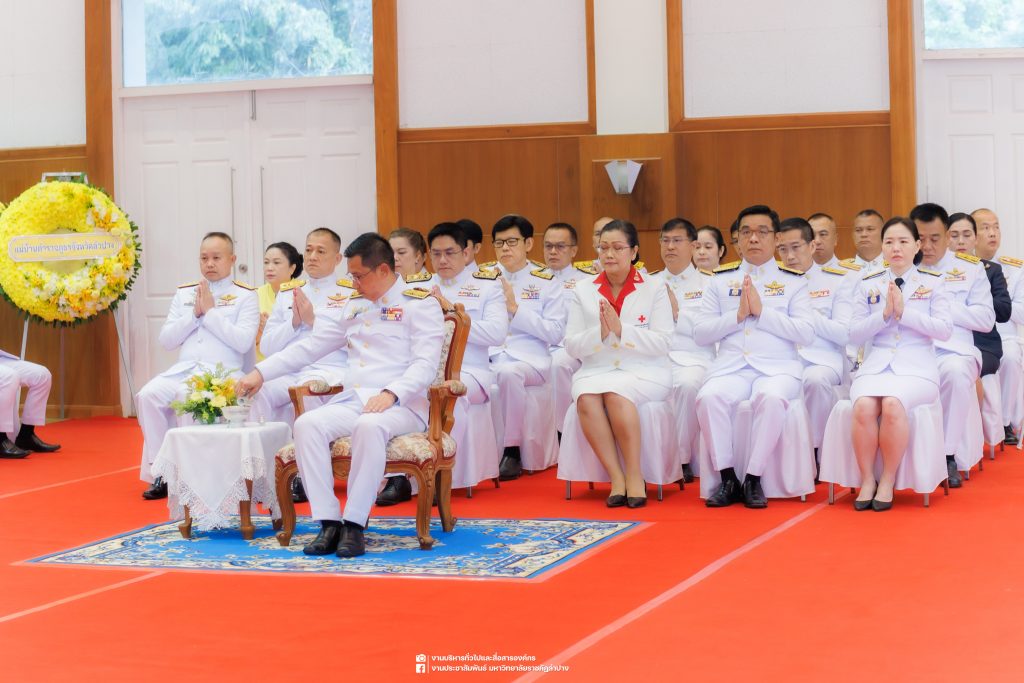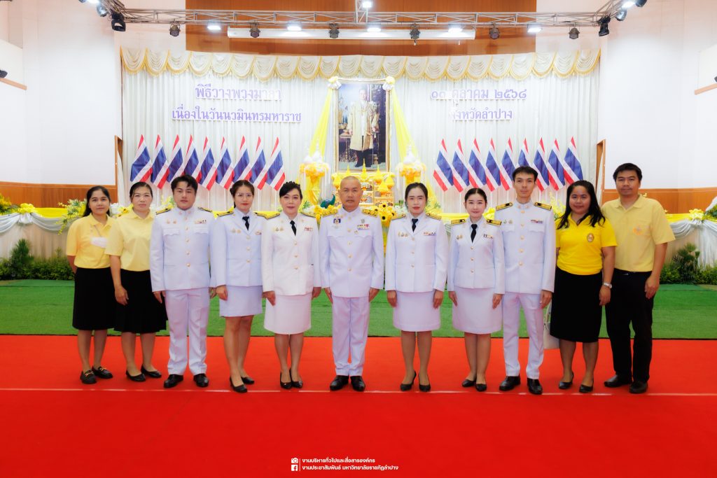เมื่อวันที่ 13 ตุลาคม 2568 รศ.ดร.ปริเยศ สิทธิสรวง รองอธิการบดีฝ่ายบริหาร มหาวิทยาลัยราชภัฏลำปาง พร้อมด้วย อ.ดร.เยาวลักษณ์ งามแสนโรจน์ รองผู้อำนวยการสำนักศิลปะและวัฒนธรรม นางสาวธิดารัตน์ ไชยยาสืบ รักษาการหัวหน้าสำนักงานผู้อำนวยการสำนักศิลปะและวัฒนธรรม นายอาทิตย์ สุปินะ นักวิชาการศึกษา นางสาวพักตร์ชนก ริยาคำ เจ้าหน้าที่บริหารงานทั่วไป นางสาวปานฤทัย ไชยรังษี นักวิชาการศึกษา สังกัดสำนักศิลปะและวัฒนธรรม นางสาวหอมนวล ศรีริ นักประชาสัมพันธ์ นายชนาธิป เมืองมูล นักประชาสัมพันธ์ สังกัดงานบริหารทั่วไปและสื่อสารองค์กร กองกลาง สำนักงานอธิการบดี นางสาวนงเยาว์ ตะนะวงค์ เจ้าหน้าที่บริหารงานทั่วไป นางสาวบงกช สมรอบรู้ เจ้าหน้าที่บริหารงานทั่วไป นางสาวรวีพรรณ แนบสนิทธรรม นักวิชาการศึกษา นางณัฐกานต์ ห่อทอง นักวิชาการศึกษา และนายคฑาวุฒิ วังใจฟู นักวิชาการคอมพิวเตอร์ สังกัดกองบริการการศึกษา ร่วมพิธีสวดพระพุทธมนต์ ทำบุญตักบาตรถวายพระราชกุศล และพิธีวางพวงมาลาน้อมรำลึกในพระมหากรุณาธิคุณ เนื่องในวันคล้ายวันสวรรคต พระบาทสมเด็จพระบรมชนกาธิเบศร มหาภูมิพลอดุลยเดชมหาราช บรมนาถบพิตร “วันนวมินทรมหาราช” ณ หอประชุมจังหวัดลำปาง ศาลากลางจังหวัดลำปาง โดยมี นายวิบูนณ์ แววบัณฑิต ผู้ว่าราชการจังหวัดลำปาง เป็นประธานในพิธี พร้อมด้วยคณะผู้บริหาร หัวหน้าส่วนราชการ ข้าราชการ เจ้าหน้าที่ และประชาชนชาวจังหวัดลำปาง เข้าร่วมเพื่อร่วมกันแสดงความจงรักภักดี และน้อมรำลึกถึงพระมหากรุณาธิคุณอันหาที่สุดมิได้