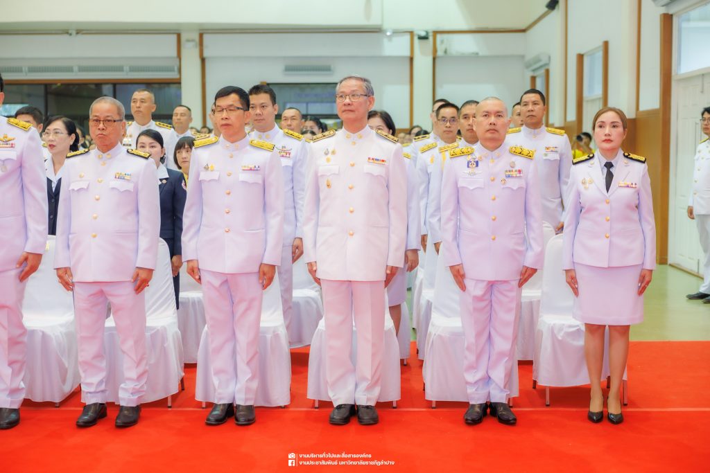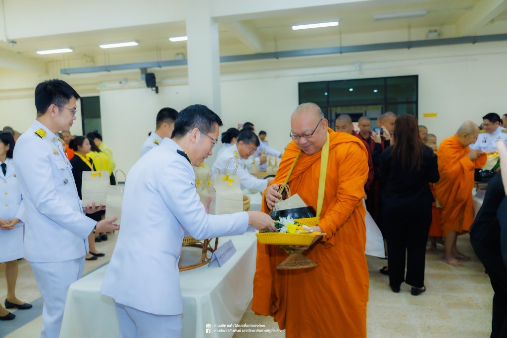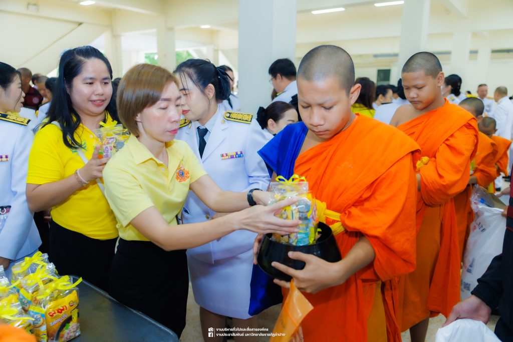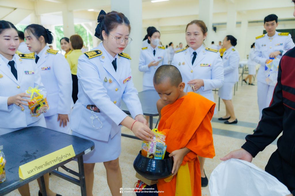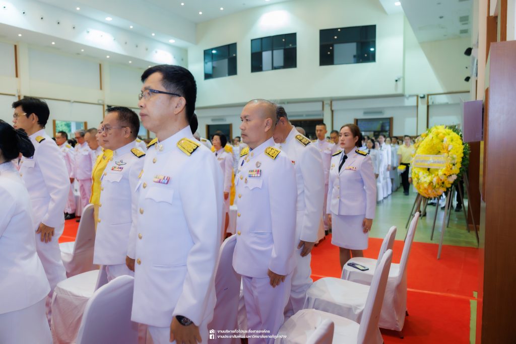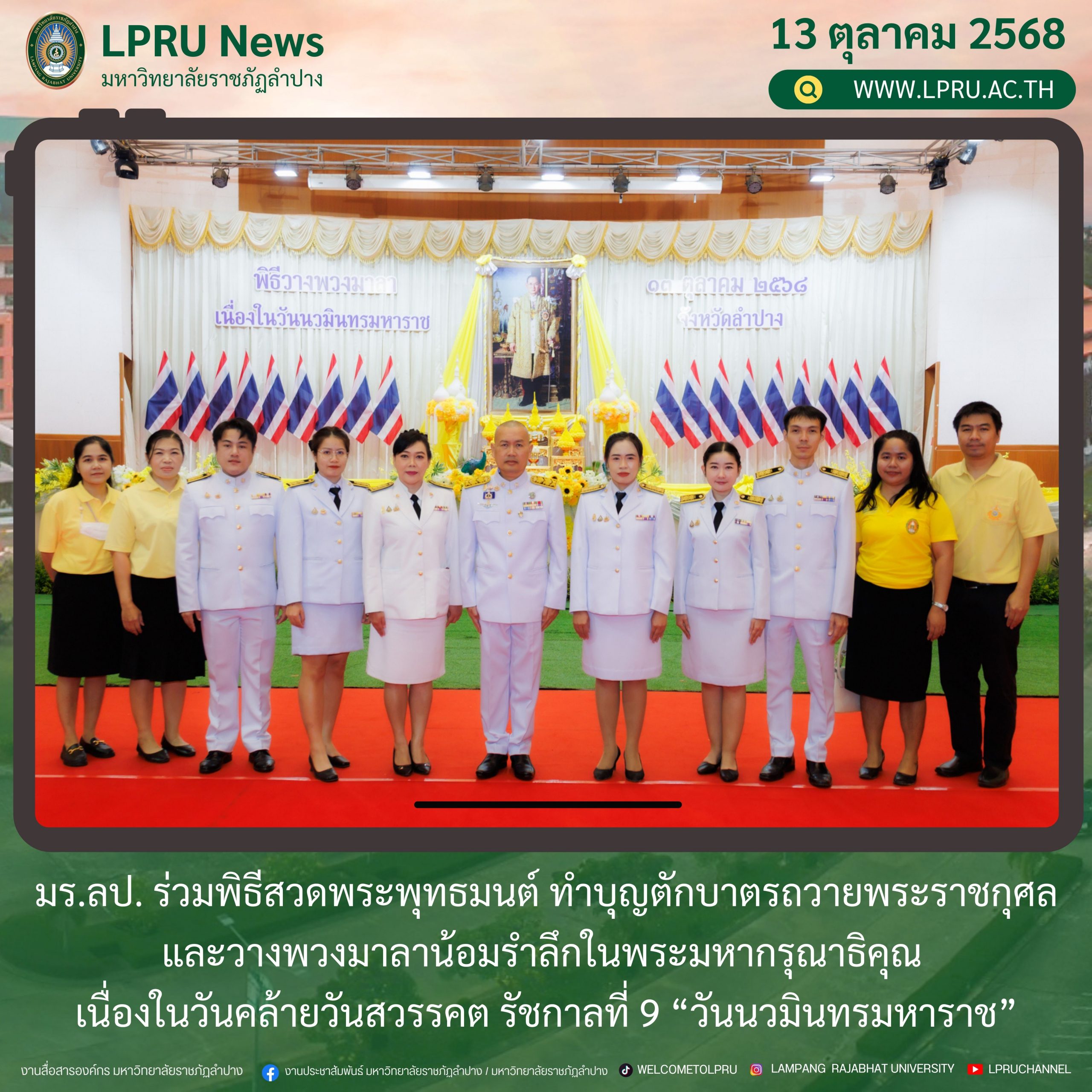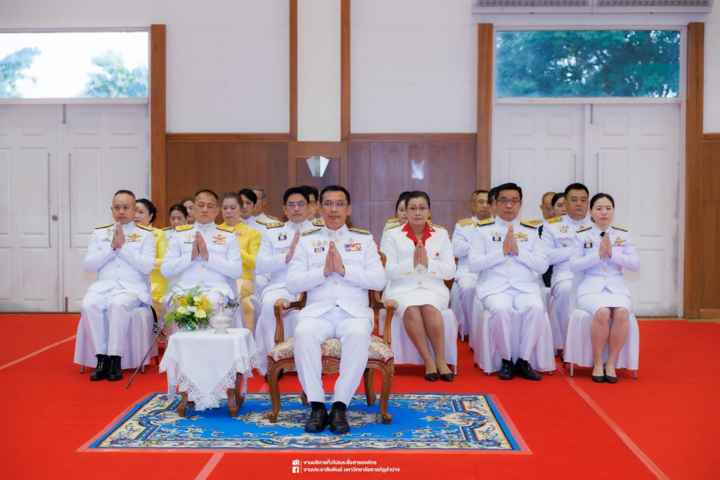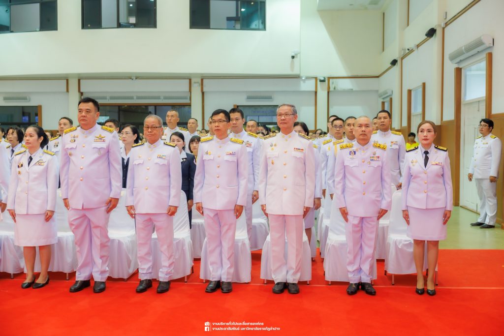 เมื่อวันที่ 13 ตุลาคม 2568 รศ.ดร.ปริเยศ สิทธิสรวง รองอธิการบดีฝ่ายบริหาร มหาวิทยาลัยราชภัฏลำปาง พร้อมด้วย อ.ดร.เยาวลักษณ์ งามแสนโรจน์ รองผู้อำนวยการสำนักศิลปะและวัฒนธรรม นางสาวธิดารัตน์ ไชยยาสืบ รักษาการหัวหน้าสำนักงานผู้อำนวยการสำนักศิลปะและวัฒนธรรม นายอาทิตย์ สุปินะ นักวิชาการศึกษา นางสาวพักตร์ชนก ริยาคำ เจ้าหน้าที่บริหารงานทั่วไป นางสาวปานฤทัย ไชยรังษี นักวิชาการศึกษา สังกัดสำนักศิลปะและวัฒนธรรม นางสาวหอมนวล ศรีริ นักประชาสัมพันธ์ นายชนาธิป เมืองมูล นักประชาสัมพันธ์ สังกัดงานบริหารทั่วไปและสื่อสารองค์กร กองกลาง สำนักงานอธิการบดี นางสาวนงเยาว์ ตะนะวงค์ เจ้าหน้าที่บริหารงานทั่วไป นางสาวบงกช สมรอบรู้ เจ้าหน้าที่บริหารงานทั่วไป นางสาวรวีพรรณ แนบสนิทธรรม นักวิชาการศึกษา นางณัฐกานต์ ห่อทอง นักวิชาการศึกษา และนายคฑาวุฒิ วังใจฟู นักวิชาการคอมพิวเตอร์ สังกัดกองบริการการศึกษา ร่วมพิธีสวดพระพุทธมนต์ ทำบุญตักบาตรถวายพระราชกุศล และพิธีวางพวงมาลาน้อมรำลึกในพระมหากรุณาธิคุณ เนื่องในวันคล้ายวันสวรรคต พระบาทสมเด็จพระบรมชนกาธิเบศร มหาภูมิพลอดุลยเดชมหาราช บรมนาถบพิตร “วันนวมินทรมหาราช” ณ หอประชุมจังหวัดลำปาง ศาลากลางจังหวัดลำปาง โดยมี นายวิบูนณ์ แววบัณฑิต ผู้ว่าราชการจังหวัดลำปาง เป็นประธานในพิธี พร้อมด้วยคณะผู้บริหาร หัวหน้าส่วนราชการ ข้าราชการ เจ้าหน้าที่ และประชาชนชาวจังหวัดลำปาง เข้าร่วมเพื่อร่วมกันแสดงความจงรักภักดี และน้อมรำลึกถึงพระมหากรุณาธิคุณอันหาที่สุดมิได้