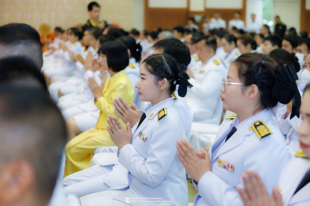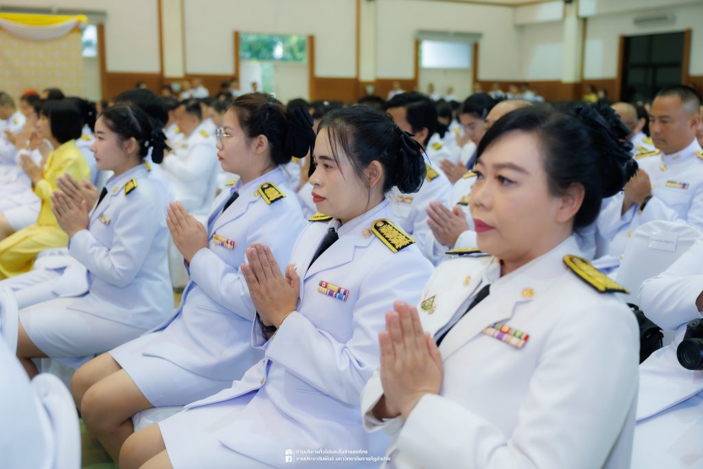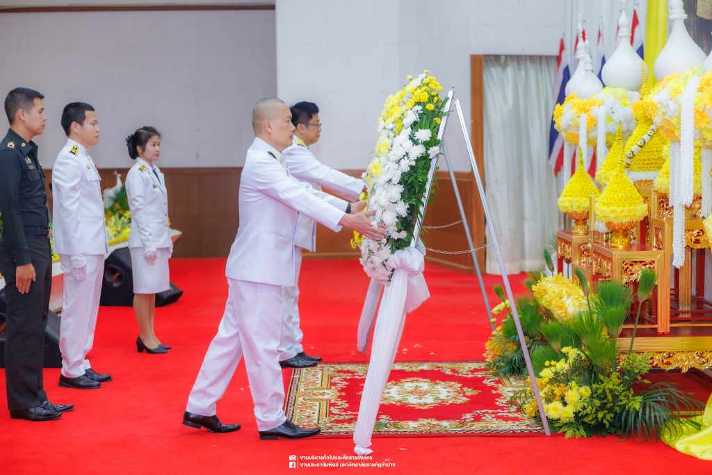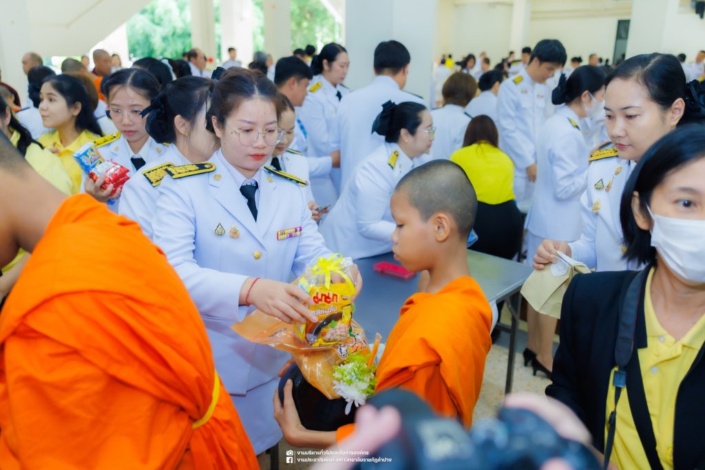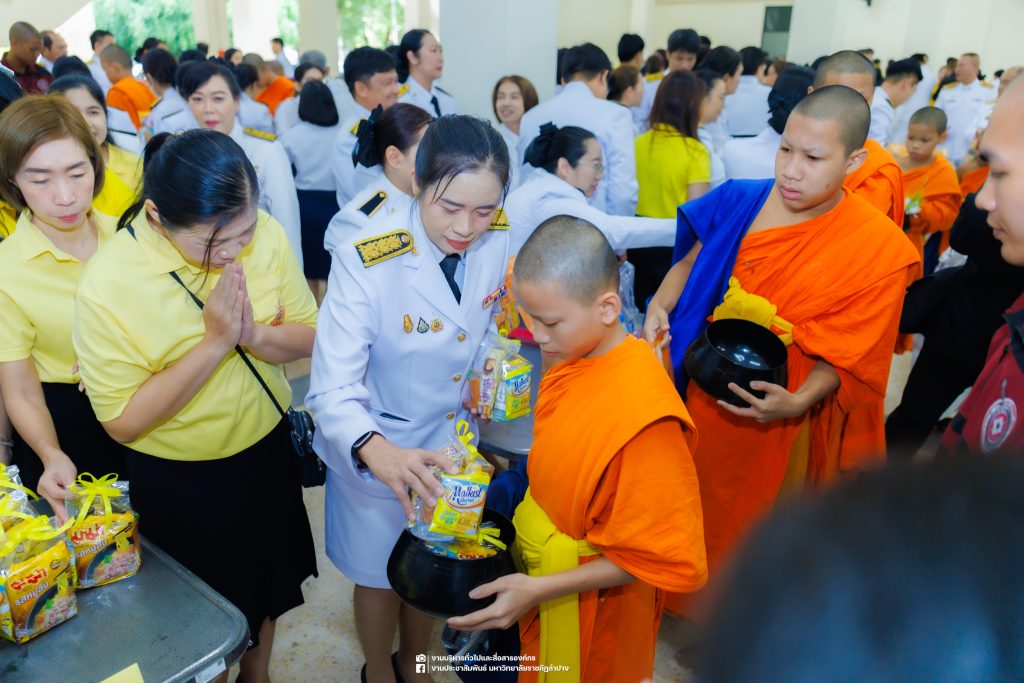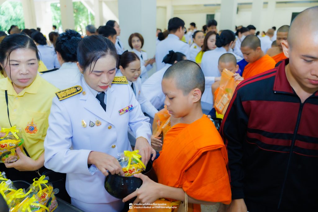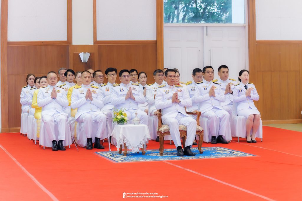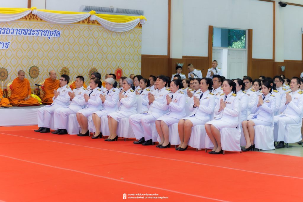 เมื่อวันที่ 13 ตุลาคม 2568 รศ.ดร.ปริเยศ สิทธิสรวง รองอธิการบดีฝ่ายบริหาร มหาวิทยาลัยราชภัฏลำปาง พร้อมด้วย อ.ดร.เยาวลักษณ์ งามแสนโรจน์ รองผู้อำนวยการสำนักศิลปะและวัฒนธรรม นางสาวธิดารัตน์ ไชยยาสืบ รักษาการหัวหน้าสำนักงานผู้อำนวยการสำนักศิลปะและวัฒนธรรม นายอาทิตย์ สุปินะ นักวิชาการศึกษา นางสาวพักตร์ชนก ริยาคำ เจ้าหน้าที่บริหารงานทั่วไป นางสาวปานฤทัย ไชยรังษี นักวิชาการศึกษา สังกัดสำนักศิลปะและวัฒนธรรม นางสาวหอมนวล ศรีริ นักประชาสัมพันธ์ นายชนาธิป เมืองมูล นักประชาสัมพันธ์ สังกัดงานบริหารทั่วไปและสื่อสารองค์กร กองกลาง สำนักงานอธิการบดี นางสาวนงเยาว์ ตะนะวงค์ เจ้าหน้าที่บริหารงานทั่วไป นางสาวบงกช สมรอบรู้ เจ้าหน้าที่บริหารงานทั่วไป นางสาวรวีพรรณ แนบสนิทธรรม นักวิชาการศึกษา นางณัฐกานต์ ห่อทอง นักวิชาการศึกษา และนายคฑาวุฒิ วังใจฟู นักวิชาการคอมพิวเตอร์ สังกัดกองบริการการศึกษา ร่วมพิธีสวดพระพุทธมนต์ ทำบุญตักบาตรถวายพระราชกุศล และพิธีวางพวงมาลาน้อมรำลึกในพระมหากรุณาธิคุณ เนื่องในวันคล้ายวันสวรรคต พระบาทสมเด็จพระบรมชนกาธิเบศร มหาภูมิพลอดุลยเดชมหาราช บรมนาถบพิตร “วันนวมินทรมหาราช” ณ หอประชุมจังหวัดลำปาง ศาลากลางจังหวัดลำปาง โดยมี นายวิบูนณ์ แววบัณฑิต ผู้ว่าราชการจังหวัดลำปาง เป็นประธานในพิธี พร้อมด้วยคณะผู้บริหาร หัวหน้าส่วนราชการ ข้าราชการ เจ้าหน้าที่ และประชาชนชาวจังหวัดลำปาง เข้าร่วมเพื่อร่วมกันแสดงความจงรักภักดี และน้อมรำลึกถึงพระมหากรุณาธิคุณอันหาที่สุดมิได้