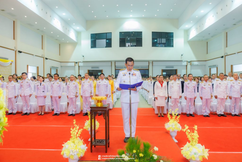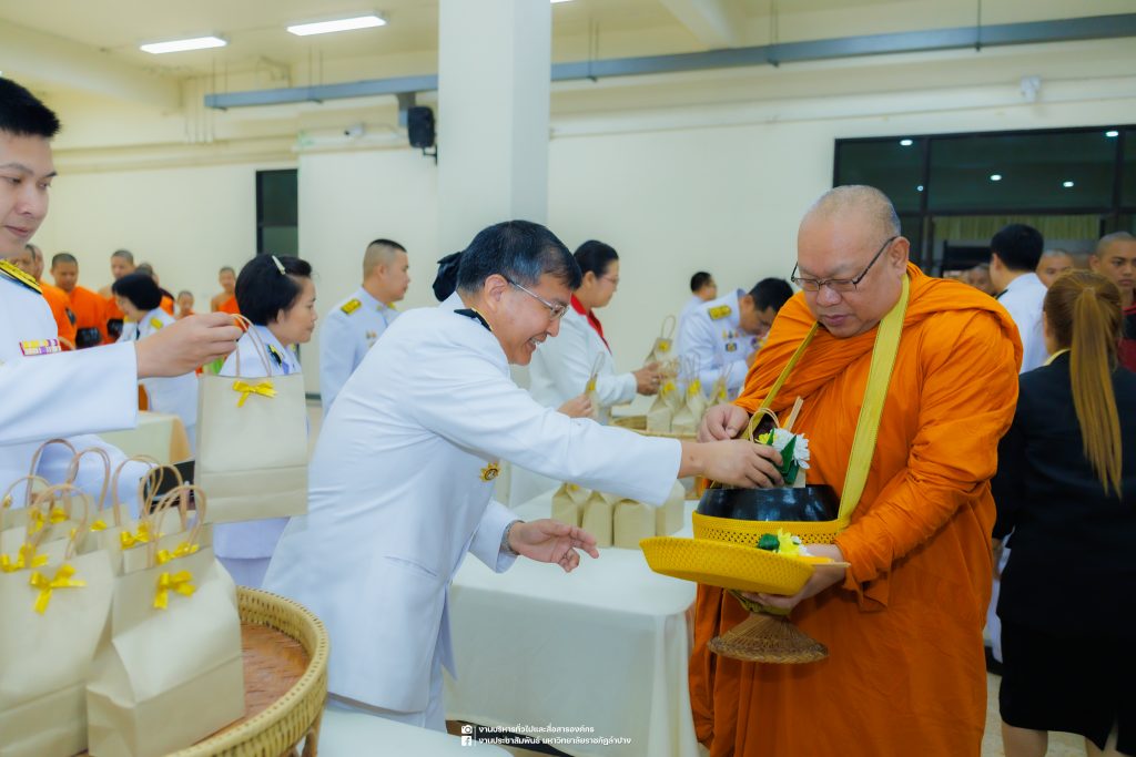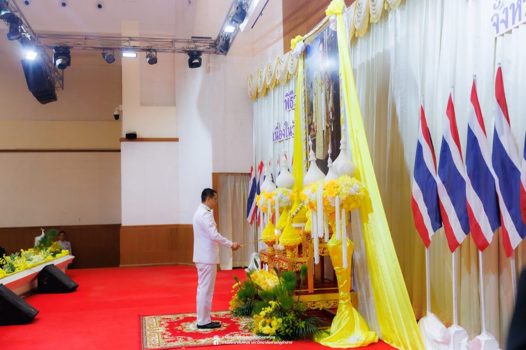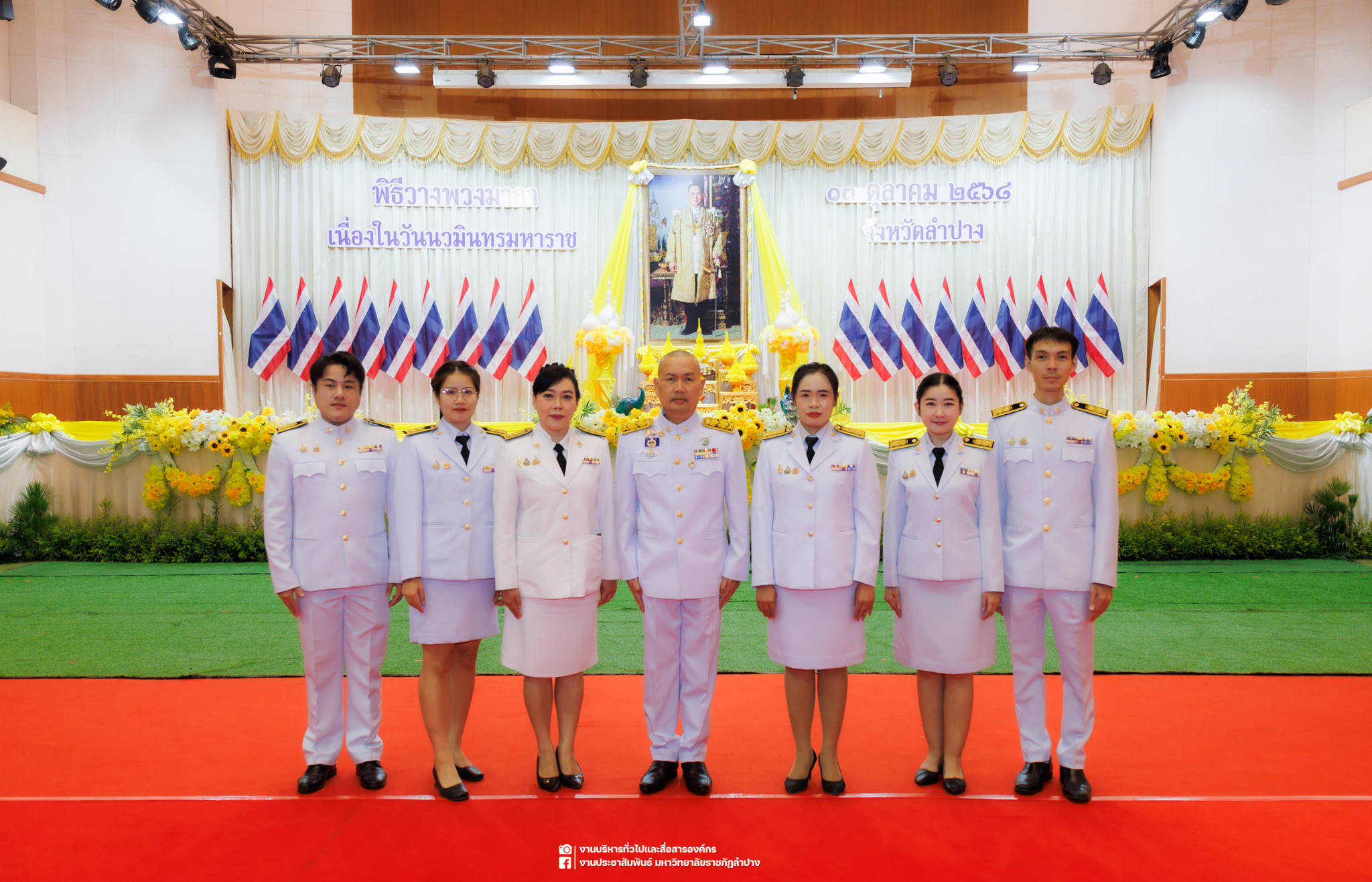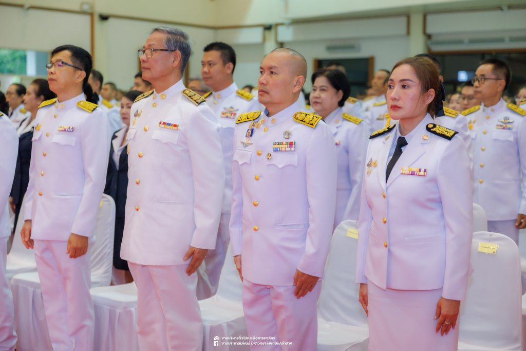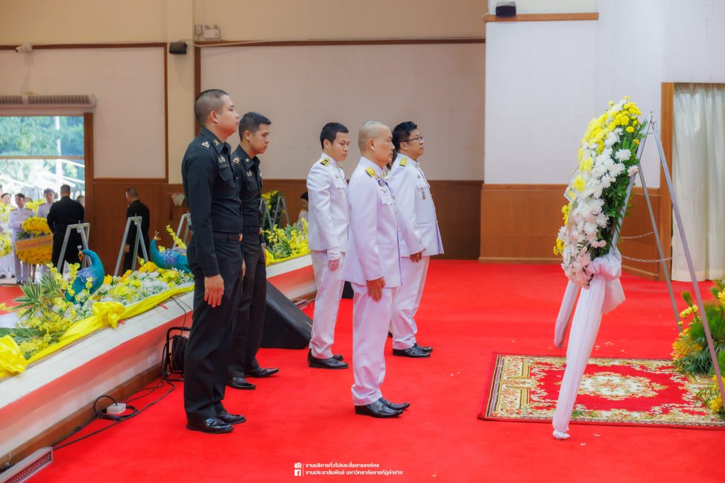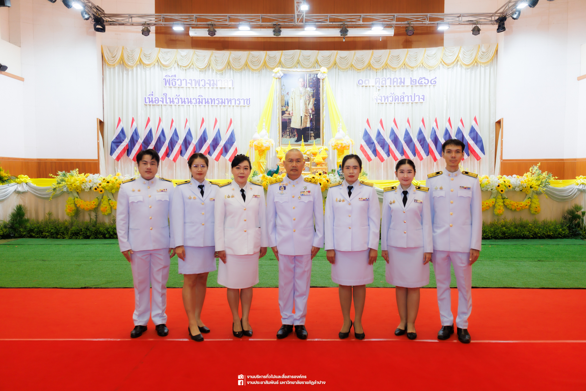 เมื่อวันที่ 13 ตุลาคม 2568 รศ.ดร.ปริเยศ สิทธิสรวง รองอธิการบดีฝ่ายบริหาร มหาวิทยาลัยราชภัฏลำปาง พร้อมด้วย อ.ดร.เยาวลักษณ์ งามแสนโรจน์ รองผู้อำนวยการสำนักศิลปะและวัฒนธรรม นางสาวธิดารัตน์ ไชยยาสืบ รักษาการหัวหน้าสำนักงานผู้อำนวยการสำนักศิลปะและวัฒนธรรม นายอาทิตย์ สุปินะ นักวิชาการศึกษา นางสาวพักตร์ชนก ริยาคำ เจ้าหน้าที่บริหารงานทั่วไป นางสาวปานฤทัย ไชยรังษี นักวิชาการศึกษา สังกัดสำนักศิลปะและวัฒนธรรม นางสาวหอมนวล ศรีริ นักประชาสัมพันธ์ นายชนาธิป เมืองมูล นักประชาสัมพันธ์ สังกัดงานบริหารทั่วไปและสื่อสารองค์กร กองกลาง สำนักงานอธิการบดี นางสาวนงเยาว์ ตะนะวงค์ เจ้าหน้าที่บริหารงานทั่วไป นางสาวบงกช สมรอบรู้ เจ้าหน้าที่บริหารงานทั่วไป นางสาวรวีพรรณ แนบสนิทธรรม นักวิชาการศึกษา นางณัฐกานต์ ห่อทอง นักวิชาการศึกษา และนายคฑาวุฒิ วังใจฟู นักวิชาการคอมพิวเตอร์ สังกัดกองบริการการศึกษา ร่วมพิธีสวดพระพุทธมนต์ ทำบุญตักบาตรถวายพระราชกุศล และพิธีวางพวงมาลาน้อมรำลึกในพระมหากรุณาธิคุณ เนื่องในวันคล้ายวันสวรรคต พระบาทสมเด็จพระบรมชนกาธิเบศร มหาภูมิพลอดุลยเดชมหาราช บรมนาถบพิตร “วันนวมินทรมหาราช” ณ หอประชุมจังหวัดลำปาง ศาลากลางจังหวัดลำปาง โดยมี นายวิบูนณ์ แววบัณฑิต ผู้ว่าราชการจังหวัดลำปาง เป็นประธานในพิธี พร้อมด้วยคณะผู้บริหาร หัวหน้าส่วนราชการ ข้าราชการ เจ้าหน้าที่ และประชาชนชาวจังหวัดลำปาง เข้าร่วมเพื่อร่วมกันแสดงความจงรักภักดี และน้อมรำลึกถึงพระมหากรุณาธิคุณอันหาที่สุดมิได้