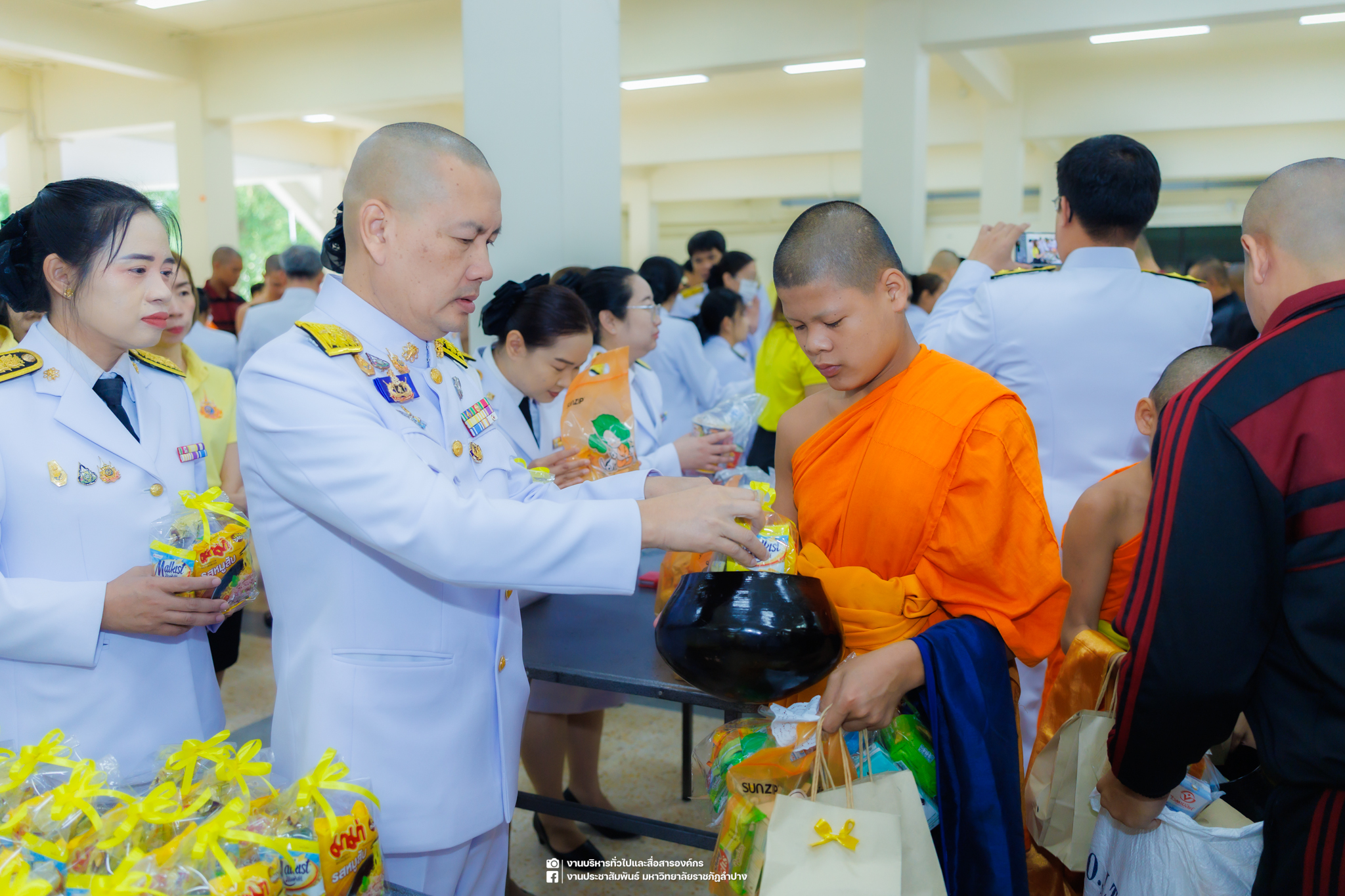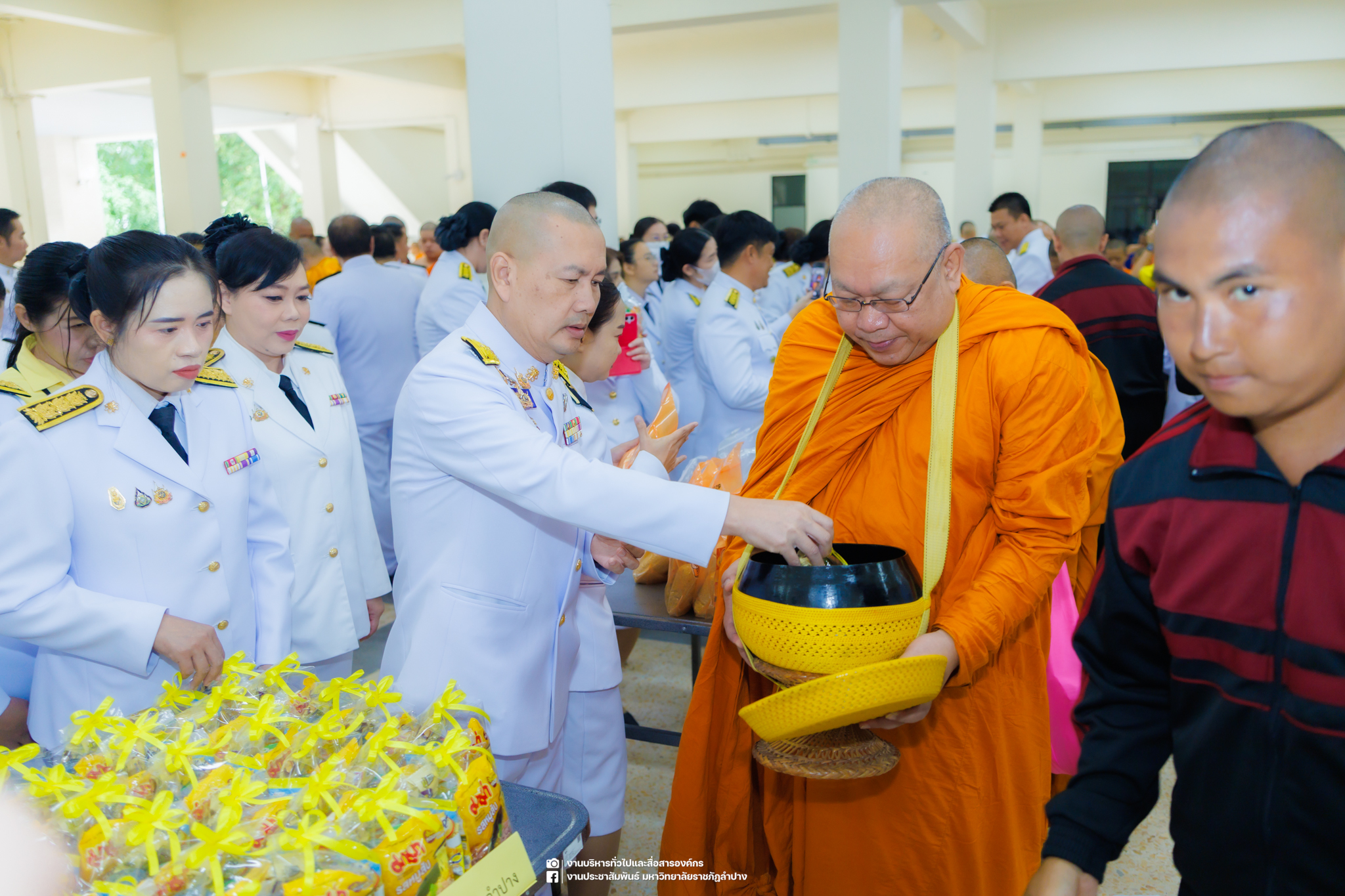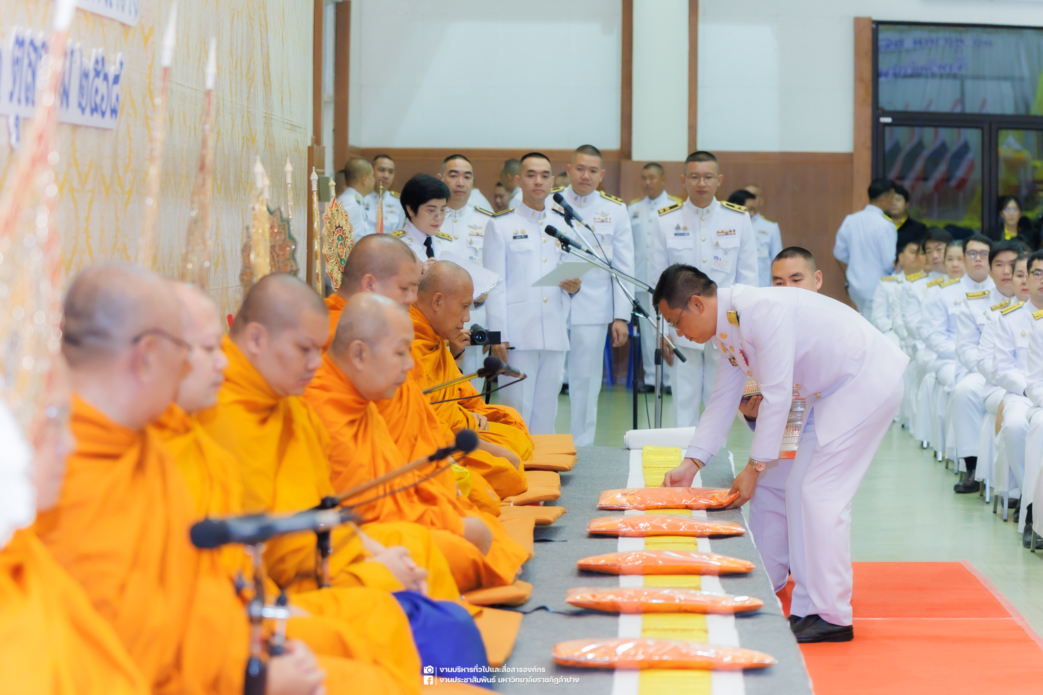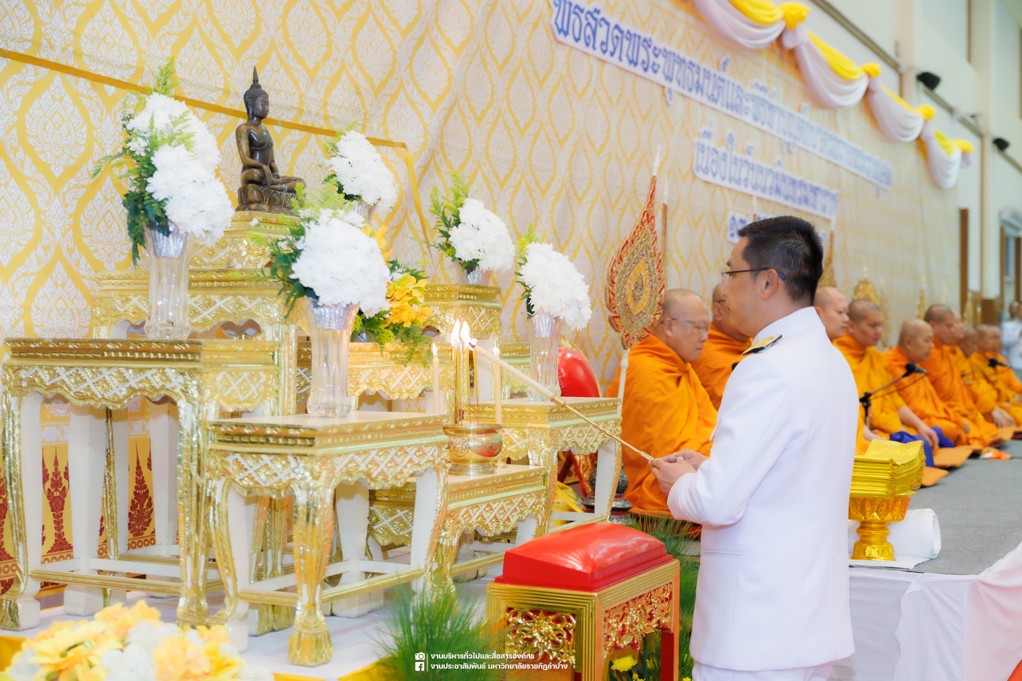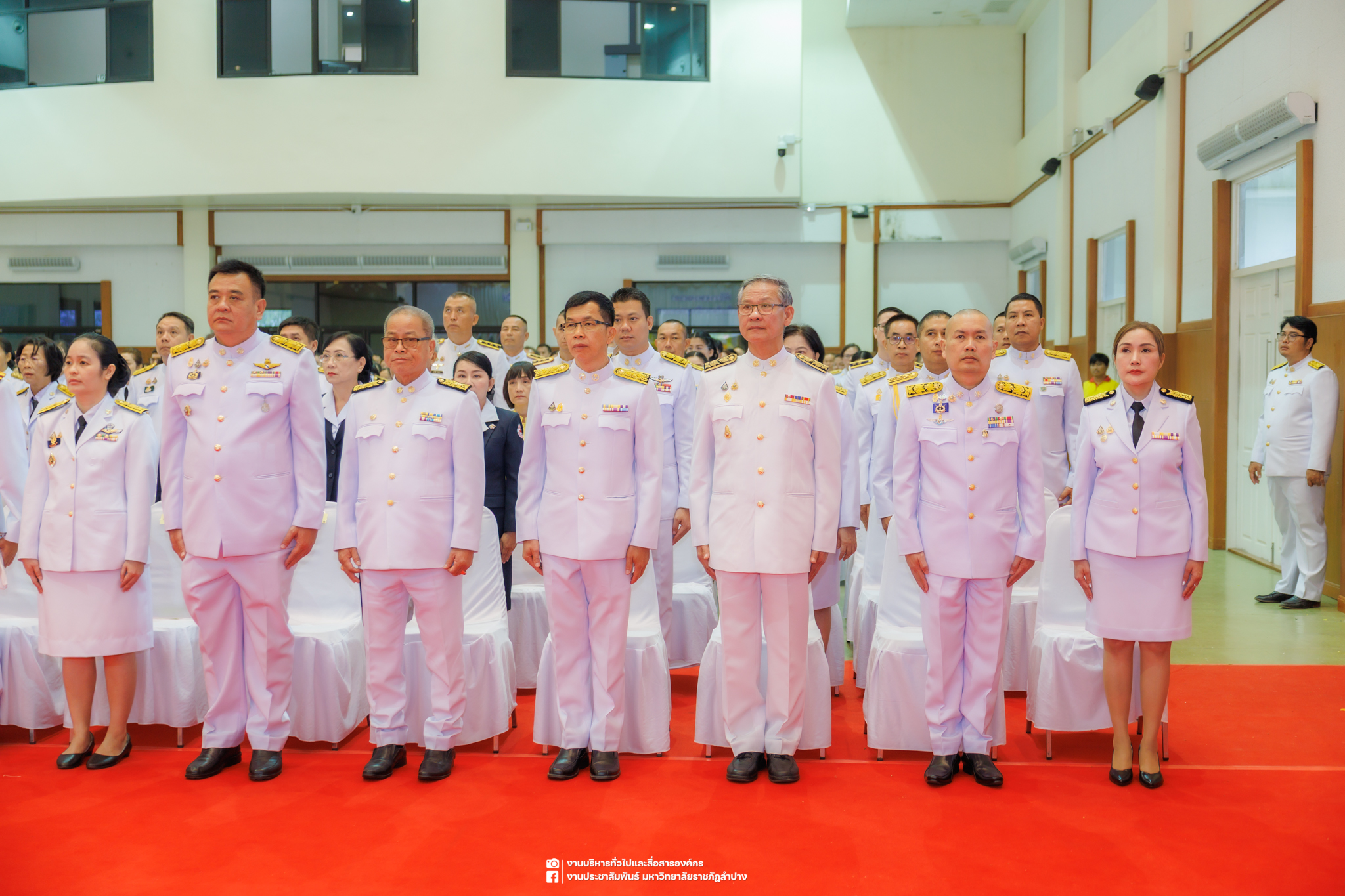 เมื่อวันที่ 13 ตุลาคม 2568 รศ.ดร.ปริเยศ สิทธิสรวง รองอธิการบดีฝ่ายบริหาร มหาวิทยาลัยราชภัฏลำปาง พร้อมด้วย อ.ดร.เยาวลักษณ์ งามแสนโรจน์ รองผู้อำนวยการสำนักศิลปะและวัฒนธรรม นางสาวธิดารัตน์ ไชยยาสืบ รักษาการหัวหน้าสำนักงานผู้อำนวยการสำนักศิลปะและวัฒนธรรม นายอาทิตย์ สุปินะ นักวิชาการศึกษา นางสาวพักตร์ชนก ริยาคำ เจ้าหน้าที่บริหารงานทั่วไป นางสาวปานฤทัย ไชยรังษี นักวิชาการศึกษา สังกัดสำนักศิลปะและวัฒนธรรม นางสาวหอมนวล ศรีริ นักประชาสัมพันธ์ นายชนาธิป เมืองมูล นักประชาสัมพันธ์ สังกัดงานบริหารทั่วไปและสื่อสารองค์กร กองกลาง สำนักงานอธิการบดี นางสาวนงเยาว์ ตะนะวงค์ เจ้าหน้าที่บริหารงานทั่วไป นางสาวบงกช สมรอบรู้ เจ้าหน้าที่บริหารงานทั่วไป นางสาวรวีพรรณ แนบสนิทธรรม นักวิชาการศึกษา นางณัฐกานต์ ห่อทอง นักวิชาการศึกษา และนายคฑาวุฒิ วังใจฟู นักวิชาการคอมพิวเตอร์ สังกัดกองบริการการศึกษา ร่วมพิธีสวดพระพุทธมนต์ ทำบุญตักบาตรถวายพระราชกุศล และพิธีวางพวงมาลาน้อมรำลึกในพระมหากรุณาธิคุณ เนื่องในวันคล้ายวันสวรรคต พระบาทสมเด็จพระบรมชนกาธิเบศร มหาภูมิพลอดุลยเดชมหาราช บรมนาถบพิตร “วันนวมินทรมหาราช” ณ หอประชุมจังหวัดลำปาง ศาลากลางจังหวัดลำปาง โดยมี นายวิบูนณ์ แววบัณฑิต ผู้ว่าราชการจังหวัดลำปาง เป็นประธานในพิธี พร้อมด้วยคณะผู้บริหาร หัวหน้าส่วนราชการ ข้าราชการ เจ้าหน้าที่ และประชาชนชาวจังหวัดลำปาง เข้าร่วมเพื่อร่วมกันแสดงความจงรักภักดี และน้อมรำลึกถึงพระมหากรุณาธิคุณอันหาที่สุดมิได้
