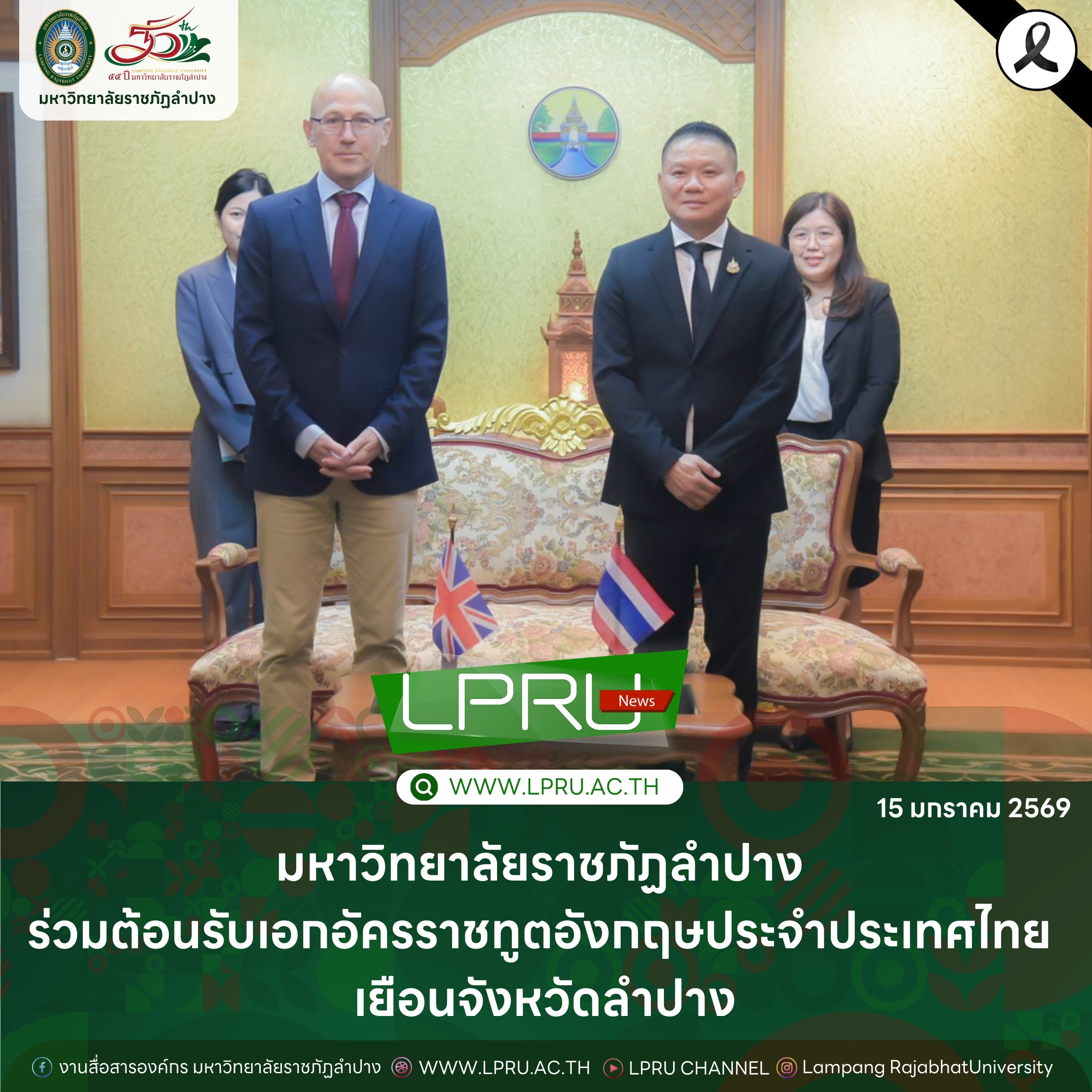 เมื่อวันที่ 15 มกราคม 2569 อาจารย์อัจฉริยา ครุธาโรจน์ ผู้ช่วยอธิการบดีด้านวิเทศสัมพันธ์ มหาวิทยาลัยราชภัฏลำปาง ร่วมให้การต้อนรับ นายมาร์ค กูดดิ้ง เอกอัครราชทูตอังกฤษประจำประเทศไทย พร้อมคณะ ในโอกาสเข้าเยี่ยมคารวะผู้ว่าราชการจังหวัดลำปาง เพื่อกระชับความสัมพันธ์และหารือแนวทางการขยายความร่วมมือด้านเศรษฐกิจและการท่องเที่ยว โดยมี นายวิวัฒน์ อินทร์ไทยวงศ์ ผู้ว่าราชการจังหวัดลำปาง เป็นประธานให้การต้อนรับ พร้อมด้วย พ.ต.อ.อัครินทร์ กาสา รองผู้บังคับการตำรวจภูธรจังหวัดลำปาง นางสาวสุดาทิพย์ มูลอ้าย หัวหน้าสำนักงานจังหวัดลำปาง ตลอดจนหัวหน้าส่วนราชการ หน่วยงานภาครัฐ และภาคเอกชน เข้าร่วม ณ ห้องรับรอง ชั้น 3 ศาลากลางจังหวัดลำปาง