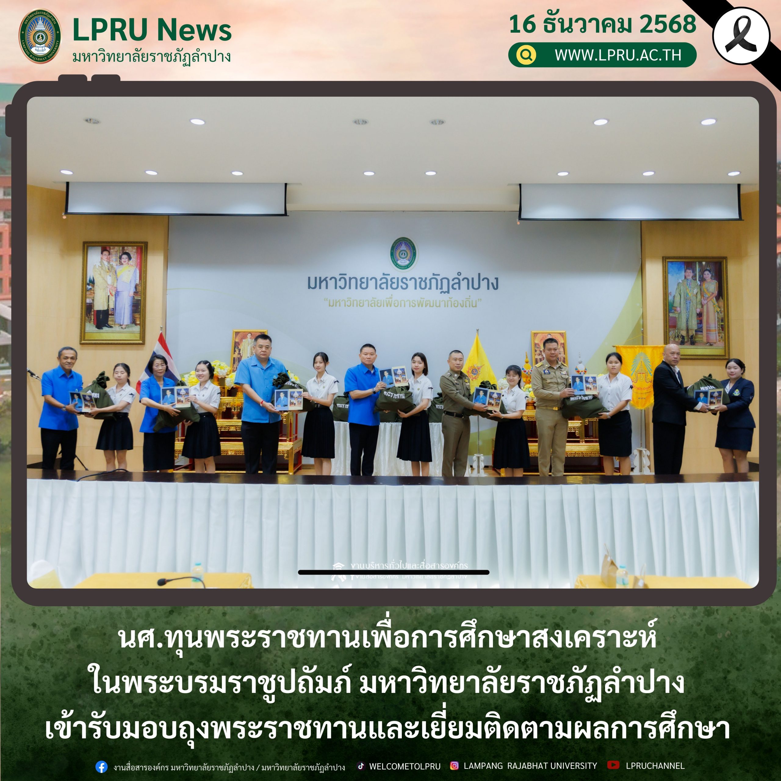 เมื่อวันที่ 16 ธันวาคม 2568 รศ.ปริตต์ สายสี รองอธิการบดีฝ่ายกิจการนักศึกษา มหาวิทยาลัยราชภัฏลำปาง นำนักศึกษามหาวิทยาลัยราชภัฏลำปางที่เป็นนักศึกษาทุนพระราชทานเพื่อการศึกษาสงเคราะห์ ในพระบรมราชูปถัมภ์ ของมูลนิธิราชประชานุเคราะห์ ในพระบรมราชูปถัมภ์ เข้ารับมอบถุงพระราชทานและเยี่ยมติดตามผลการศึกษาของนักเรียนทุนพระราชทานเพื่อการศึกษาสงเคราะห์ ในพระบรมราชูปถัมภ์ ของมูลนิธิราชประชานุเคราะห์ ในพระบรมราชูปถัมภ์ ณ ห้องประชุมโอฬารรมย์ชั้น 1 อาคารโอฬาร โรจน์หิรัญ มหาวิทยาลัยราชภัฏลำปาง โดยมี นายวิวัฒน์ อินทร์ไทยวงศ์ ผู้ว่าราชการจังหวัดลำปาง ในฐานะประธานกรรมการมูลนิธิราชประชานุเคราะห์ ในพระบรมราชูปถัมภ์ประจำจังหวัดลำปาง พร้อมด้วยคณะกรรมการและผู้ช่วยเหลือการศึกษาสงเคราะห์ เข้าร่วมมอบถุงพระราชทานแก่นักเรียนทุนพระราชทาน และเยี่ยมติดตามผลการศึกษาของนักเรียนฯ พร้อมทั้งให้โอวาทและแนะนำแนวทางการประพฤติตน