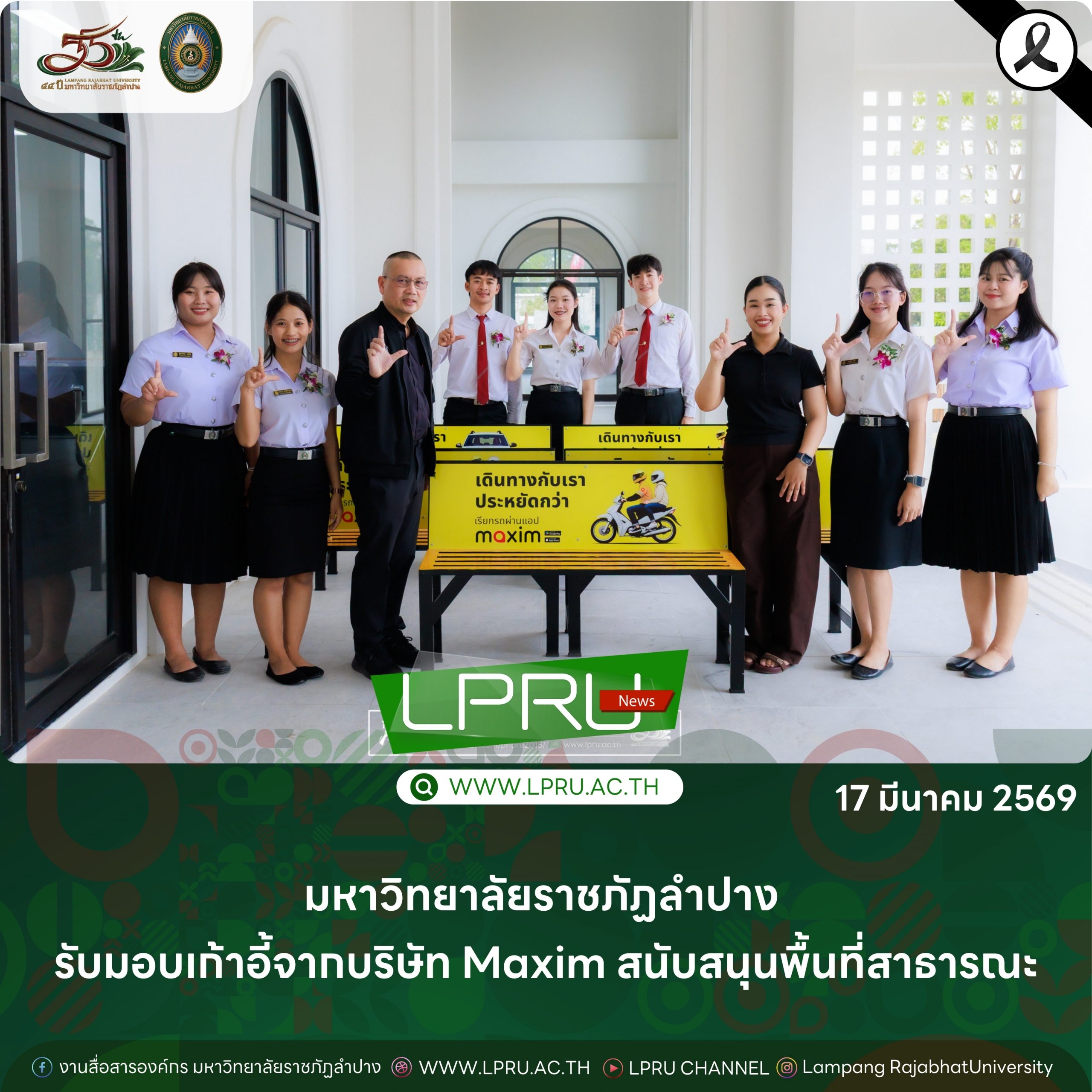 เมื่อวันที่ 17 มีนาคม 2569 รศ.ดร.ปริเยศ สิทธิสรวง รองอธิการบดีฝ่ายบริหาร มหาวิทยาลัยราชภัฏลำปาง เป็นผู้แทนมหาวิทยาลัย ฯ รับมอบเก้าอี้นั่งพักจากตัวแทนบริษัท Maxim ณ อาคารส่งเสริมสุขภาพ และการเรียนรู้ มหาวิทยาลัยราชภัฏลำปาง เพื่อใช้ประโยชน์ในพื้นที่สาธารณะของมหาวิทยาลัย ฯ การสนับสนุนในครั้งนี้มีวัตถุประสงค์เพื่ออำนวยความสะดวกให้แก่นักศึกษา บุคลากร และผู้มาใช้บริการภายในมหาวิทยาลัย โดยเก้าอี้ที่ได้รับมอบเป็นแบบแข็งแรง ทนทาน เหมาะสำหรับการใช้งานกลางแจ้ง พร้อมติดตั้งโลโก้ของบริษัทอย่างเหมาะสม ไม่รบกวนทัศนียภาพ และสามารถเคลื่อนย้ายไปติดตั้งในจุดต่าง ๆ ตามความเหมาะสม