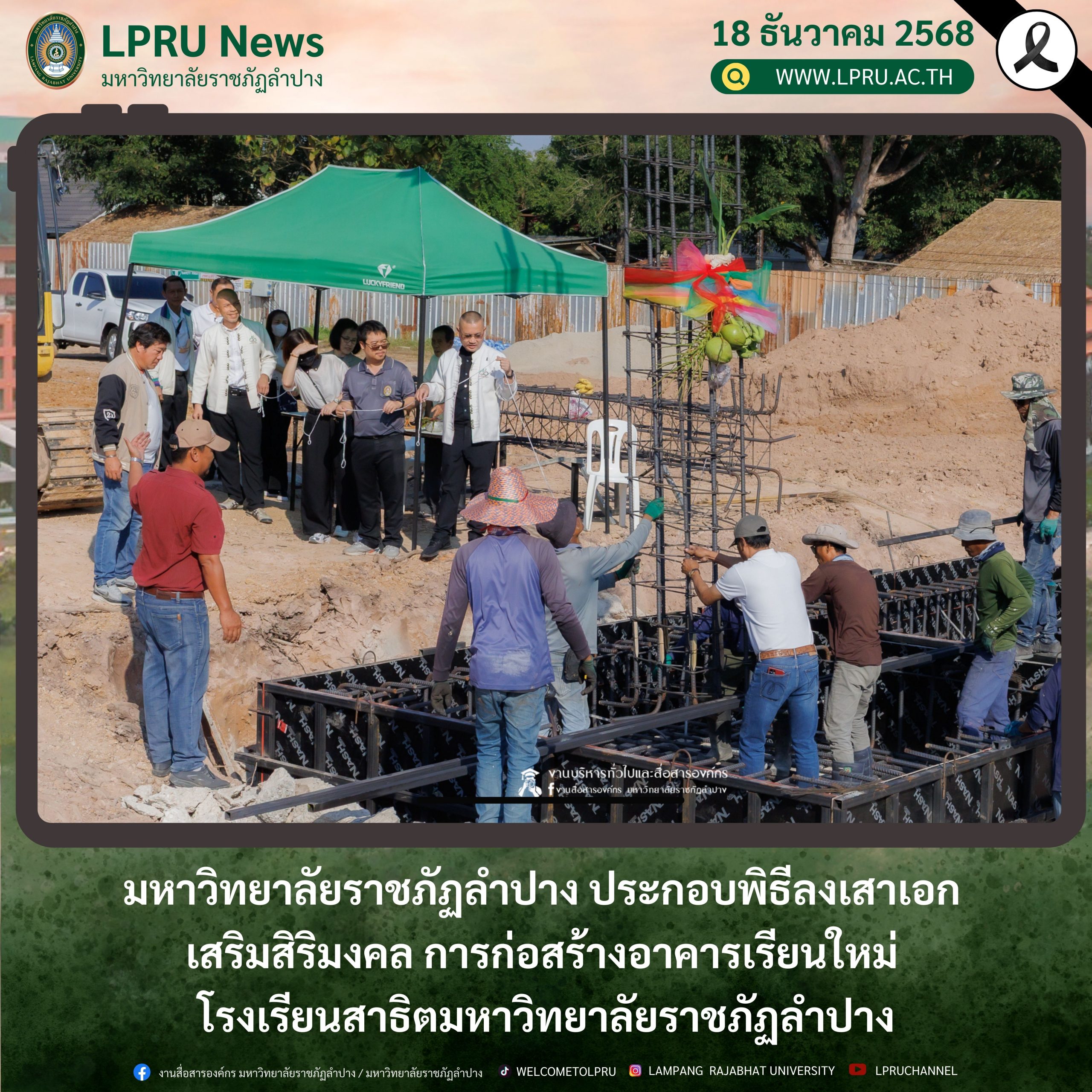 เมื่อวันที่ 18 ธันวาคม 2568 มหาวิทยาลัยราชภัฏลำปาง จัดพิธีลงเสาเอกตามประเพณีไทย เพื่อความเป็นสิริมงคลในการก่อสร้างอาคารเรียนหลังใหม่ของโรงเรียนสาธิตมหาวิทยาลัยราชภัฏลำปาง โดยมี รศ.ดร.ปริเยศ สิทธิสรวง รองอธิการบดีฝ่ายบริหาร เป็นประธานในพิธี พร้อมด้วย ผศ.เอกรัฐ อินต๊ะวงศา ผู้ช่วยศาสตราจารย์เอกรัฐ อินต๊ะวงศา ผู้ช่วยอธิการบดีด้านงานบริหารทั่วไป อ.ดร.พิมพ์ผกา อินทะรส รองผู้อำนวยการโรงเรียนสาธิตมหาวิทยาลัยราชภัฏลำปาง นายจุลทรรศน์ เยาวสกุลมาศ วิศวกรเครื่องกล ปฏิบัติการ ปฏิบัติหน้าที่หัวหน้างานอาคารสถานที่ กองกลาง สำนักงานอธิการบดี ตลอดจนผู้บริหารและบุคลากรของมหาวิทยาลัย เข้าร่วมพิธี
