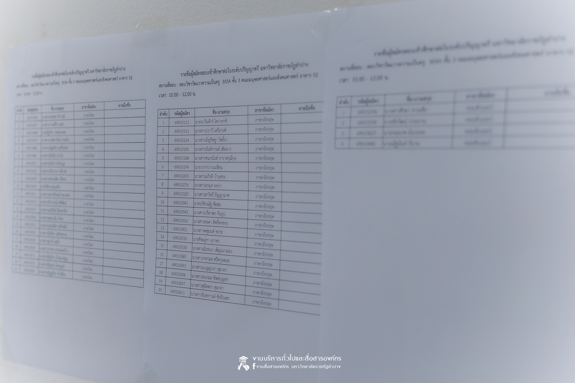 เมื่อวันที่ 22 พฤศจิกายน 2568 มหาวิทยาลัยราชภัฏลำปาง จัดการสอบคัดเลือกนักศึกษาเข้าศึกษาต่อในระดับปริญญาตรี 4 ปี ประจำปีการศึกษา 2569 รอบที่ 1 โดยมีผู้สมัครในรอบนี้ทั้งสิ้น 462 คน