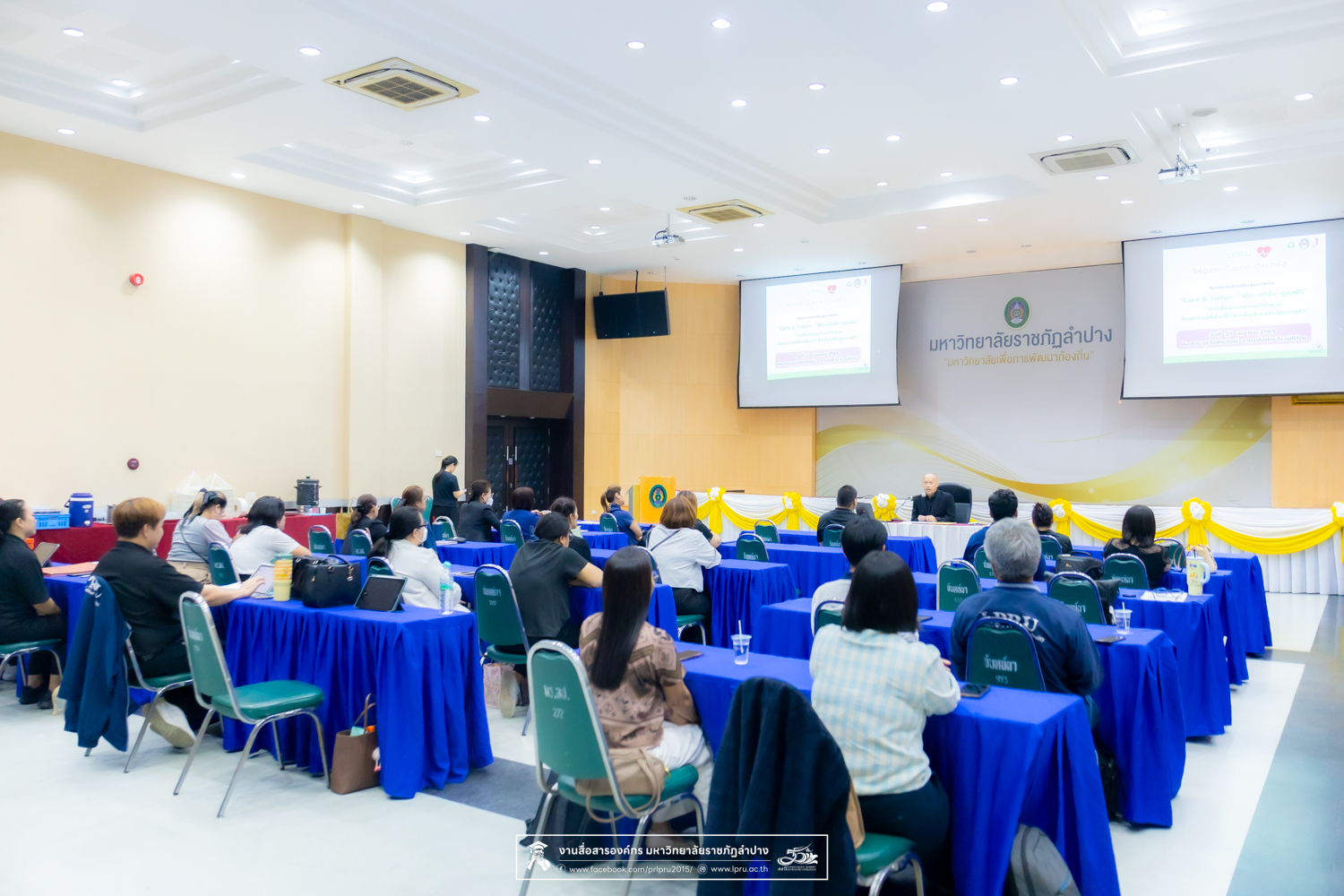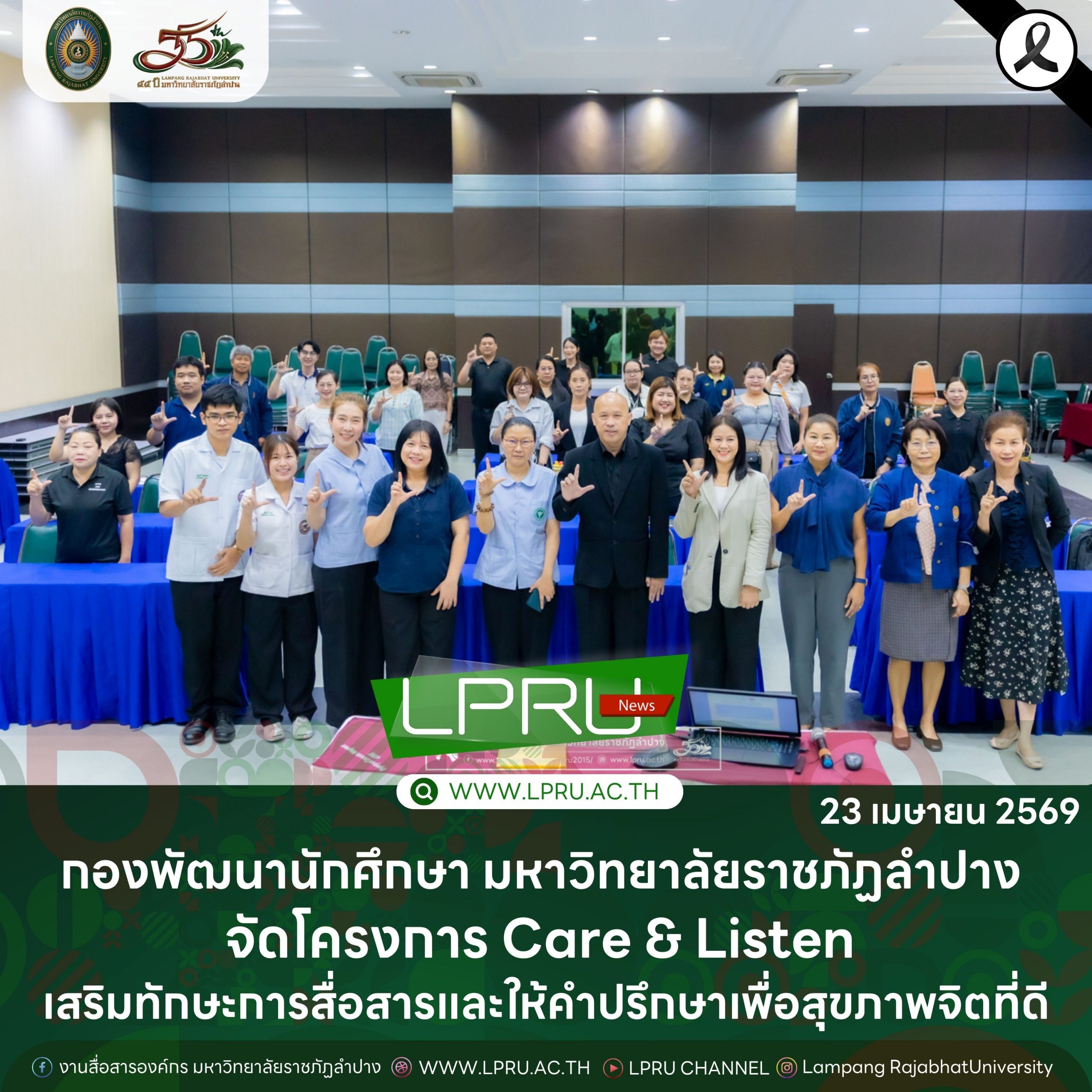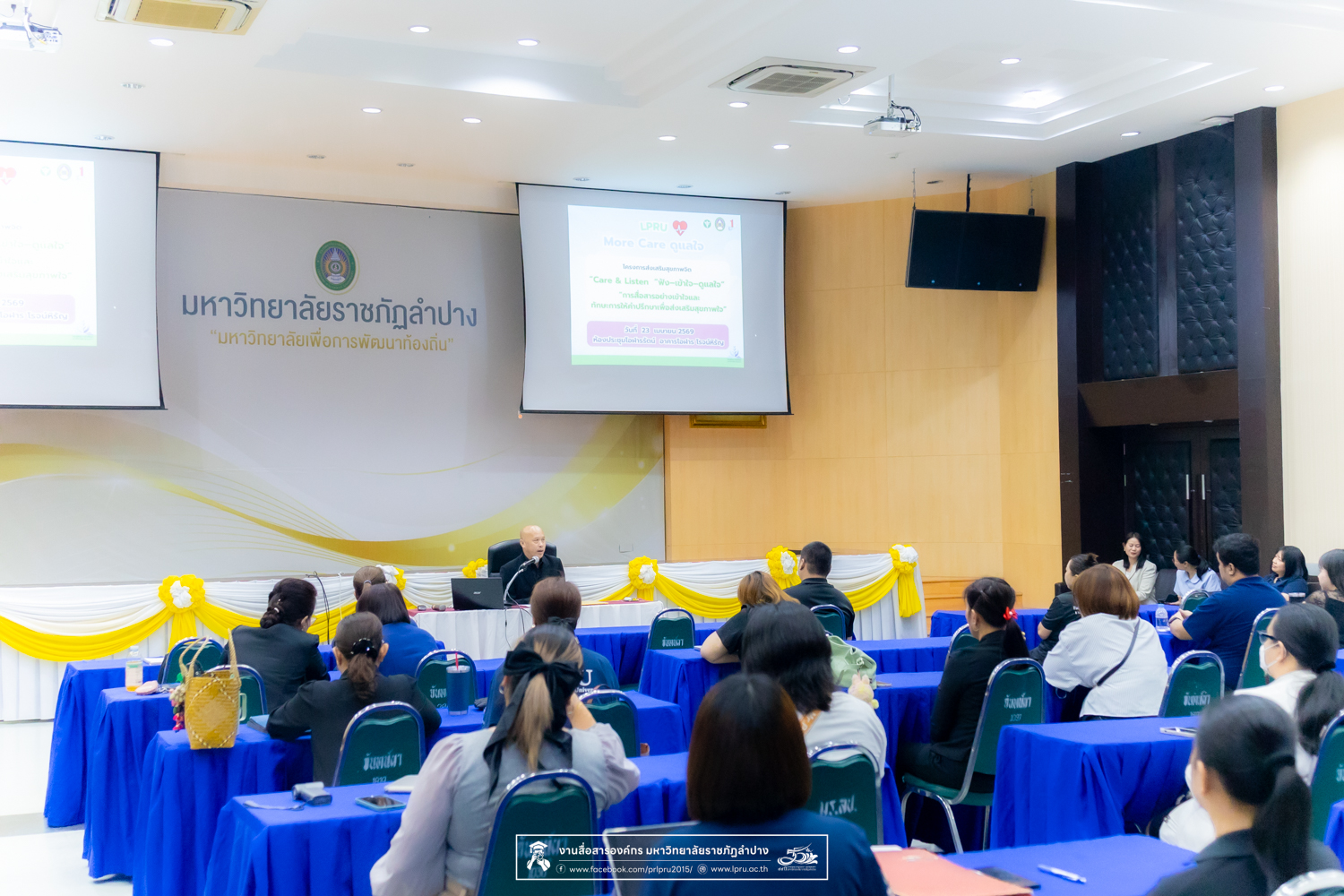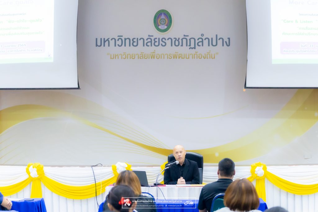 เมื่อวันที่ 23 เมษายน 2569 รศ.ปริตต์ สายสี รองอธิการบดีฝ่ายกิจการนักศึกษา มหาวิทยาลัยราชภัฏลำปาง เป็นประธานเปิดโครงการส่งเสริมสุขภาพจิต “การสื่อสารอย่างเข้าใจและทักษะการให้คำปรึกษาเพื่อส่งเสริมสุขภาพใจ” Care & Listen “ฟัง-เข้าใจ-ดูแลใจ” ณ ห้องประชุมโอฬารรัตน์ ชั้น 1 อาคารโอฬาร โรจน์หิรัญ มหาวิทยาลัยราชภัฏลำปาง โดยมีคณาจารย์และบุคลากรเข้าร่วมกว่า 40 คน