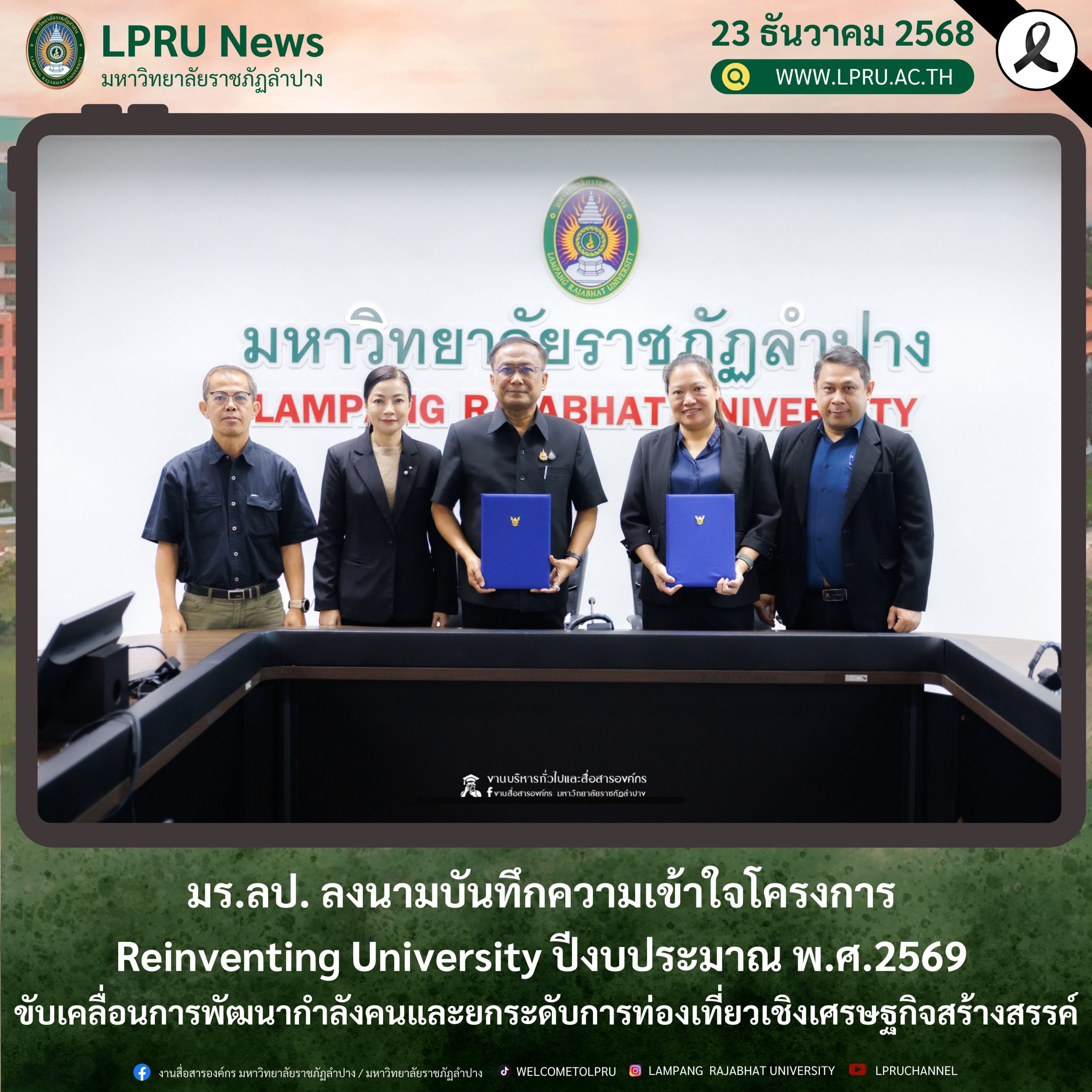 เมื่อวันที่ 23 ธันวาคม 2568 มหาวิทยาลัยราชภัฏลำปาง ได้ลงนามบันทึกความเข้าใจ (Memorandum of Understanding : MOU) โครงการพัฒนาความเป็นเลิศของสถาบันอุดมศึกษาและพัฒนากำลังคนขั้นสูง (Reinventing University) ประจำปีงบประมาณ พ.ศ. 2569 ร่วมกับสำนักงานปลัดกระทรวงการอุดมศึกษา วิทยาศาสตร์ วิจัยและนวัตกรรม (สป.อว.) โดย นายพันธุ์เพิ่มศักดิ์ อารุณี ผู้ช่วยปลัดกระทรวงการอุดมศึกษา วิทยาศาสตร์ วิจัยและนวัตกรรม ปฏิบัติราชการแทนปลัดกระทรวง ฯ กับ มหาวิทยาลัยราชภัฏลำปาง โดย รศ.ดร.กิตติศักดิ์ สมุทธารักษ์ อธิการบดีมหาวิทยาลัยราชภัฏลำปาง โดยมี ผศ.ณัฐนันท์ ฐิติยาปราโมทย์ ประธานหลักสูตรบริหารธุรกิจมหาบัณฑิตสาขาวิชาการบัญชี คณะวิทยาการจัดการ มหาวิทยาลัยราชภัฏลำปาง ลงนามเป็นพยาน ณ ห้องประชุมดอกปีบ ชั้น 2 อาคารสำนักงานอธิการบดีมหาวิทยาลัยราชภัฏลำปาง โดยบันทึกการลงนามดังกล่าวจะนำส่งให้กับทางสำนักงานปลัดกระทรวงการอุดมศึกษา วิทยาศาสตร์ วิจัยและนวัตกรรม (สป.อว.) เพื่อเซ็นลงนามในลำดับ ต่อไป